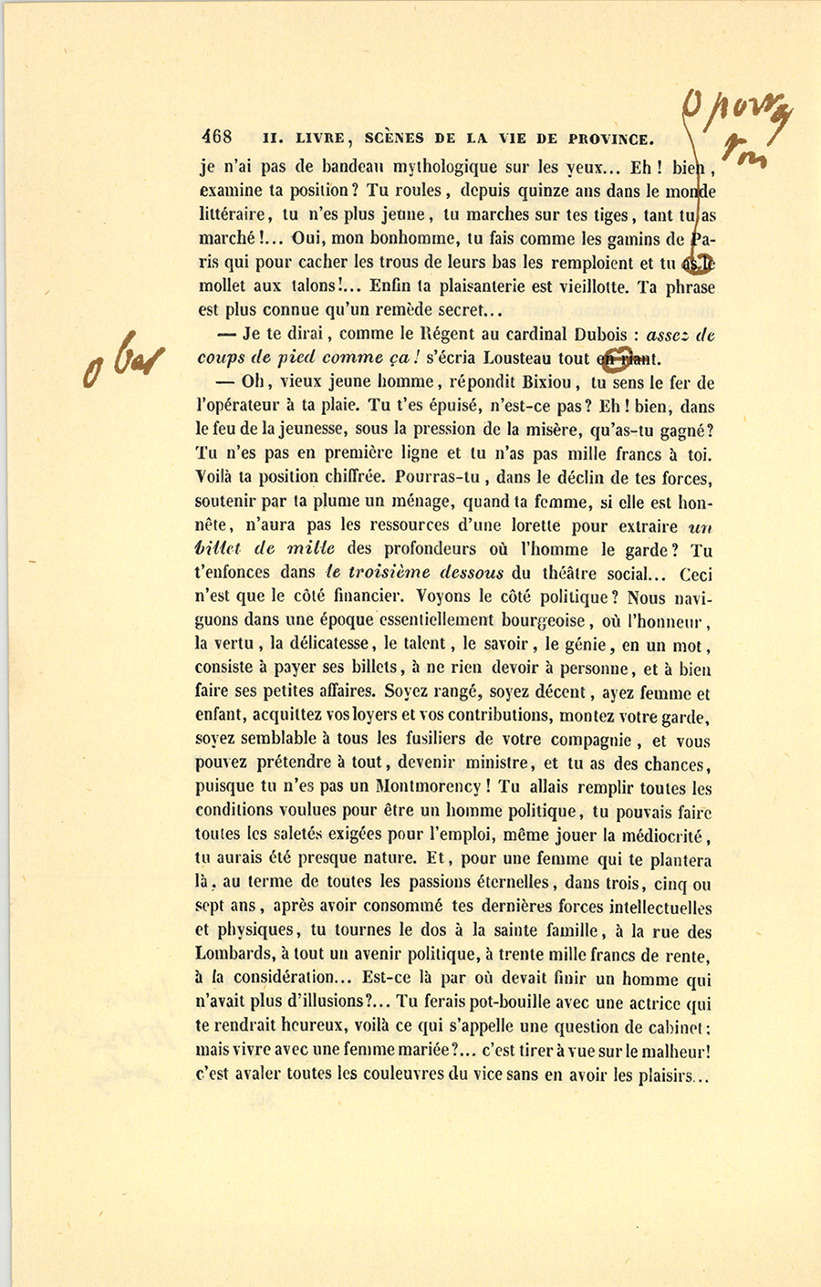 – Hé ! bien, monsieur, vous connaissez la situation de vos débiteurs, ils sont dans les bonnes grâces du Roi, mais ils sont sans argent, et obligés à une grande représentation… Vous n’ignorez pas les difficultés de la politique : l’aristocratie est à reconstruire, en présence d’un Tiers-État formidable. La pensée du Roi, que la France juge très-mal, est de créer dans la pairie une institution nationale, analogue à celle de l’Angleterre. Pour réaliser cette grande pensée, il nous faut des années et des millions… Noblesse oblige, le duc de Navarreins, qui, vous le savez, est Premier Gentilhomme de la Chambre, ne nie pas sa dette, mais il ne peut pas… (soyez raisonnable ? Jugez la politique ? Nous sortons de l’abîme des révolutions. Vous êtes noble aussi !) donc il ne peut pas vous payer…