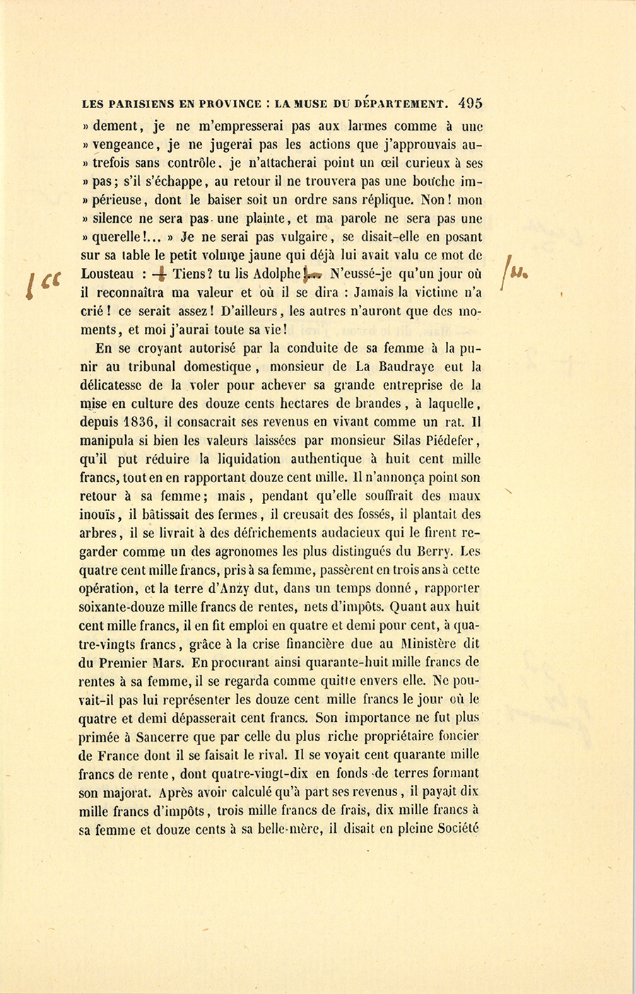 En se croyant autorisé par la conduite de sa femme à la punir au tribunal domestique, monsieur de La Baudraye eut la délicatesse de la voler pour achever sa grande entreprise de la mise en culture des douze cents hectares de brandes, à laquelle, depuis 1836, il consacrait ses revenus en vivant comme un rat. Il manipula si bien les valeurs laissées par monsieur Silas Piédefer, qu’il put réduire la liquidation authentique à huit cent mille francs, tout en en rapportant douze cent mille. Il n’annonça point son retour à sa femme ; mais, pendant qu’elle souffrait des maux inouïs, il bâtissait des fermes, il creusait des fossés, il plantait des arbres, il se livrait à des défrichements audacieux qui le firent regarder comme un des agronomes les plus distingués du Berry. Les quatre cent mille francs, pris à sa femme, passèrent en trois ans à cette opération, et la terre d’Anzy dut, dans un temps donné, rapporter soixante-douze mille francs de rentes, nets d’impôts. Quant aux huit cent mille francs, il en fit emploi en quatre et demi pour cent, à quatre-vingts francs, grâce à la crise financière due au Ministère dit du Premier Mars. En procurant ainsi quarante-huit mille francs de rentes à sa femme, il se regarda comme quitte envers elle. Ne pouvait-il pas lui représenter les douze cent mille francs le jour où le quatre et demi dépasserait cent francs27 ? Son importance ne fut plus primée à Sancerre que par celle du plus riche propriétaire foncier de France dont il se faisait le rival. Il se voyait cent quarante mille francs de rente, dont quatre-vingt-dix en fonds de terres formant son majorat. Après avoir calculé qu’à part ses revenus, il payait dix mille francs d’impôts, trois mille francs de frais, dix mille francs à sa femme et douze cents à sa belle-mère, il disait en pleine Société {p. 496} Littéraire : – On prétend que je suis un avare, que je ne dépense rien, ma dépense monte encore à vingt-six mille cinq cents francs par an. Et je vais avoir à payer l’éducation de mes deux enfants ! ça ne fait peut-être pas plaisir aux Milaud de Nevers, mais la seconde maison de La Baudraye aura peut-être une carrière aussi belle que celle de la première. J’irai vraisemblablement à Paris, solliciter du Roi des Français le titre de comte (monsieur Roy est comte), cela fera plaisir à ma femme d’être appelée madame la comtesse. Cela fut dit d’un si beau sang-froid, que personne n’osa se moquer de ce petit homme. Le Président Boirouge seul lui répondit : – À votre place, je ne me croirais heureux que si j’avais une fille… – Mais, dit le baron, j’irai bientôt à Paris…