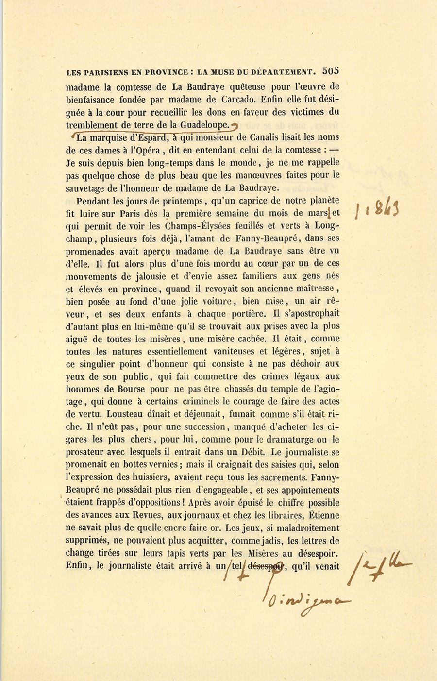 Néanmoins cette nouvelle dissipa la mélancolie de madame de La Baudraye qui se jeta dans la vie des femmes à la mode, elle voulut avoir du succès et elle en obtint ; mais elle faisait peu de progrès dans le monde des femmes, elle éprouvait des difficultés à s’y introduire. Au mois de mars, les prêtres amis de madame Piédefer et l’Avocat-Général frappèrent un grand coup en faisant nommer {p. 505} madame la comtesse de La Baudraye quêteuse pour l’œuvre de bienfaisance fondée par madame de Carcado. Enfin elle fut désignée à la cour pour recueillir les dons en faveur des victimes du tremblement de terre de la Guadeloupe. La marquise d’Espard, à qui monsieur de Canalis lisait les noms de ces dames à l’Opéra, dit en entendant celui de la comtesse : – Je suis depuis bien long-temps dans le monde, je ne me rappelle pas quelque chose de plus beau que les manœuvres faites pour le sauvetage de l’honneur de madame de La Baudraye.