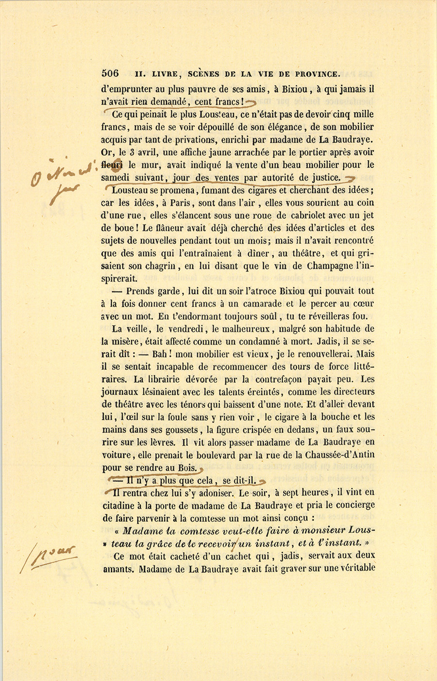 Pendant les jours de printemps, qu’un caprice de notre planète fit luire sur Paris dès la première semaine du mois de mars 1843 et qui permit de voir les Champs-Élysées feuillés et verts à Longchamp, plusieurs fois déjà, l’amant de Fanny-Beaupré, dans ses promenades avait aperçu madame de La Baudraye sans être vu d’elle. Il fut alors plus d’une fois mordu au cœur par un de ces mouvements de jalousie et d’envie assez familiers aux gens nés et élevés en province, quand il revoyait son ancienne maîtresse, bien posée au fond d’une jolie voiture, bien mise, un air rêveur, et ses deux enfants à chaque portière. Il s’apostrophait d’autant plus en lui-même qu’il se trouvait aux prises avec la plus aiguë de toutes les misères, une misère cachée. Il était, comme toutes les natures essentiellement vaniteuses et légères, sujet à ce singulier point d’honneur qui consiste à ne pas déchoir aux yeux de son public, qui fait commettre des crimes légaux aux hommes de Bourse pour ne pas être chassés du temple de l’agiotage, qui donne à certains criminels le courage de faire des actes de vertu. Lousteau dînait et déjeunait, fumait comme s’il était riche. Il n’eût pas, pour une succession, manqué d’acheter les cigares les plus chers, pour lui, comme pour le dramaturge ou le prosateur avec lesquels il entrait dans un Débit. Le journaliste se promenait en bottes vernies ; mais il craignait des saisies qui, selon l’expression des huissiers, avaient reçu tous les sacrements. Fanny Beaupré ne possédait plus rien d’engageable, et ses appointements étaient frappés d’oppositions ! Après avoir épuisé le chiffre possible des avances aux Revues, aux journaux et chez les libraires, Étienne ne savait plus de quelle encre faire or. Les jeux, si maladroitement supprimés, ne pouvaient plus acquitter, comme jadis, les lettres de change tirées sur leurs tapis verts par les Misères au désespoir. Enfin, le journaliste était arrivé à une telle indigence, qu’il venait {p. 506} d’emprunter au plus pauvre de ses amis, à Bixiou, à qui jamais il n’avait rien demandé, cent francs ! Ce qui peinait le plus Lousteau, ce n’était pas de devoir cinq mille francs, mais de se voir dépouillé de son élégance, de son mobilier acquis par tant de privations, enrichi par madame de La Baudraye. Or, le 3 avril, une affiche jaune arrachée par le portier après avoir étincelé sur le mur, avait indiqué la vente d’un beau mobilier pour le samedi suivant, jour des ventes par autorité de justice. Lousteau se promena, fumant des cigares et cherchant des idées ; car les idées, à Paris, sont dans l’air, elles vous sourient au coin d’une rue, elles s’élancent sous une roue de cabriolet avec un jet de boue ! Le flâneur avait déjà cherché des idées d’articles et des sujets de nouvelles pendant tout un mois ; mais il n’avait rencontré que des amis qui l’entraînaient à dîner, au théâtre, et qui grisaient son chagrin, en lui disant que le vin de Champagne l’inspirerait.