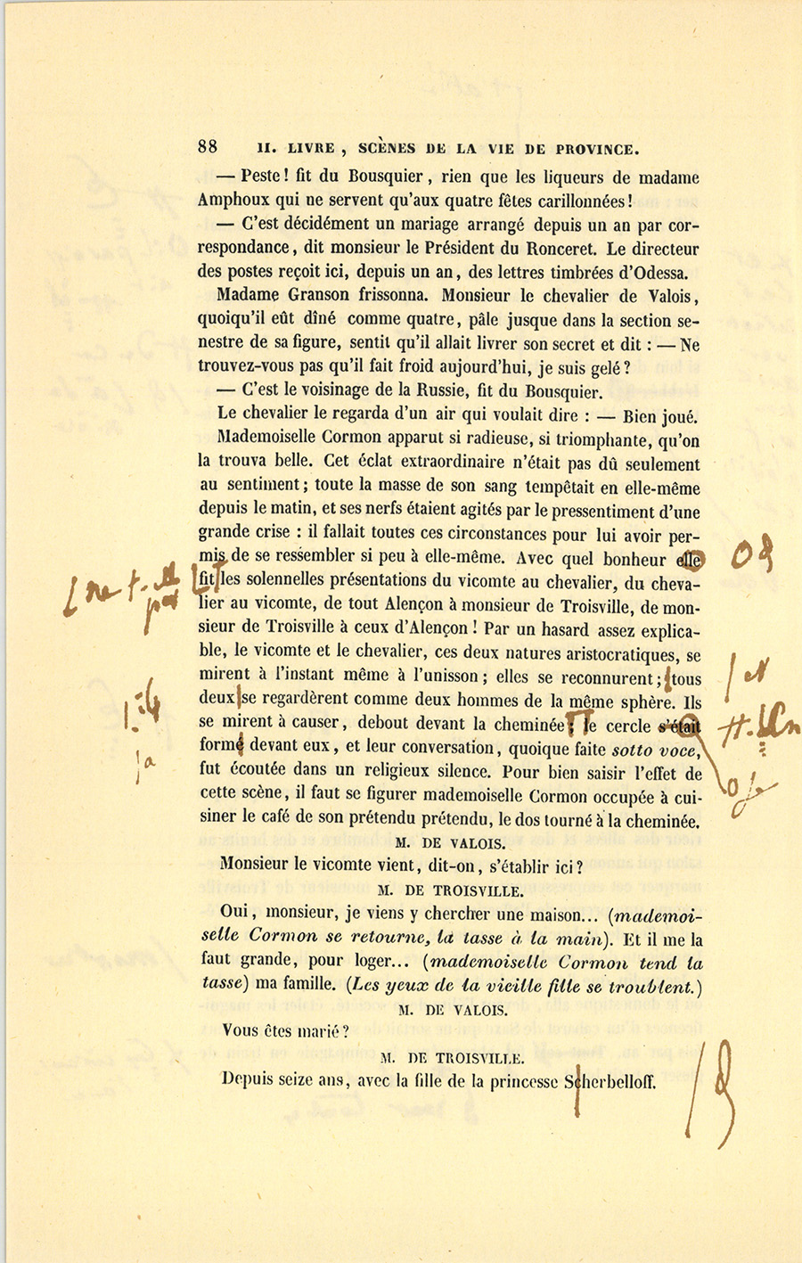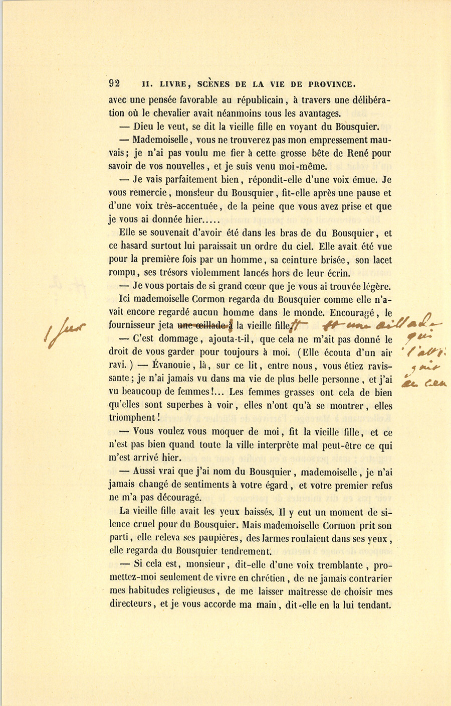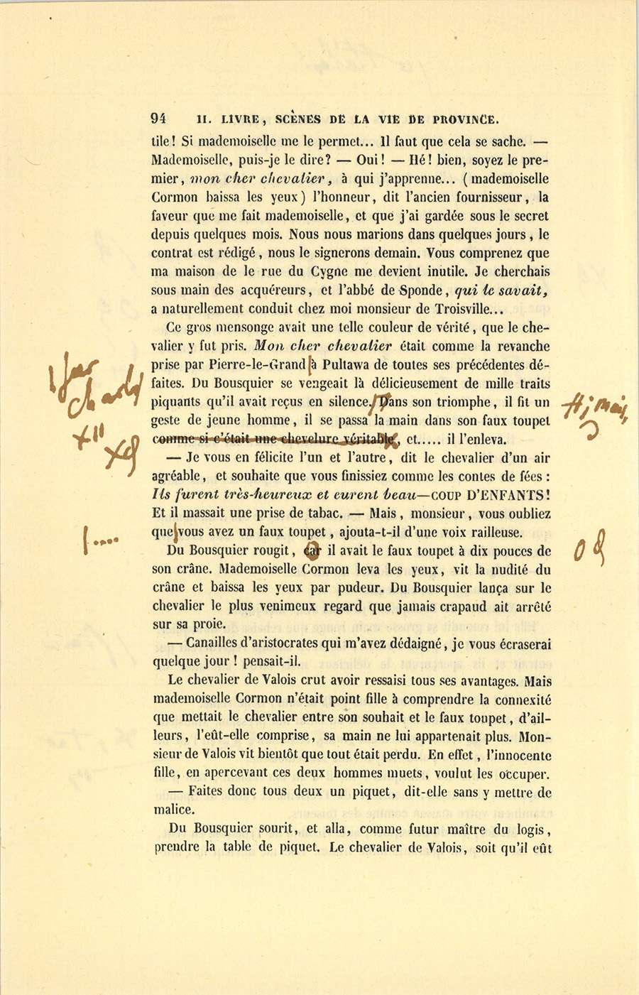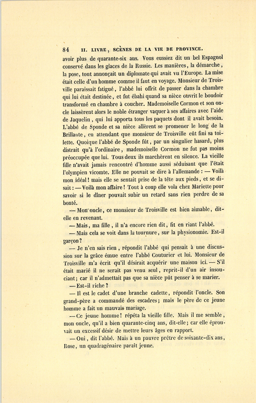 – Ma foi, dit du Bousquier, si le vicomte de Troisville en veut, elle est à lui pour quarante mille francs. Elle me devient fort {p. 94} inutile ! Si mademoiselle me le permet… Il faut que cela se sache. – Mademoiselle, puis-je le dire ? – Oui ! – Hé ! bien, soyez le premier, mon cher chevalier, à qui j’apprenne… (mademoiselle Cormon baissa les yeux) l’honneur, dit l’ancien fournisseur, la faveur que me fait mademoiselle, et que j’ai gardée sous le secret depuis quelques mois. Nous nous marions dans quelques jours, le contrat est rédigé, nous le signerons demain. Vous comprenez que ma maison de la19 rue du Cygne me devient inutile. Je cherchais sous main des acquéreurs, et l’abbé de Sponde, qui le savait, a naturellement conduit chez moi monsieur de Troisville…