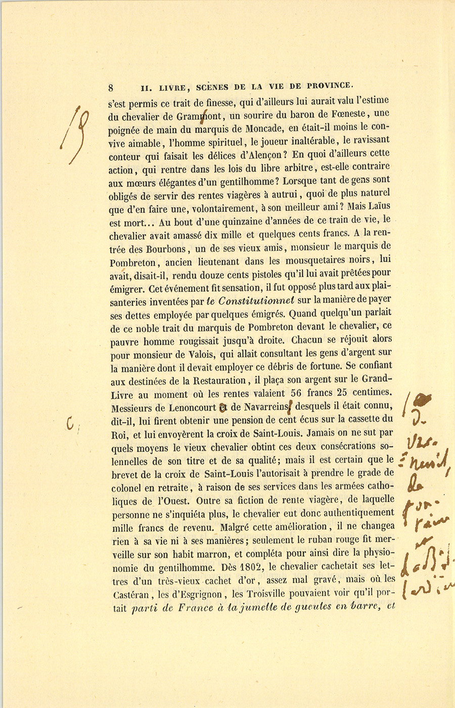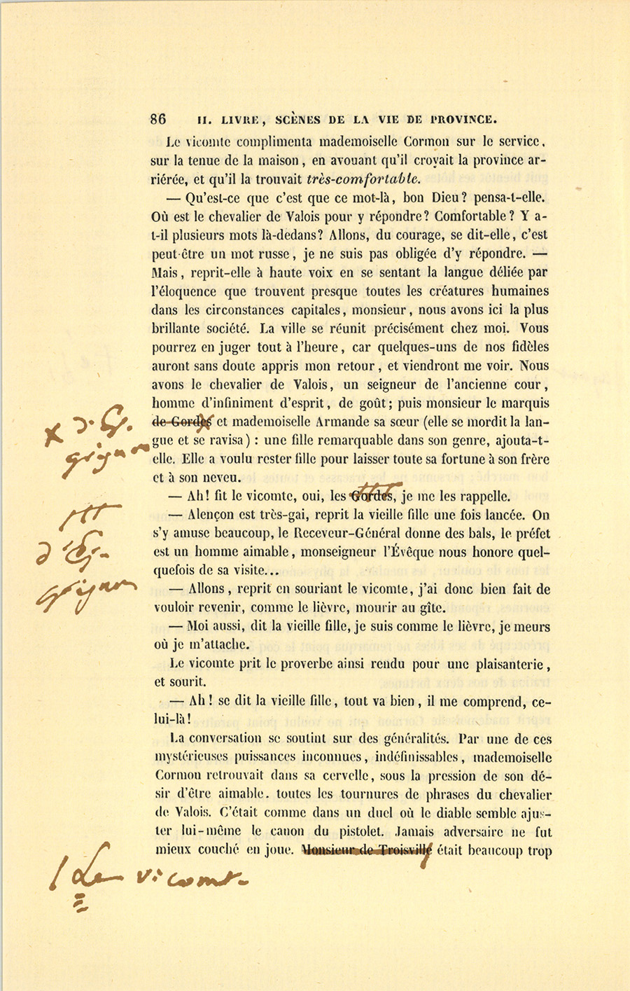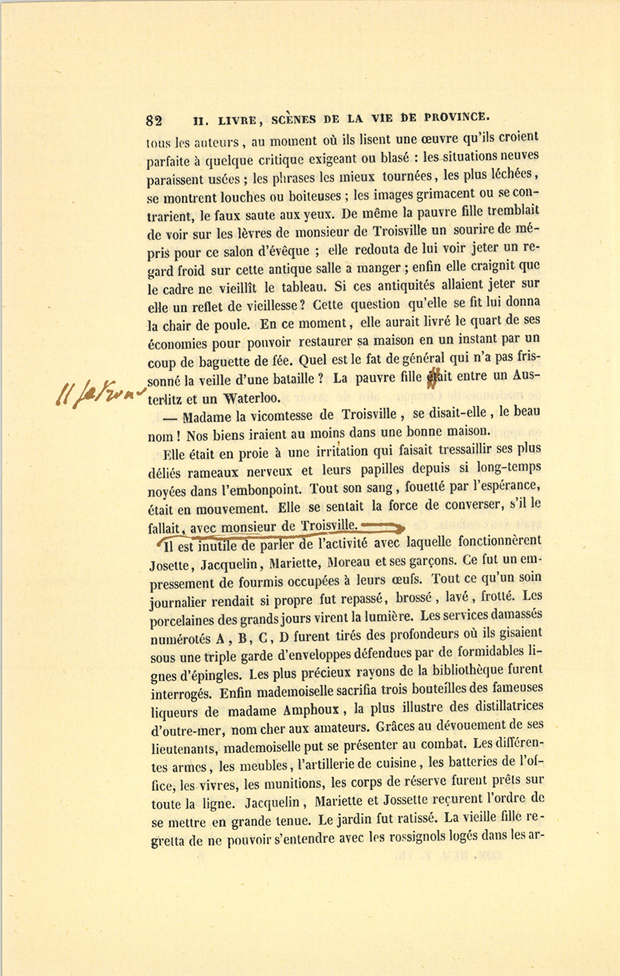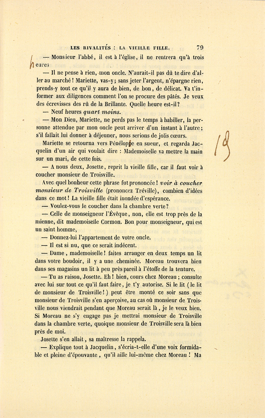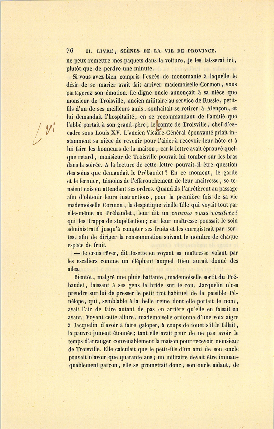 – Ma foi, dit du Bousquier, si le vicomte de Troisville en veut, elle est à lui pour quarante mille francs. Elle me devient fort {p. 94} inutile ! Si mademoiselle me le permet… Il faut que cela se sache. – Mademoiselle, puis-je le dire ? – Oui ! – Hé ! bien, soyez le premier, mon cher chevalier, à qui j’apprenne… (mademoiselle Cormon baissa les yeux) l’honneur, dit l’ancien fournisseur, la faveur que me fait mademoiselle, et que j’ai gardée sous le secret depuis quelques mois. Nous nous marions dans quelques jours, le contrat est rédigé, nous le signerons demain. Vous comprenez que ma maison de la19 rue du Cygne me devient inutile. Je cherchais sous main des acquéreurs, et l’abbé de Sponde, qui le savait, a naturellement conduit chez moi monsieur de Troisville…