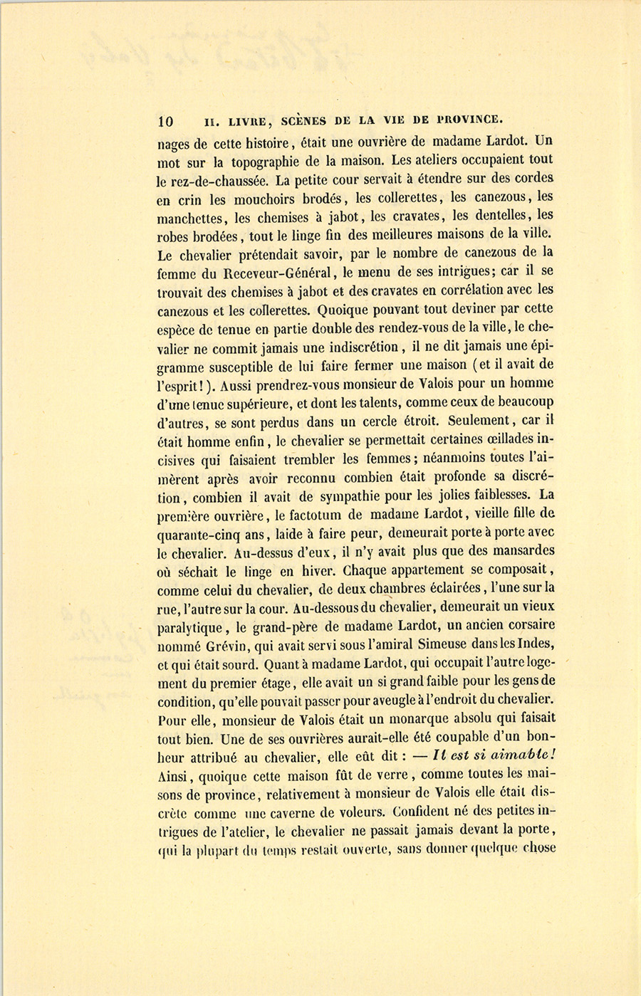 Cette charmante Suzanne, dont la comique aventure devait exercer une si grande influence sur la destinée des principaux {p. 10} personnages de cette histoire, était une ouvrière de madame Lardot. Un mot sur la topographie de la maison. Les ateliers occupaient tout le rez-de-chaussée. La petite cour servait à étendre sur des cordes en crin les mouchoirs brodés, les collerettes, les canezous, les manchettes, les chemises à jabot, les cravates, les dentelles, les robes brodées, tout le linge fin des meilleures maisons de la ville. Le chevalier prétendait savoir, par le nombre de canezous de la femme du Receveur-Général, le menu de ses intrigues ; car il se trouvait des chemises à jabot et des cravates en corrélation avec les canezous et les collerettes. Quoique pouvant tout deviner par cette espèce de tenue en partie double des rendez-vous de la ville, le chevalier ne commit jamais une indiscrétion, il ne dit jamais une épigramme susceptible de lui faire fermer une maison (et il avait de l’esprit !). Aussi prendrez-vous monsieur de Valois pour un homme d’une tenue supérieure, et dont les talents, comme ceux de beaucoup d’autres, se sont perdus dans un cercle étroit. Seulement, car il était homme enfin, le chevalier se permettait certaines œillades incisives qui faisaient trembler les femmes ; néanmoins toutes l’aimèrent après avoir reconnu combien était profonde sa discrétion, combien il avait de sympathie pour les jolies faiblesses. La première ouvrière, le factotum de madame Lardot, vieille fille de quarante-cinq ans, laide à faire peur, demeurait porte à porte avec le chevalier. Au-dessus d’eux, il n’y avait plus que des mansardes où séchait le linge en hiver. Chaque appartement se composait, comme celui du chevalier, de deux chambres éclairées, l’une sur la rue, l’autre sur la cour. Au-dessous du chevalier, demeurait un vieux paralytique, le grand-père de madame Lardot, un ancien corsaire nommé Grévin, qui avait servi sous l’amiral Simeuse dans les Indes, et qui était sourd. Quant à madame Lardot, qui occupait l’autre logement du premier étage, elle avait un si grand faible pour les gens de condition, qu’elle pouvait passer pour aveugle à l’endroit du chevalier. Pour elle, monsieur de Valois était un monarque absolu qui faisait tout bien. Une de ses ouvrières aurait-elle été coupable d’un bonheur attribué au chevalier, elle eût dit : – Il est si aimable ! Ainsi, quoique cette maison fût de verre, comme toutes les maisons de province, relativement à monsieur de Valois elle était discrète comme une caverne de voleurs. Confident né des petites intrigues de l’atelier, le chevalier ne passait jamais devant la porte, qui la plupart du temps restait ouverte, sans donner quelque chose {p. 11} à ses petites chattes : du chocolat, des bonbons, des rubans, des dentelles, une croix d’or, toutes sortes de mièvreries dont raffolent les grisettes. Aussi le bon chevalier était-il adoré de ces petites filles. Les femmes ont un instinct qui leur fait deviner les hommes qui les aiment par cela seulement qu’elles portent une jupe, qui sont heureux d’être près d’elles, et qui ne pensent jamais à demander sottement l’intérêt de leur galanterie. Les femmes ont sous ce rapport le flair du chien, qui dans une compagnie va droit à l’homme pour qui les bêtes sont sacrées. Le pauvre chevalier de Valois conservait, de sa première vie, le besoin de protection galante qui distinguait autrefois le grand seigneur. Toujours fidèle au système de la petite maison, il aimait à enrichir les femmes, les seuls êtres qui sachent bien recevoir parce qu’ils peuvent toujours rendre. N’est-il pas extraordinaire que, par un temps où les écoliers cherchent, au sortir du collége, à dénicher un symbole ou à trier des mythes, personne n’ait encore expliqué les filles du dix-huitième siècle ? N’était-ce pas le tournoi du quinzième siècle ? En 1550, les chevaliers se battaient pour les dames ; en 1750, ils montraient leurs maîtresses à Longchamps ; aujourd’hui, ils font courir leurs chevaux ; à toutes les époques, le gentilhomme a tâché de se créer une façon de vivre qui ne fût qu’à lui. Les souliers à la poulaine du quatorzième siècle étaient les talons rouges du dix-huitième, et le luxe des maîtresses était en 1750 une ostentation semblable à celle des sentiments de la Chevalerie-Errante. Mais le chevalier ne pouvait plus se ruiner pour une maîtresse ! Au lieu de bonbons enveloppés de billets de caisse, il offrait galamment un sac de pures croquignoles. Disons-le à la gloire d’Alençon, ces croquignoles étaient acceptées plus joyeusement que la Duthé ne reçut jadis une toilette en vermeil ou quelque équipage du comte d’Artois. Toutes ces grisettes avaient compris la majesté déchue du chevalier de Valois, et lui gardaient un profond secret sur leurs familiarités intérieures. Les questionnait-on en ville dans quelques maisons sur le chevalier de Valois, elles parlaient gravement du gentilhomme, elles le vieillissaient ; il devenait un respectable monsieur de qui la vie était une fleur de sainteté ; mais, au logis, elles lui auraient monté sur les épaules comme des perroquets. Il aimait à savoir les secrets que découvrent les blanchisseuses au sein des ménages, elles venaient donc le matin lui raconter les cancans d’Alençon ; il les appelait ses gazettes en cotillon, ses feuilletons vivants : jamais {p. 12} monsieur de Sartines n’eut d’espions si intelligents, ni moins chers, et qui eussent conservé autant d’honneur en déployant autant de friponnerie dans l’esprit. Notez que, pendant son déjeuner, le chevalier s’amusait comme un bienheureux.