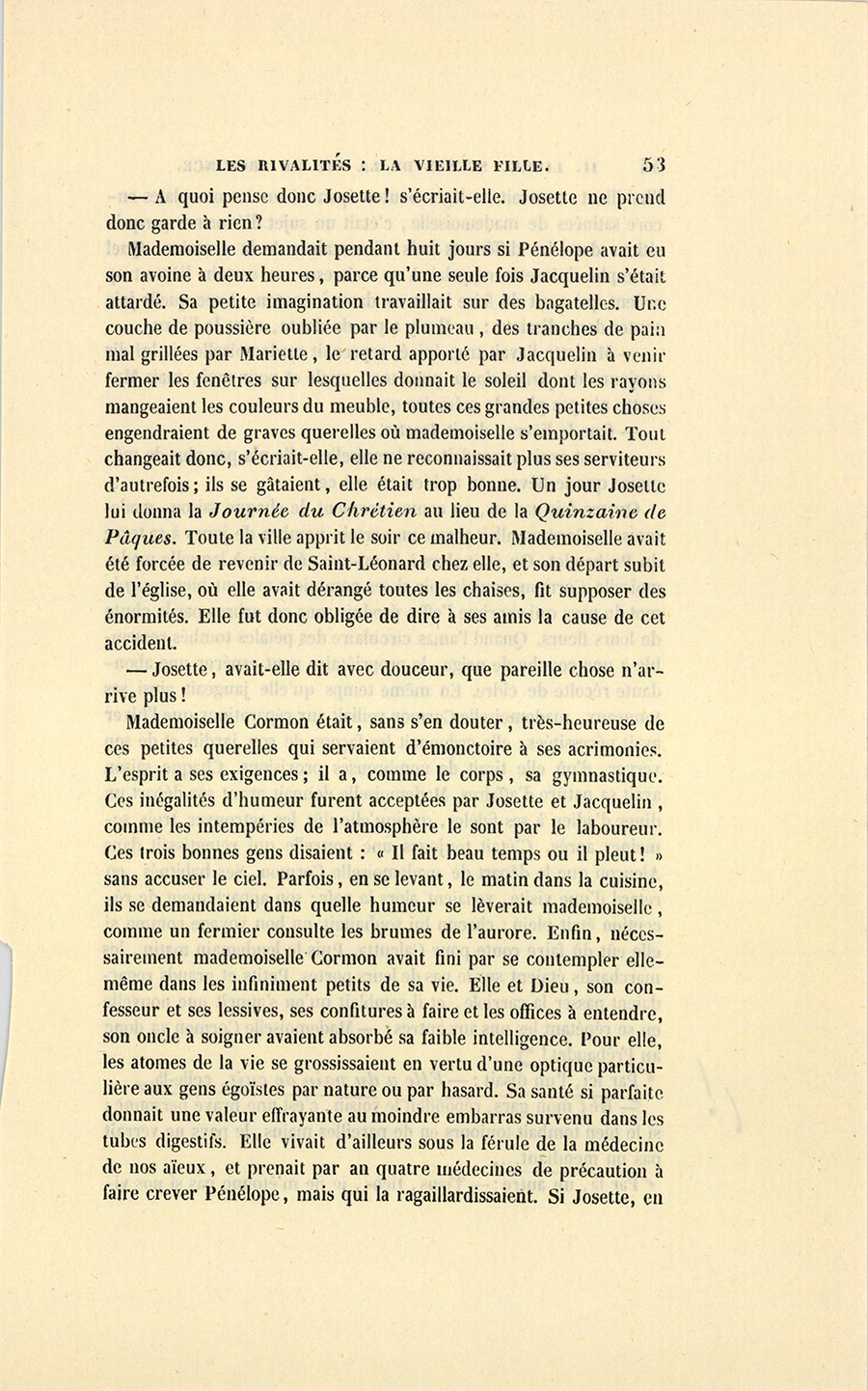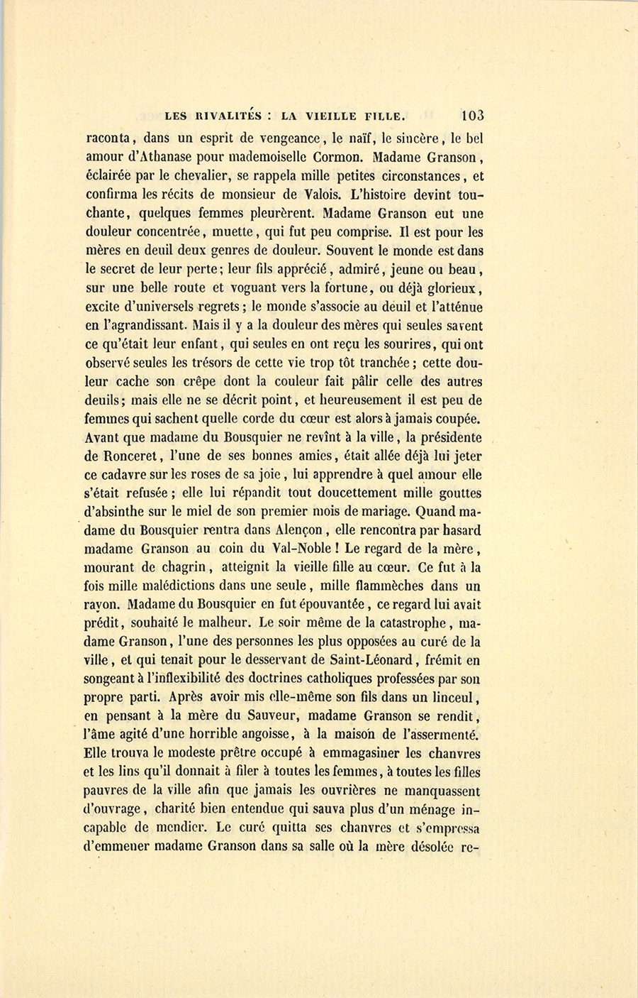 Mal jugée par le monde, qui commença par lui donner tort, la chrétienne trouva, dans son intérieur, une ample carrière à déployer ses vertus. Elle vécut dans les larmes et ne cessa d’offrir au monde un visage placide. Pour une âme pieuse, n’était-ce pas un crime que cette pensée qui lui becqueta toujours le cœur : J’aimais le chevalier de Valois, et je suis la femme de du Bousquier ! L’amour d’Athanase se dressait aussi sous la forme d’un remords et la poursuivait dans ses rêves. La mort de son oncle, dont les chagrins avaient éclaté, lui rendit son avenir encore plus douloureux, car elle pensa toujours aux souffrances que son oncle dut éprouver en voyant le {p. 114} changement des doctrines politiques et religieuses de la maison Cormon. Souvent le malheur tombe avec la rapidité de la foudre, comme chez madame Granson ; mais il s’étendit, chez la vieille fille, comme une goutte d’huile qui ne quitte l’étoffe qu’après l’avoir lentement imbibée.