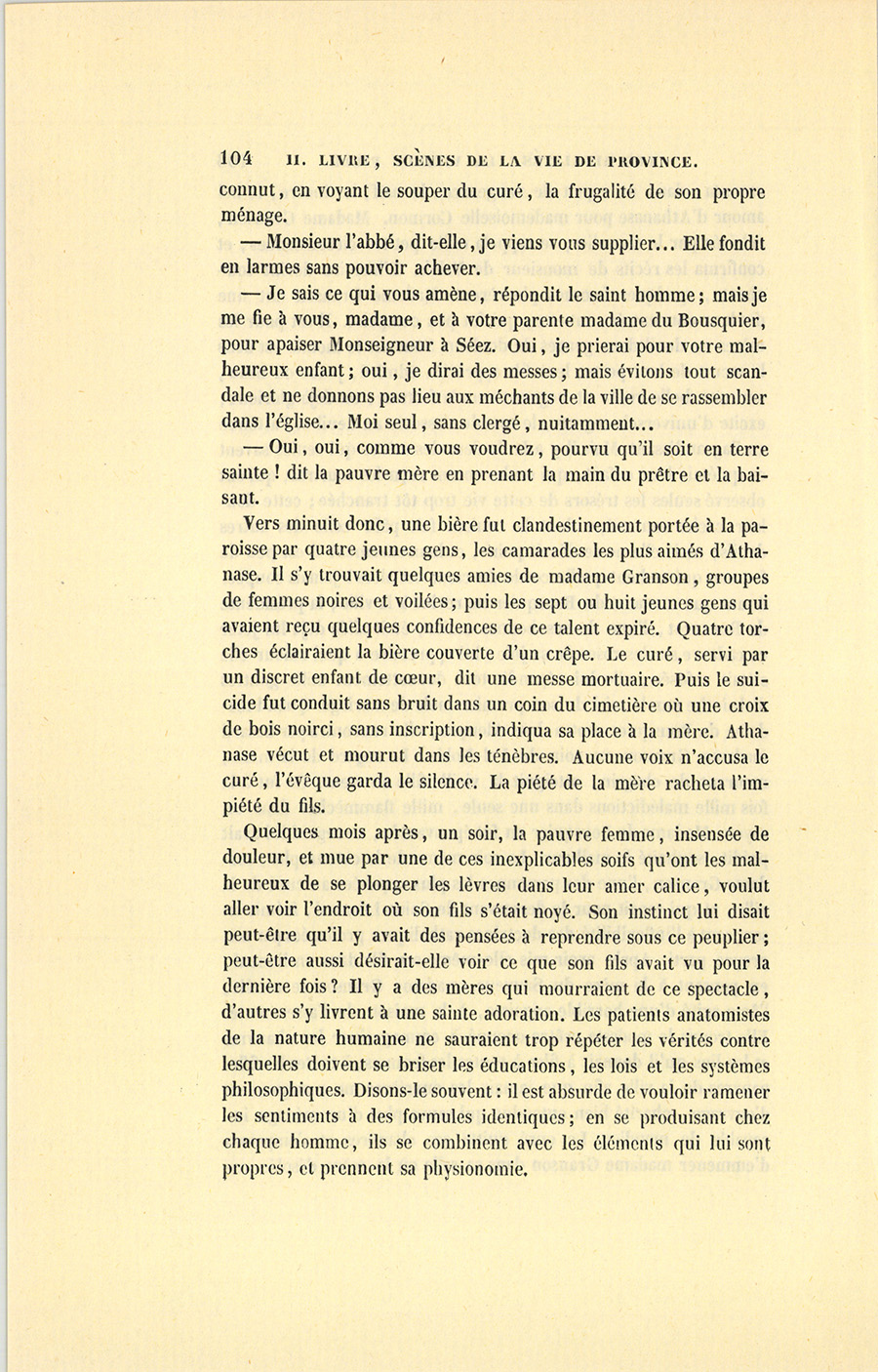 La Sarthe avait eu dans la matinée précédente une crue prévue par les pêcheurs. Ces crues d’eaux-troubles amènent des anguilles entraînées de leurs ruisseaux. Or, un pêcheur avait tendu ses engins dans l’endroit où s’était jeté le pauvre Athanase en croyant qu’on ne le retrouverait jamais. Vers six heures du matin, le pêcheur ramena ce jeune corps. Les deux ou trois amies qu’avait la pauvre veuve employèrent mille précautions pour la préparer à recevoir cette horrible dépouille. La nouvelle de ce suicide eut, comme on le pense bien, un grand retentissement dans Alençon. La veille, le pauvre homme de génie n’avait pas un seul protecteur ; le lendemain de sa mort, mille voix s’écrièrent : – « Je l’aurais si bien aidé, moi ! » Il est si commode de se poser charitable gratis. Ce suicide fut expliqué par le chevalier de Valois. Le gentilhomme {p. 103} raconta, dans un esprit de vengeance, le naïf, le sincère, le bel amour d’Athanase pour mademoiselle Cormon. Madame Granson, éclairée par le chevalier, se rappela mille petites circonstances, et confirma les récits de monsieur de Valois. L’histoire devint touchante, quelques femmes pleurèrent. Madame Granson eut une douleur concentrée, muette, qui fut peu comprise. Il est pour les mères en deuil deux genres de douleur. Souvent le monde est dans le secret de leur perte ; leur fils apprécié, admiré, jeune ou beau, sur une belle route et voguant vers la fortune, ou déjà glorieux, excite d’universels regrets ; le monde s’associe au deuil et l’atténue en l’agrandissant. Mais il y a la douleur des mères qui seules savent ce qu’était leur enfant, qui seules en ont reçu les sourires, qui ont observé seules les trésors de cette vie trop tôt tranchée ; cette douleur cache son crêpe dont la couleur fait pâlir celle des autres deuils ; mais elle ne se décrit point, et heureusement il est peu de femmes qui sachent quelle corde du cœur est alors à jamais coupée. Avant que madame du Bousquier ne revînt à la ville, la présidente du Ronceret20, l’une de ses bonnes amies, était allée déjà lui jeter ce cadavre sur les roses de sa joie, lui apprendre à quel amour elle s’était refusée ; elle lui répandit tout doucettement mille gouttes d’absinthe sur le miel de son premier mois de mariage. Quand madame du Bousquier rentra dans Alençon, elle rencontra par hasard madame Granson au coin du Val-Noble ! Le regard de la mère, mourant de chagrin, atteignit la vieille fille au cœur. Ce fut à la fois mille malédictions dans une seule, mille flammèches dans un rayon. Madame du Bousquier en fut épouvantée, ce regard lui avait prédit, souhaité le malheur. Le soir même de la catastrophe, madame Granson, l’une des personnes les plus opposées au curé de la ville, et qui tenait pour le desservant de Saint-Léonard, frémit en songeant à l’inflexibilité des doctrines catholiques professées par son propre parti. Après avoir mis elle-même son fils dans un linceul, en pensant à la mère du Sauveur, madame Granson se rendit, l’âme agitée21 d’une horrible angoisse, à la maison de l’assermenté. Elle trouva le modeste prêtre occupé à emmagasiner les chanvres et les lins qu’il donnait à filer à toutes les femmes, à toutes les filles pauvres de la ville afin que jamais les ouvrières ne manquassent d’ouvrage, charité bien entendue qui sauva plus d’un ménage incapable de mendier. Le curé quitta ses chanvres et s’empressa d’emmener madame Granson dans sa salle où la mère désolée {p. 104} reconnut, en voyant le souper du curé, la frugalité de son propre ménage.