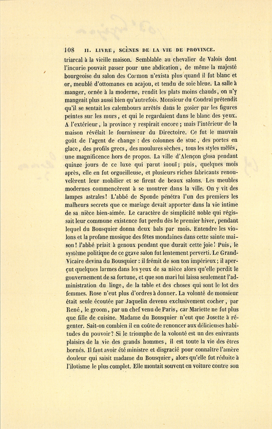 Cette restauration ôta tout son lustre, sa bonhomie, son air {p. 108} patriarcal à la vieille maison. Semblable au chevalier de Valois dont l’incurie pouvait passer pour une abdication, de même la majesté bourgeoise du salon des Cormon n’exista plus quand il fut blanc et or, meublé d’ottomanes en acajou, et tendu de soie bleue. La salle à manger, ornée à la moderne, rendit les plats moins chauds, on n’y mangeait plus aussi bien qu’autrefois. Monsieur du Coudrai prétendit qu’il se sentait les calembours arrêtés dans le gosier par les figures peintes sur les murs, et qui le regardaient dans le blanc des yeux. À l’extérieur, la province y respirait encore ; mais l’intérieur de la maison révélait le fournisseur du Directoire. Ce fut le mauvais goût de l’agent de change : des colonnes de stuc, des portes en glace, des profils grecs, des moulures sèches, tous les styles mêlés, une magnificence hors de propos. La ville d’Alençon glosa pendant quinze jours de ce luxe qui parut inouï ; puis, quelques mois après, elle en fut orgueilleuse, et plusieurs riches fabricants renouvelèrent leur mobilier et se firent de beaux salons. Les meubles modernes commencèrent à se montrer dans la ville. On y vit des lampes astrales ! L’abbé de Sponde pénétra l’un des premiers les malheurs secrets que ce mariage devait apporter dans la vie intime de sa nièce bien-aimée. Le caractère de simplicité noble qui régissait leur commune existence fut perdu dès le premier hiver, pendant lequel du Bousquier donna deux bals par mois. Entendre les violons et la profane musique des fêtes mondaines dans cette sainte maison ! l’abbé priait à genoux pendant que durait cette joie ! Puis, le système politique de ce grave salon fut lentement perverti. Le Grand-Vicaire devina du Bousquier : il frémit de son ton impérieux ; il aperçut quelques larmes dans les yeux de sa nièce alors qu’elle perdit le gouvernement de sa fortune, et que son mari lui laissa seulement l’administration du linge, de la table et des choses qui sont le lot des femmes. Rose n’eut plus d’ordres à donner. La volonté de monsieur était seule écoutée par Jacquelin24 devenu exclusivement cocher, par René, le groom, par un chef venu de Paris, car Mariette ne fut plus que fille de cuisine. Madame du Bousquier n’eut que Josette à régenter. Sait-on combien il en coûte de renoncer aux délicieuses habitudes du pouvoir ? Si le triomphe de la volonté est un des enivrants plaisirs de la vie des grands hommes, il est toute la vie des êtres bornés. Il faut avoir été ministre et disgracié pour connaître l’amère douleur qui saisit madame du Bousquier, alors qu’elle fut réduite à l’ilotisme le plus complet. Elle montait souvent en voiture contre son {p. 109} gré, elle voyait des gens qui ne lui convenaient pas ; elle n’avait plus le maniement de son cher argent, elle qui s’était vue libre de dépenser ce qu’elle voulait et qui alors ne dépensait rien. Toute limite imposée n’inspire-t-elle pas le désir d’aller au delà ? Les souffrances les plus vives ne viennent-elles pas du libre arbitre contrarié ? Ces commencements furent des roses. Chaque concession faite à l’autorité maritale fut alors conseillée par l’amour de la pauvre fille pour son époux. Du Bousquier se comporta d’abord admirablement pour sa femme ; il fut excellent, il lui donna des raisons valables à chaque nouvel empiétement. Cette chambre, si long-temps déserte, entendit le soir la voix des deux époux au coin du feu. Aussi, pendant les deux premières années de son mariage, madame du Bousquier se montra-t-elle très-satisfaite. Elle avait ce petit air délibéré, finaud qui distingue les jeunes femmes après un mariage d’amour. Le sang ne la tourmentait plus. Cette contenance dérouta les rieurs, démentit les bruits qui couraient sur du Bousquier et déconcerta les observateurs du cœur humain. Rose-Marie-Victoire craignait tant, en déplaisant à son époux, en le heurtant, de le désaffectionner, d’être privée de sa compagnie, qu’elle lui aurait sacrifié tout, même son oncle. Les petites joies niaises de madame du Bousquier trompèrent le pauvre abbé de Sponde, qui supporta mieux ses souffrances personnelles en pensant que sa nièce était heureuse. Alençon pensa d’abord comme l’abbé. Mais il y avait un homme plus difficile à tromper que toute la ville ! Le chevalier de Valois, réfugié sur le mont sacré de la haute aristocratie, passait sa vie chez les d’Esgrignon ; il écoutait les médisances et les caquetages, il pensait nuit et jour à ne pas mourir sans vengeance. Il avait abattu l’homme aux calembours, il voulait atteindre du Bousquier au cœur. Le pauvre abbé comprit les lâchetés du premier et dernier amour de sa nièce, il frémit en devinant la nature hypocrite de son neveu, et ses manœuvres perfides. Quoique du Bousquier se contraignît en pensant à la succession de son oncle, et ne voulût lui causer aucun chagrin, il lui porta un dernier coup qui le mit au tombeau. Si vous voulez expliquer le mot intolérance par le mot fermeté de principes, si vous ne voulez pas condamner dans l’âme catholique de l’ancien Grand-Vicaire le stoïcisme que Walter Scott vous fait admirer dans l’âme puritaine du père de Jeanie Deans, si vous voulez reconnaître dans l’Église romaine le potiùs mori quàm fœdari que vous admirez dans l’opinion {p. 110} républicaine, vous comprendrez la douleur qui saisit le grand abbé de Sponde alors qu’il vit dans le salon de son neveu le prêtre apostat, renégat, relaps, hérétique, l’ennemi de l’Église, le curé fauteur du serment constitutionnel. Du Bousquier, dont la secrète ambition était de régenter le pays, voulut, pour premier gage de son pouvoir, réconcilier le desservant de Saint-Léonard avec le curé de la paroisse, et il atteignit à son but. Sa femme cru