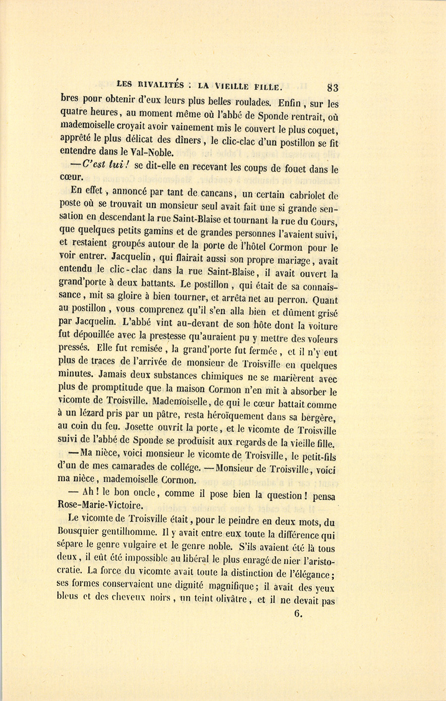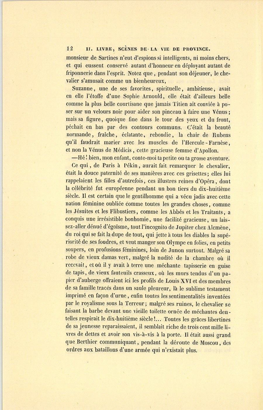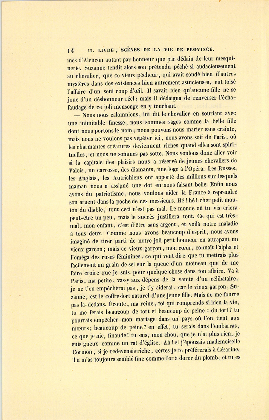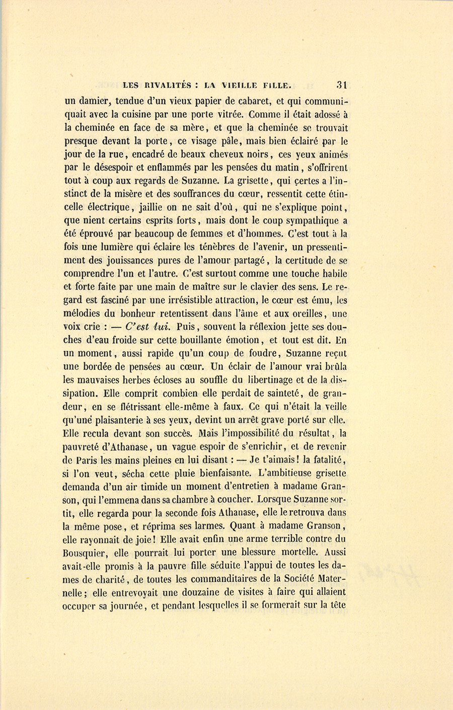 {p. 33} Maintenant il est nécessaire d’entrer chez cette vieille fille vers laquelle tant d’intérêts convergeaient, et chez qui les acteurs de cette scène devaient se rencontrer tous le soir même, à l’exception de Suzanne. Cette grande et belle personne assez hardie pour brûler ses vaisseaux, comme Alexandre, au début de la vie, et pour commencer la lutte par une faute mensongère, disparut du théâtre après y avoir introduit un violent élément d’intérêt. Ses vœux furent d’ailleurs comblés. Elle quitta sa ville natale quelques jours après, munie d’argent et de belles nippes, parmi lesquelles se trouvait une superbe robe de reps vert et un délicieux chapeau vert doublé de rose que lui donna monsieur de Valois, présent qu’elle préférait à tout, même à l’argent des dames de la Société Maternelle. Si le chevalier fût venu à Paris au moment où elle y brillait, elle eût certes tout quitté pour lui. Semblable à la chaste Suzanne de la Bible, que les vieillards avaient à peine entrevue, elle s’établissait heureuse et pleine d’espoir à Paris, pendant que tout Alençon déplorait ses malheurs pour lesquels les dames des deux Sociétés de Charité et de Maternité manifestèrent une vive sympathie. Si Suzanne peut offrir une image de ces belles normandes qu’un savant médecin a comprises pour un tiers dans la consommation que fait en ce genre le monstrueux Paris, elle resta dans les régions les plus élevées et les plus décentes de la galanterie. Par une époque où, comme le disait monsieur de Valois, la Femme n’existait plus, elle fut seulement madame du Valnoble ; autrefois elle eût été la rivale des Rhodope, des Impéria, des Ninon. Un des écrivains les plus distingués de la Restauration l’a prise sous sa protection ; peut-être l’épousera-t-il ? il est journaliste, et partant au-dessus de l’opinion, puisqu’il en fabrique une nouvelle tous les six ans.