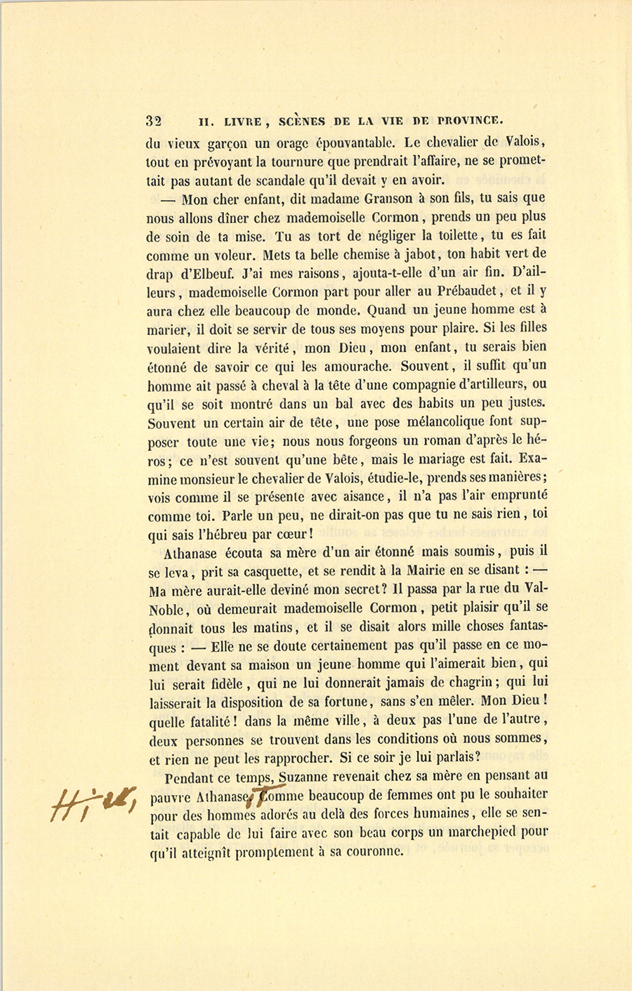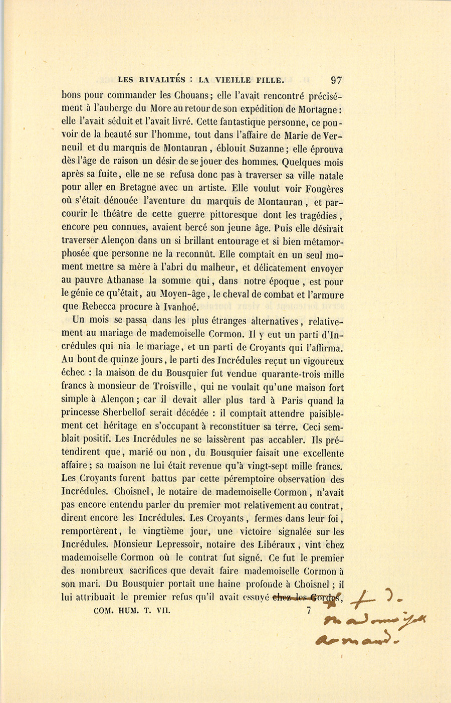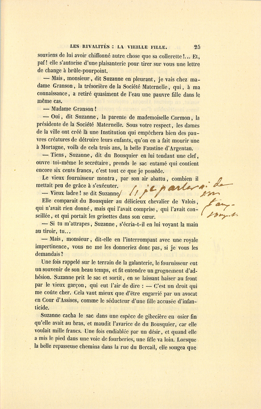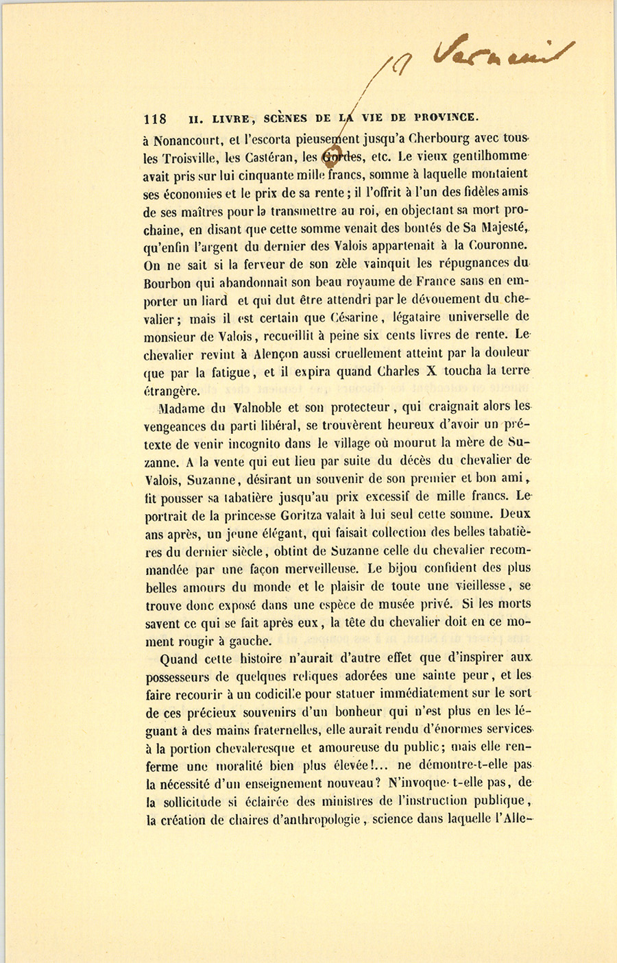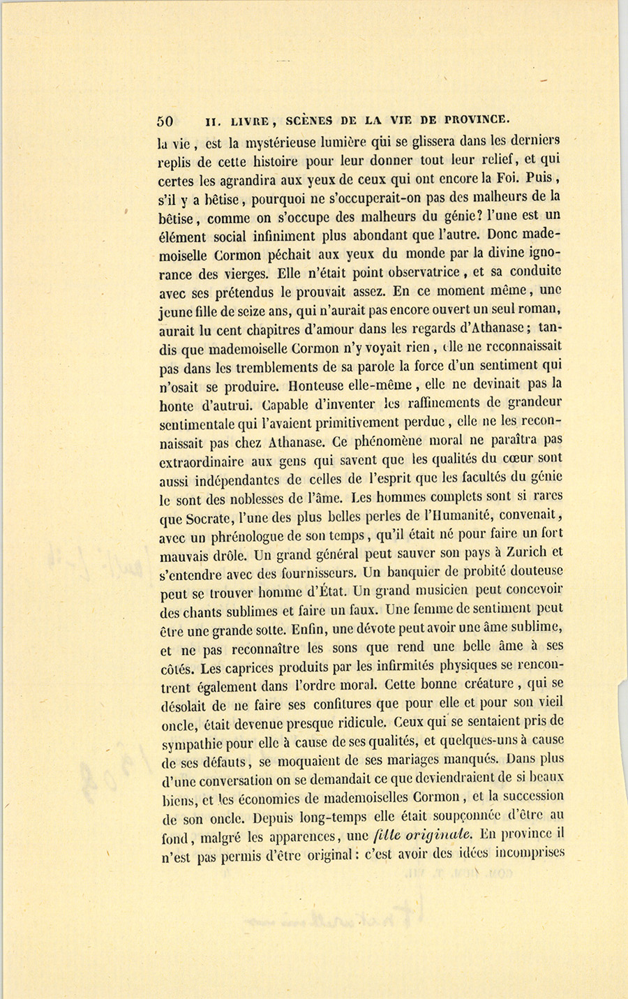 {p. 33} Maintenant il est nécessaire d’entrer chez cette vieille fille vers laquelle tant d’intérêts convergeaient, et chez qui les acteurs de cette scène devaient se rencontrer tous le soir même, à l’exception de Suzanne. Cette grande et belle personne assez hardie pour brûler ses vaisseaux, comme Alexandre, au début de la vie, et pour commencer la lutte par une faute mensongère, disparut du théâtre après y avoir introduit un violent élément d’intérêt. Ses vœux furent d’ailleurs comblés. Elle quitta sa ville natale quelques jours après, munie d’argent et de belles nippes, parmi lesquelles se trouvait une superbe robe de reps vert et un délicieux chapeau vert doublé de rose que lui donna monsieur de Valois, présent qu’elle préférait à tout, même à l’argent des dames de la Société Maternelle. Si le chevalier fût venu à Paris au moment où elle y brillait, elle eût certes tout quitté pour lui. Semblable à la chaste Suzanne de la Bible, que les vieillards avaient à peine entrevue, elle s’établissait heureuse et pleine d’espoir à Paris, pendant que tout Alençon déplorait ses malheurs pour lesquels les dames des deux Sociétés de Charité et de Maternité manifestèrent une vive sympathie. Si Suzanne peut offrir une image de ces belles normandes qu’un savant médecin a comprises pour un tiers dans la consommation que fait en ce genre le monstrueux Paris, elle resta dans les régions les plus élevées et les plus décentes de la galanterie. Par une époque où, comme le disait monsieur de Valois, la Femme n’existait plus, elle fut seulement madame du Valnoble ; autrefois elle eût été la rivale des Rhodope, des Impéria, des Ninon. Un des écrivains les plus distingués de la Restauration l’a prise sous sa protection ; peut-être l’épousera-t-il ? il est journaliste, et partant au-dessus de l’opinion, puisqu’il en fabrique une nouvelle tous les six ans.