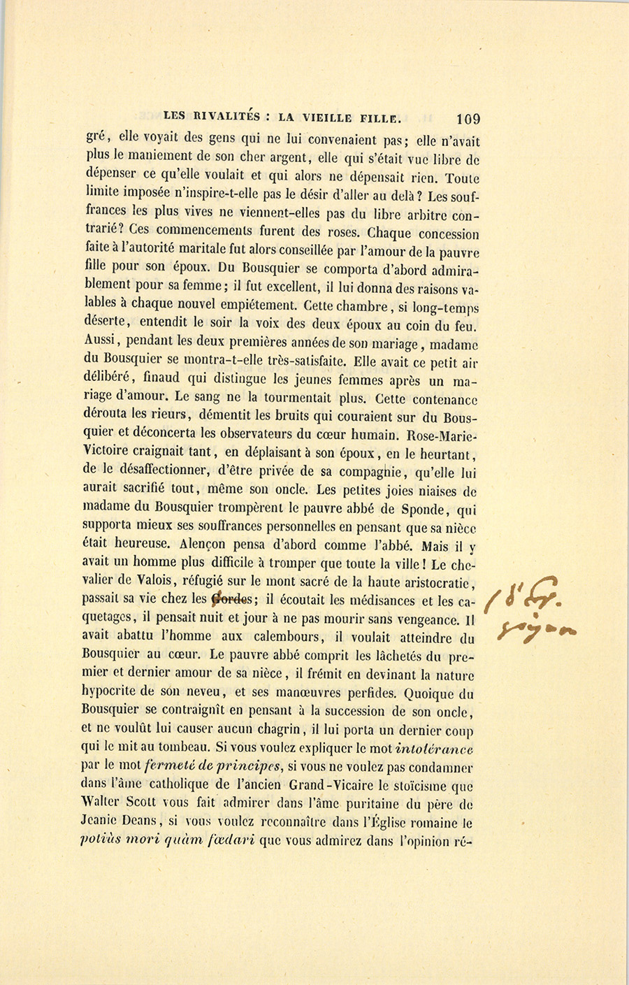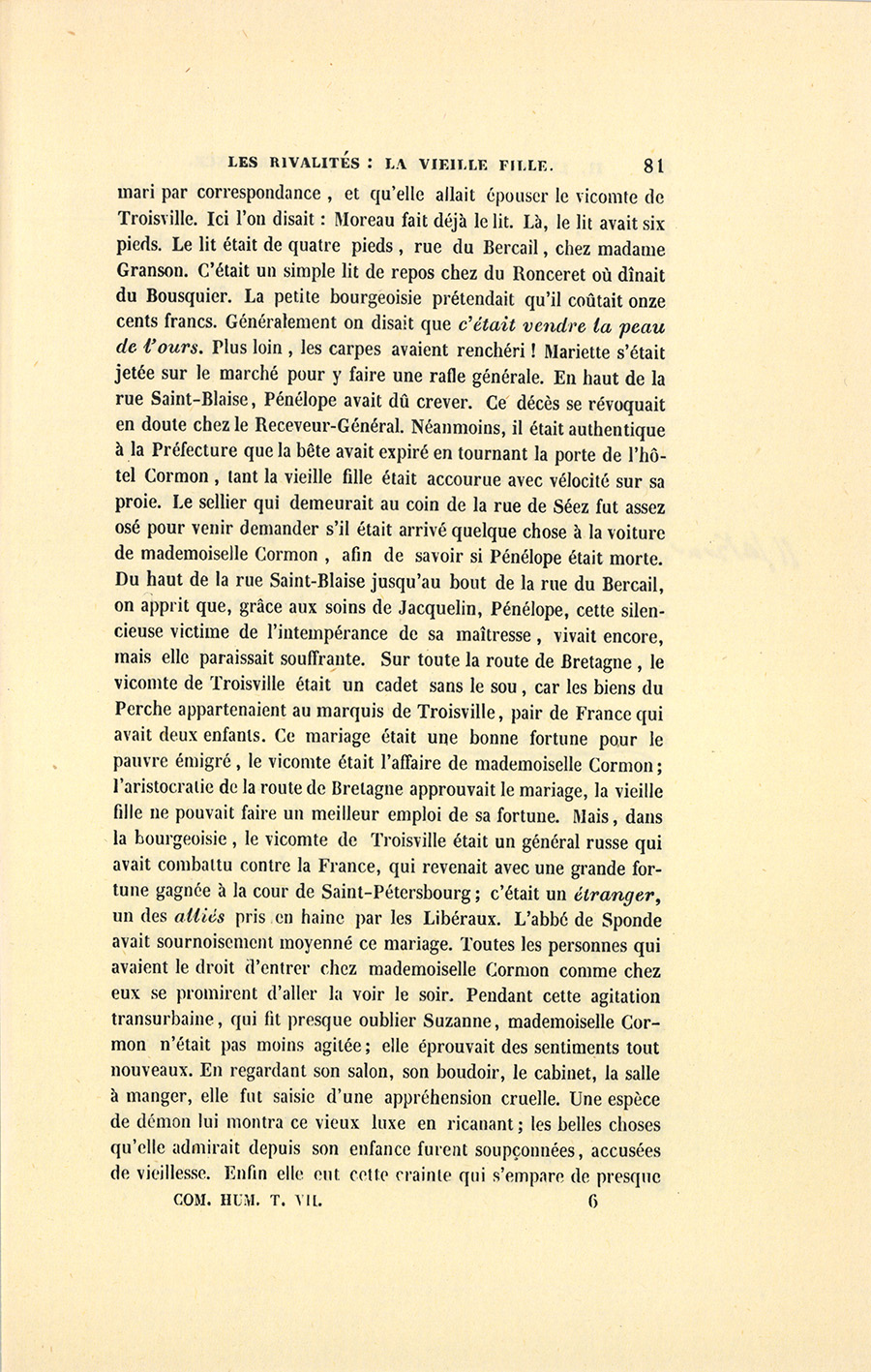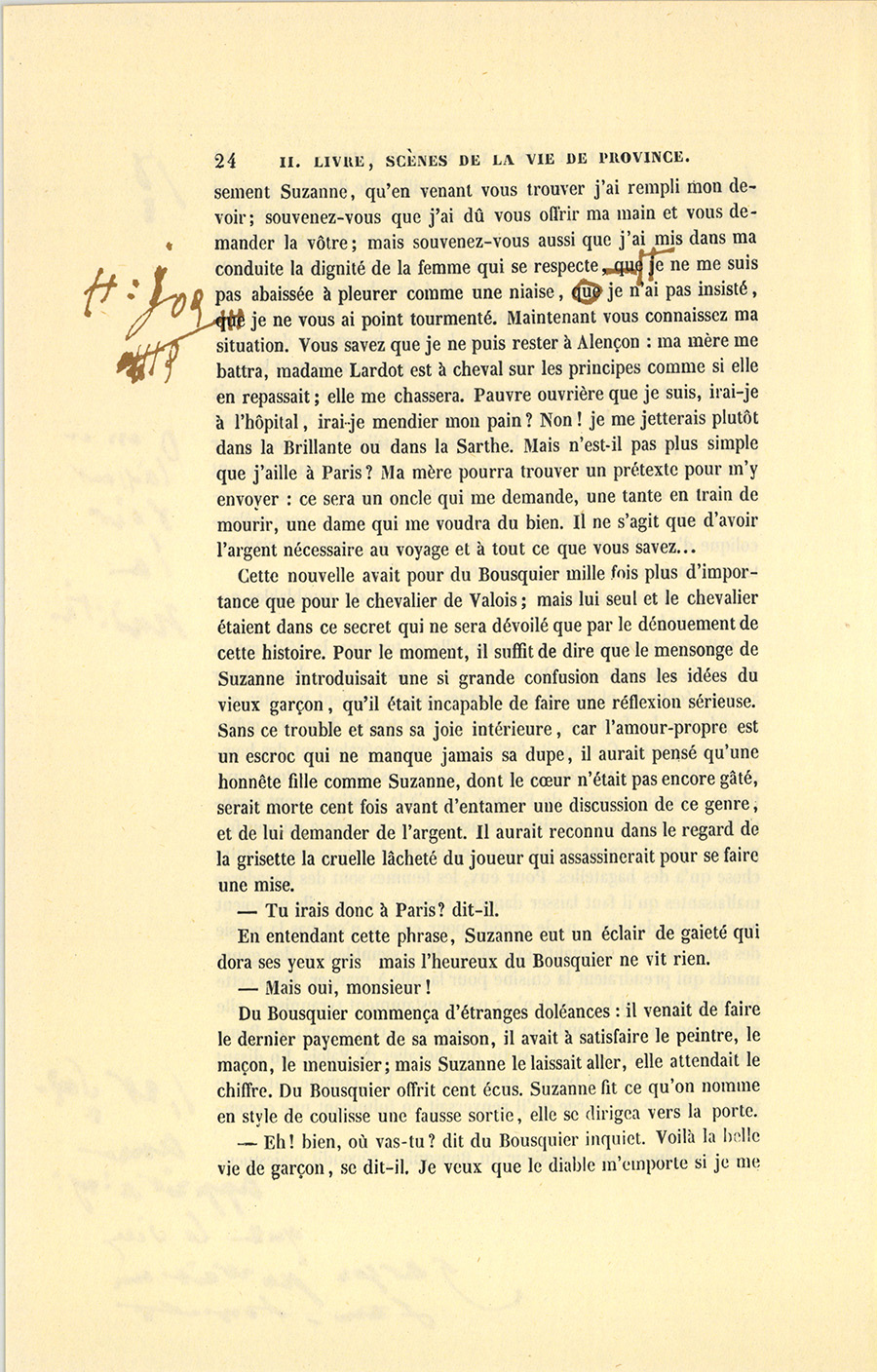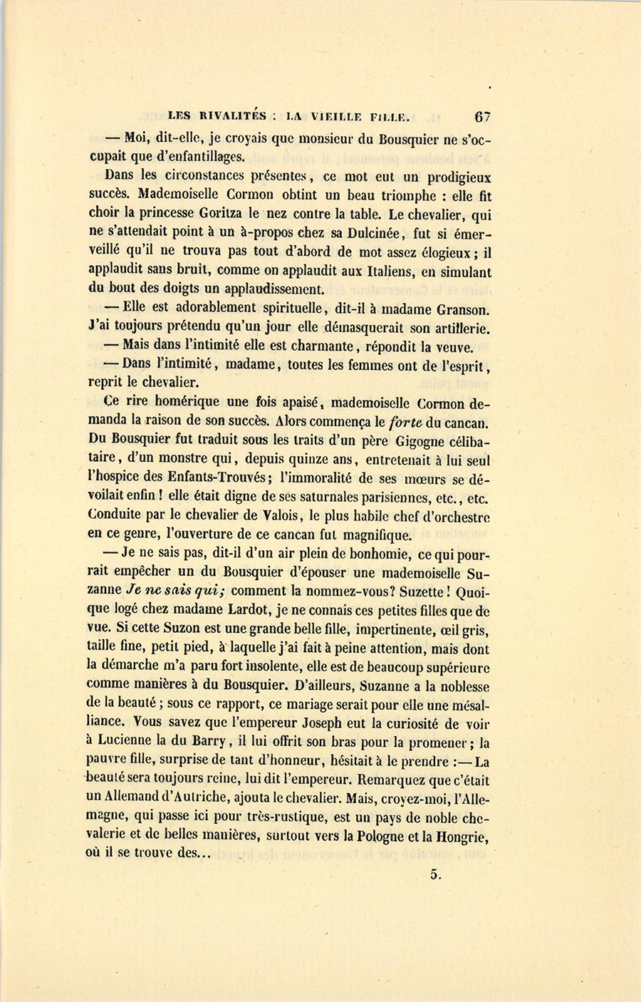 {p. 33} Maintenant il est nécessaire d’entrer chez cette vieille fille vers laquelle tant d’intérêts convergeaient, et chez qui les acteurs de cette scène devaient se rencontrer tous le soir même, à l’exception de Suzanne. Cette grande et belle personne assez hardie pour brûler ses vaisseaux, comme Alexandre, au début de la vie, et pour commencer la lutte par une faute mensongère, disparut du théâtre après y avoir introduit un violent élément d’intérêt. Ses vœux furent d’ailleurs comblés. Elle quitta sa ville natale quelques jours après, munie d’argent et de belles nippes, parmi lesquelles se trouvait une superbe robe de reps vert et un délicieux chapeau vert doublé de rose que lui donna monsieur de Valois, présent qu’elle préférait à tout, même à l’argent des dames de la Société Maternelle. Si le chevalier fût venu à Paris au moment où elle y brillait, elle eût certes tout quitté pour lui. Semblable à la chaste Suzanne de la Bible, que les vieillards avaient à peine entrevue, elle s’établissait heureuse et pleine d’espoir à Paris, pendant que tout Alençon déplorait ses malheurs pour lesquels les dames des deux Sociétés de Charité et de Maternité manifestèrent une vive sympathie. Si Suzanne peut offrir une image de ces belles normandes qu’un savant médecin a comprises pour un tiers dans la consommation que fait en ce genre le monstrueux Paris, elle resta dans les régions les plus élevées et les plus décentes de la galanterie. Par une époque où, comme le disait monsieur de Valois, la Femme n’existait plus, elle fut seulement madame du Valnoble ; autrefois elle eût été la rivale des Rhodope, des Impéria, des Ninon. Un des écrivains les plus distingués de la Restauration l’a prise sous sa protection ; peut-être l’épousera-t-il ? il est journaliste, et partant au-dessus de l’opinion, puisqu’il en fabrique une nouvelle tous les six ans.