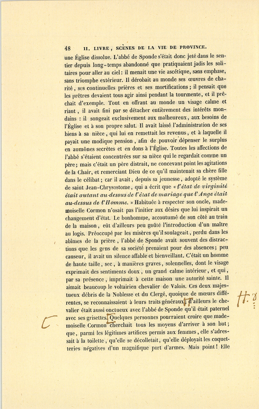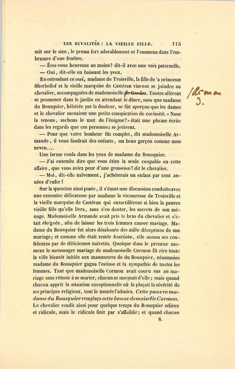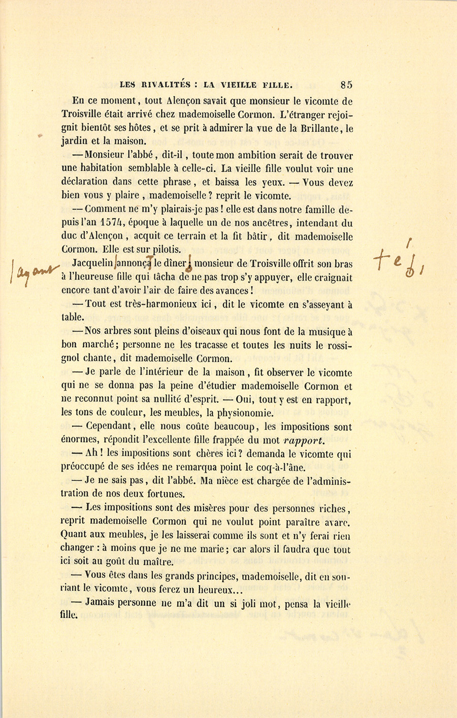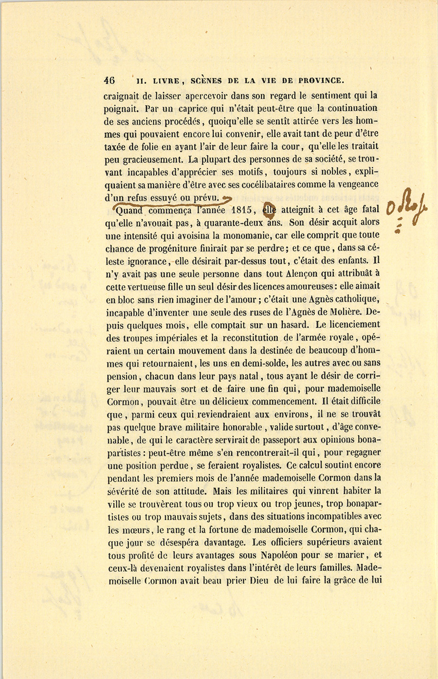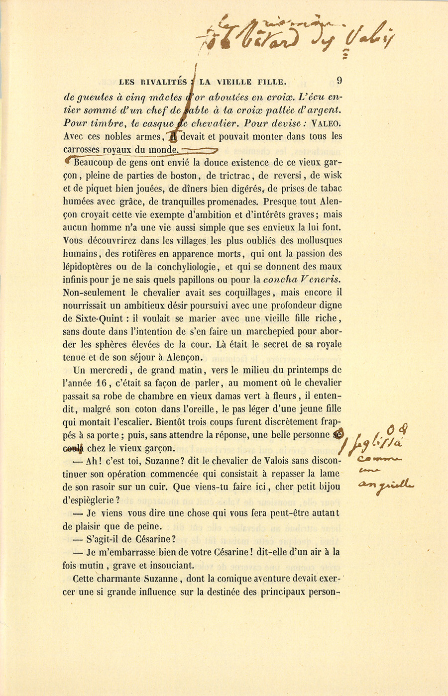 {p. 33} Maintenant il est nécessaire d’entrer chez cette vieille fille vers laquelle tant d’intérêts convergeaient, et chez qui les acteurs de cette scène devaient se rencontrer tous le soir même, à l’exception de Suzanne. Cette grande et belle personne assez hardie pour brûler ses vaisseaux, comme Alexandre, au début de la vie, et pour commencer la lutte par une faute mensongère, disparut du théâtre après y avoir introduit un violent élément d’intérêt. Ses vœux furent d’ailleurs comblés. Elle quitta sa ville natale quelques jours après, munie d’argent et de belles nippes, parmi lesquelles se trouvait une superbe robe de reps vert et un délicieux chapeau vert doublé de rose que lui donna monsieur de Valois, présent qu’elle préférait à tout, même à l’argent des dames de la Société Maternelle. Si le chevalier fût venu à Paris au moment où elle y brillait, elle eût certes tout quitté pour lui. Semblable à la chaste Suzanne de la Bible, que les vieillards avaient à peine entrevue, elle s’établissait heureuse et pleine d’espoir à Paris, pendant que tout Alençon déplorait ses malheurs pour lesquels les dames des deux Sociétés de Charité et de Maternité manifestèrent une vive sympathie. Si Suzanne peut offrir une image de ces belles normandes qu’un savant médecin a comprises pour un tiers dans la consommation que fait en ce genre le monstrueux Paris, elle resta dans les régions les plus élevées et les plus décentes de la galanterie. Par une époque où, comme le disait monsieur de Valois, la Femme n’existait plus, elle fut seulement madame du Valnoble ; autrefois elle eût été la rivale des Rhodope, des Impéria, des Ninon. Un des écrivains les plus distingués de la Restauration l’a prise sous sa protection ; peut-être l’épousera-t-il ? il est journaliste, et partant au-dessus de l’opinion, puisqu’il en fabrique une nouvelle tous les six ans.