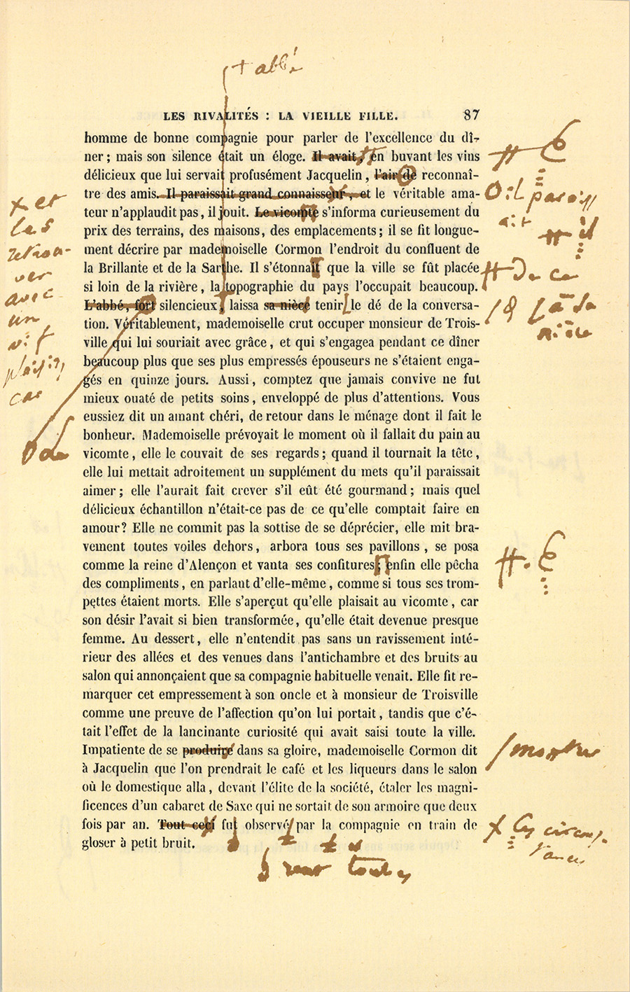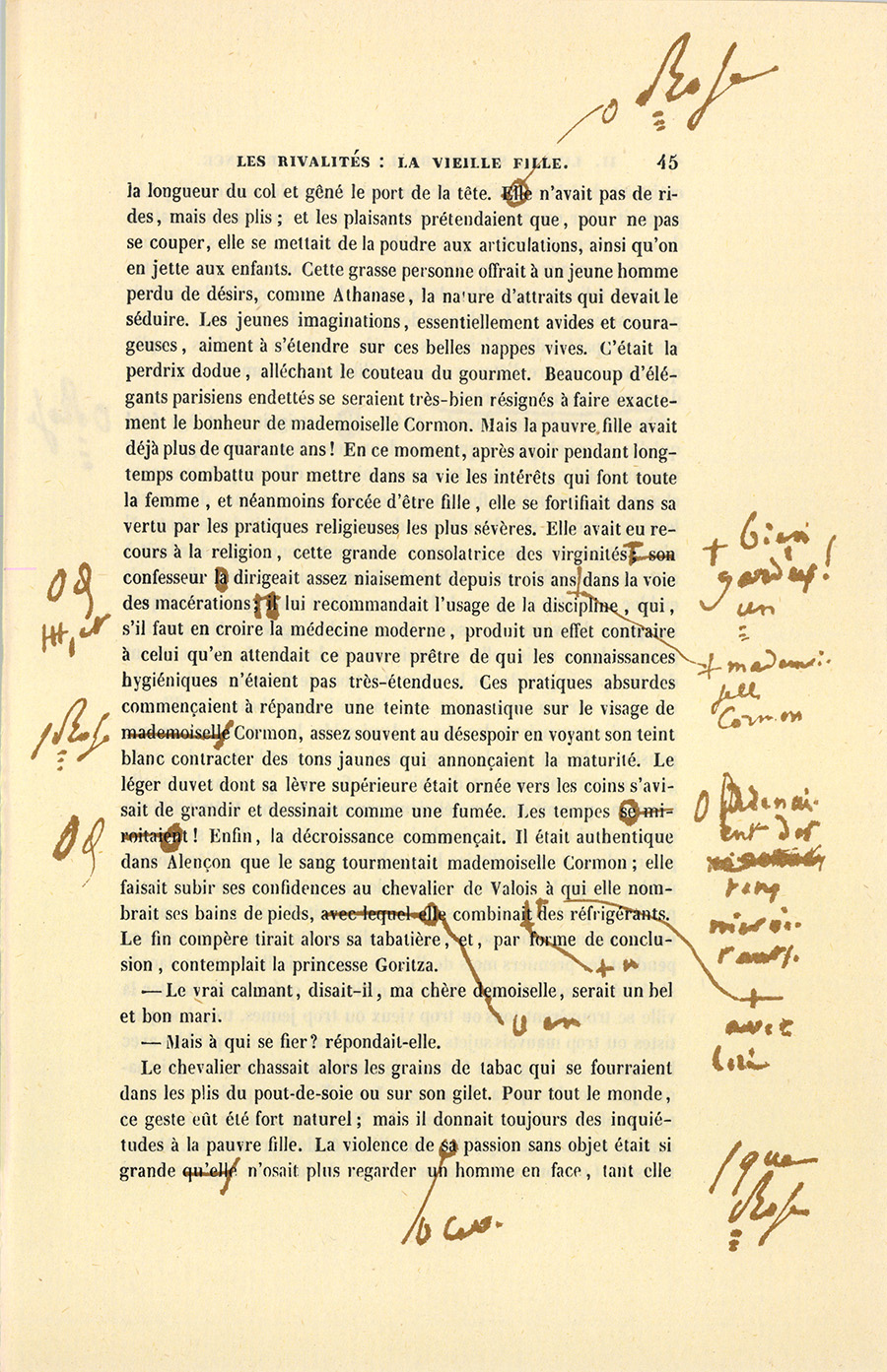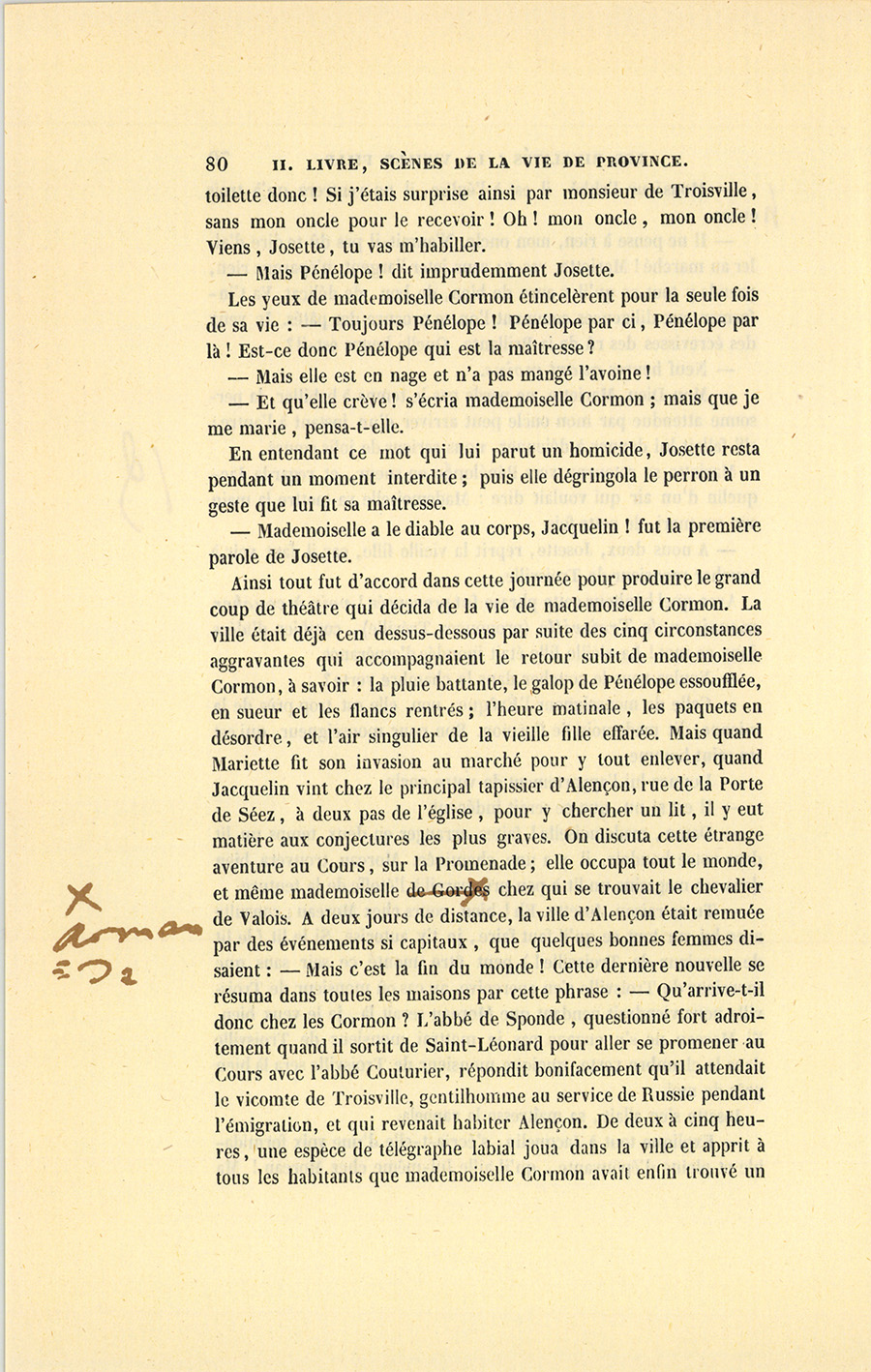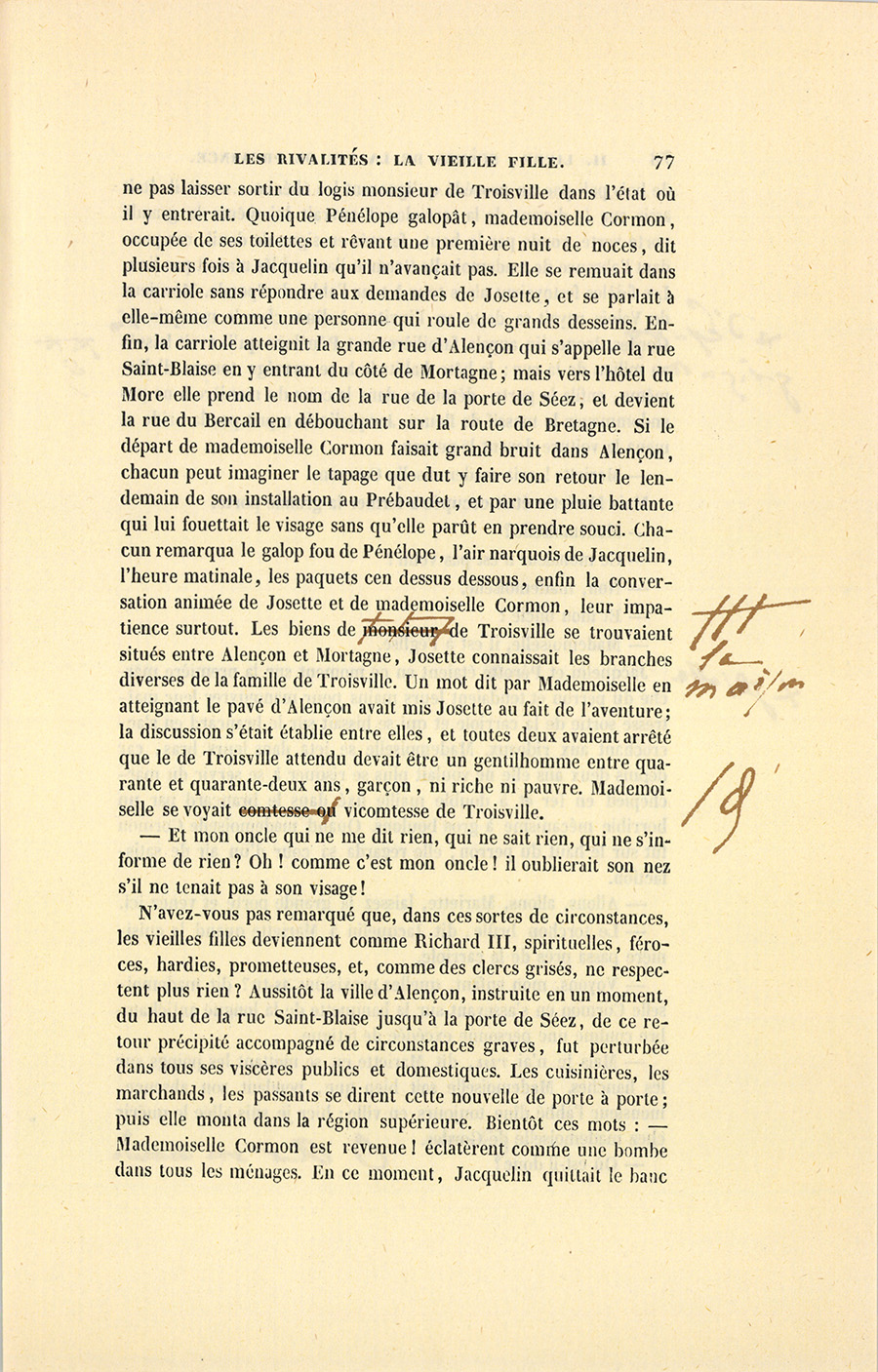 {p. 33} Maintenant il est nécessaire d’entrer chez cette vieille fille vers laquelle tant d’intérêts convergeaient, et chez qui les acteurs de cette scène devaient se rencontrer tous le soir même, à l’exception de Suzanne. Cette grande et belle personne assez hardie pour brûler ses vaisseaux, comme Alexandre, au début de la vie, et pour commencer la lutte par une faute mensongère, disparut du théâtre après y avoir introduit un violent élément d’intérêt. Ses vœux furent d’ailleurs comblés. Elle quitta sa ville natale quelques jours après, munie d’argent et de belles nippes, parmi lesquelles se trouvait une superbe robe de reps vert et un délicieux chapeau vert doublé de rose que lui donna monsieur de Valois, présent qu’elle préférait à tout, même à l’argent des dames de la Société Maternelle. Si le chevalier fût venu à Paris au moment où elle y brillait, elle eût certes tout quitté pour lui. Semblable à la chaste Suzanne de la Bible, que les vieillards avaient à peine entrevue, elle s’établissait heureuse et pleine d’espoir à Paris, pendant que tout Alençon déplorait ses malheurs pour lesquels les dames des deux Sociétés de Charité et de Maternité manifestèrent une vive sympathie. Si Suzanne peut offrir une image de ces belles normandes qu’un savant médecin a comprises pour un tiers dans la consommation que fait en ce genre le monstrueux Paris, elle resta dans les régions les plus élevées et les plus décentes de la galanterie. Par une époque où, comme le disait monsieur de Valois, la Femme n’existait plus, elle fut seulement madame du Valnoble ; autrefois elle eût été la rivale des Rhodope, des Impéria, des Ninon. Un des écrivains les plus distingués de la Restauration l’a prise sous sa protection ; peut-être l’épousera-t-il ? il est journaliste, et partant au-dessus de l’opinion, puisqu’il en fabrique une nouvelle tous les six ans.