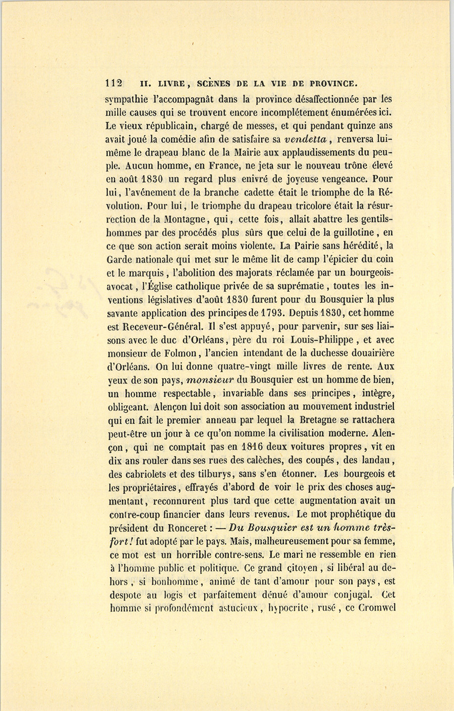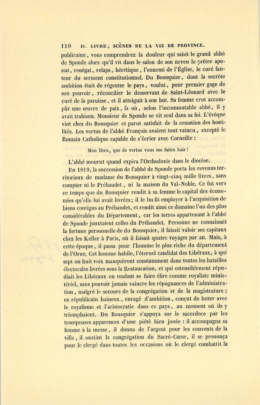 En 1819, la succession de l’abbé de Sponde porta les revenus territoriaux de madame du Bousquier à vingt-cinq mille livres, sans compter ni le Prébaudet, ni la maison du Val-Noble. Ce fut vers ce temps que du Bousquier rendit à sa femme le capital des économies qu’elle lui avait livrées ; il le lui fit employer à l’acquisition de biens contigus au Prébaudet, et rendit ainsi ce domaine l’un des plus considérables du Département, car les terres appartenant à l’abbé de Sponde jouxtaient celles du Prébaudet. Personne ne connaissait la fortune personnelle de du Bousquier, il faisait valoir ses capitaux chez les Keller à Paris, où il faisait quatre voyages par an. Mais, à cette époque, il passa pour l’homme le plus riche du département de l’Orne. Cet homme habile, l’éternel candidat des Libéraux, à qui sept ou huit voix manquèrent constamment dans toutes les batailles électorales livrées sous la Restauration, et qui ostensiblement répudiait les Libéraux en voulant se faire élire comme royaliste ministériel, sans pouvoir jamais vaincre les répugnances de l’administration, malgré le secours de la congrégation et de la magistrature ; ce républicain haineux, enragé d’ambition, conçut de lutter avec le royalisme et l’aristocratie dans ce pays, au moment où ils y triomphaient. Du Bousquier s’appuya sur le sacerdoce par les trompeuses apparences d’une piété bien jouée : il accompagna sa femme à la messe, il donna de l’argent pour les couvents de la ville, il soutint la congrégation du Sacré-Cœur, il se prononça pour le clergé dans toutes les occasions où le clergé combattit la {p. 111} Ville, le Département ou l’État. Secrètement soutenu par les Libéraux, protégé par l’Église, demeurant royaliste constitutionnel, il côtoya sans cesse l’aristocratie du département pour la ruiner, et il la ruina. Attentif aux fautes commises par les sommités nobiliaires et par le gouvernement, il réalisa, la bourgeoisie aidant, toutes les améliorations que la Noblesse, la Pairie et le Ministère devaient inspirer, diriger, et qu’ils entravaient par suite de la niaise jalousie des pouvoirs en France. L’opinion constitutionnelle l’emporta dans l’affaire du curé, dans l’érection du théâtre, dans toutes les questions d’agrandissement pressenties par du Bousquier, qui les faisait proposer par le parti libéral, auquel il s’adjoignait au plus fort des débats, en objectant le bien du pays. Du Bousquier industrialisa le Département. Il accéléra la prospérité de la province en haine des familles logées sur la route de Bretagne. Il préparait ainsi sa vengeance contre les gens à châteaux, et surtout contre les d’Esgrignon, au sein desquels un jour il fut sur le point d’enfoncer un poignard envenimé. Il donna des fonds pour relever les manufactures de point d’Alençon ; il raviva le commerce des toiles, la ville eut une filature. En s’inscrivant ainsi dans tous les intérêts et au cœur de la masse, en faisant ce que la Royauté ne faisait point, du Bousquier ne hasardait pas un liard. Soutenu par sa fortune, il pouvait attendre les réalisations que souvent les gens entreprenants, mais gênés, sont forcés d’abandonner à d’heureux successeurs. Il se posa comme banquier. Ce Laffitte au petit pied commanditait toutes les inventions nouvelles en prenant ses sûretés. Il faisait très bien ses affaires en faisant le bien public ; il était le moteur des Assurances, le protecteur des nouvelles entreprises de voitures publiques ; il suggérait les pétitions pour demander à l’administration les chemins et les ponts nécessaires. Ainsi prévenu, le gouvernement voyait un empiétement sur son autorité. Les luttes s’engageaient maladroitement, car le bien du pays exigeait que la Préfecture cédât. Du Bousquier aigrissait la noblesse de province contre la noblesse de cour et contre la pairie. Enfin il prépara l’effrayante adhésion d’une forte partie du royalisme constitutionnel à la lutte que soutinrent le Journal des Débats et monsieur de Chateaubriand contre le trône, ingrate opposition basée sur des intérêts ignobles, et qui fut une des causes de triomphe de la bourgeoisie et du journalisme en 1830. Aussi, du Bousquier, comme les gens qu’il représente, eut-il le bonheur de voir passer le convoi de la Royauté, sans qu’aucune {p. 112} sympathie l’accompagnât dans la province désaffectionnée par les mille causes qui se trouvent encore incomplétement énumérées ici. Le vieux républicain, chargé de messes, et qui pendant quinze ans avait joué la comédie afin de satisfaire sa vendetta, renversa lui-même le drapeau blanc de la Mairie aux applaudissements du peuple. Aucun homme, en France, ne jeta sur le nouveau trône élevé en août 1830 un regard plus enivré de joyeuse vengeance. Pour lui, l’avénement de la branche cadette était le triomphe de la Révolution. Pour lui, le triomphe du drapeau tricolore était la résurrection de la Montagne, qui, cette fois, allait abattre les gentilshommes par des procédés plus sûrs que celui de la guillotine, en ce que son action serait moins violente. La Pairie sans hérédité, la Garde nationale qui met sur le même lit de camp l’épicier du coin et le marquis, l’abolition des majorats réclamée par un bourgeois-avocat, l’Église catholique privée de sa suprématie, toutes les inventions législatives d’août 1830 furent pour du Bousquier la plus savante application des principes de 1793. Depuis 1830, cet homme est Receveur-Général. Il s’est appuyé, pour parvenir, sur ses liaisons avec le duc d’Orléans, père du roi Louis-Philippe, et avec monsieur de Folmon, l’ancien intendant de la duchesse douairière d’Orléans. On lui donne quatre-vingt mille livres de rente. Aux yeux de son pays, monsieur du Bousquier est un homme de bien, un homme respectable, invariable dans ses principes, i