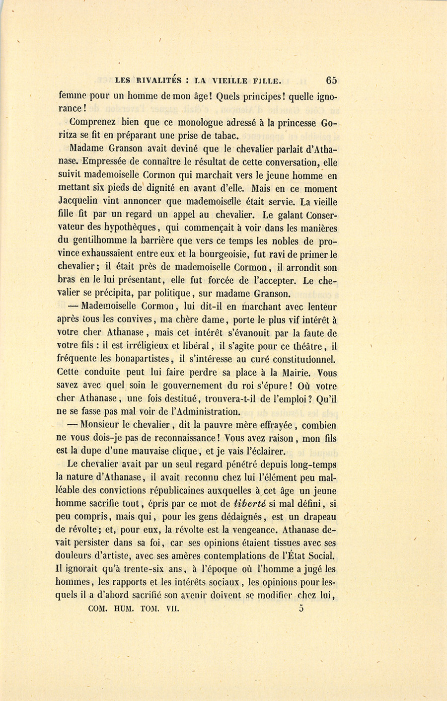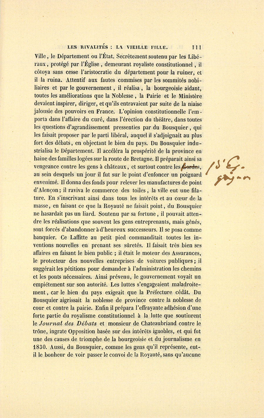 {p. 107} Ce mariage eut surtout pour effet de dessiner les partis dans Alençon. La maison d’Esgrignon y figura la haute aristocratie, car les Troisville revenus s’y rattachèrent. La maison Cormon représenta, sous l’habile influence de du Bousquier, cette fatale opinion qui sans être vraiment libérale, ni résolument royaliste, enfanta les 221 au jour où la lutte se précisa entre le plus auguste, le plus grand, le seul vrai pouvoir, la Royauté, et le plus faux, le plus changeant, le plus oppresseur pouvoir, le pouvoir dit parlementaire qu’exercent des assemblées électives. Le salon du Ronceret, secrètement allié au salon Cormon, fut hardiment libéral.
