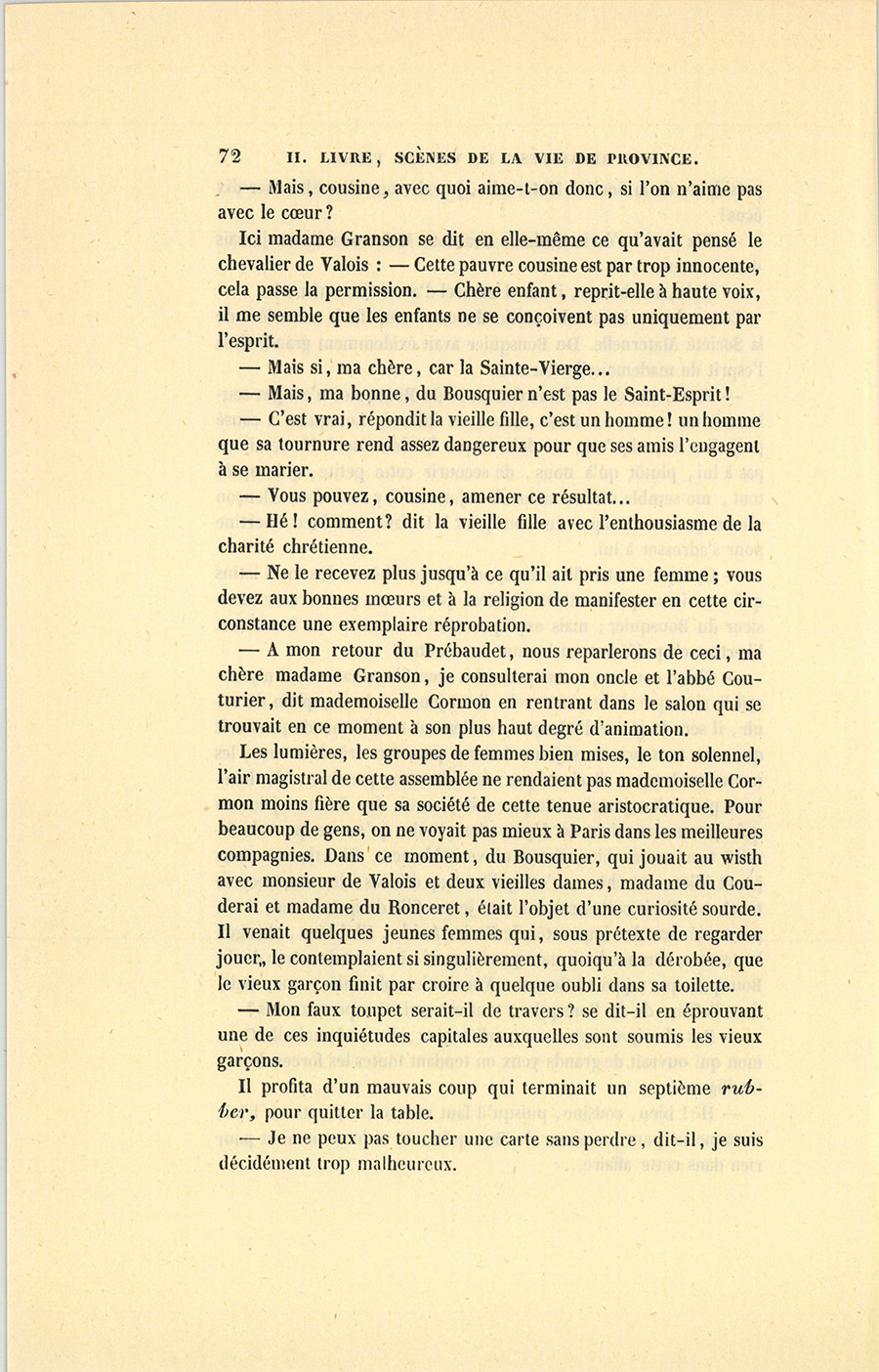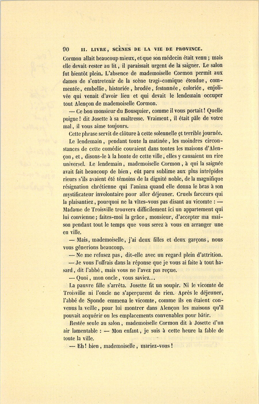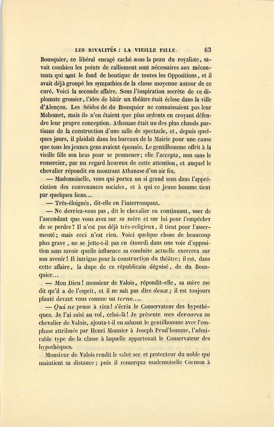 Du Bousquier sourit, et alla, comme futur maître du logis, prendre la table de piquet. Le chevalier de Valois, soit qu’il eût {p. 95} perdu la tête, soit qu’il voulût rester là pour étudier les causes de son désastre, et y remédier, se laissa faire comme un mouton qu’on mène à la boucherie. Il avait reçu le plus violent coup de massue qui puisse atteindre un homme, et un gentilhomme pouvait être étourdi à moins. Bientôt le digne abbé de Sponde et le vicomte de Troisville rentrèrent. Aussitôt mademoiselle Cormon se leva, courut dans l’antichambre, prit son oncle à part et lui dit sa résolution à l’oreille. En apprenant que la maison de la rue du Cygne convenait à monsieur de Troisville, elle pria son futur de lui rendre le service de dire que son oncle la savait à vendre. Elle n’osa pas confier ce mensonge à l’abbé, de peur d’une distraction. Le mensonge prospéra mieux que si c’eût été une action vertueuse. Dans la soirée, tout Alençon apprit la grande nouvelle. Depuis quatre jours, la ville était occupée comme aux jours néfastes de 1814 et de 1815. Les uns riaient, les autres admettaient le mariage, ceux-ci le blâmaient, ceux-là l’approuvaient. La classe moyenne d’Alençon en fut heureuse, elle y vit une conquête. Le lendemain, chez ses amis, le chevalier de Valois dit un mot cruel.