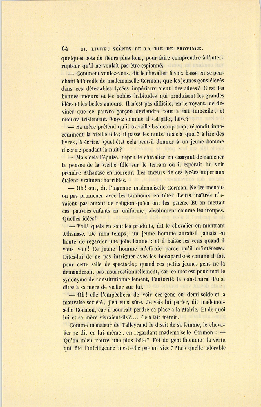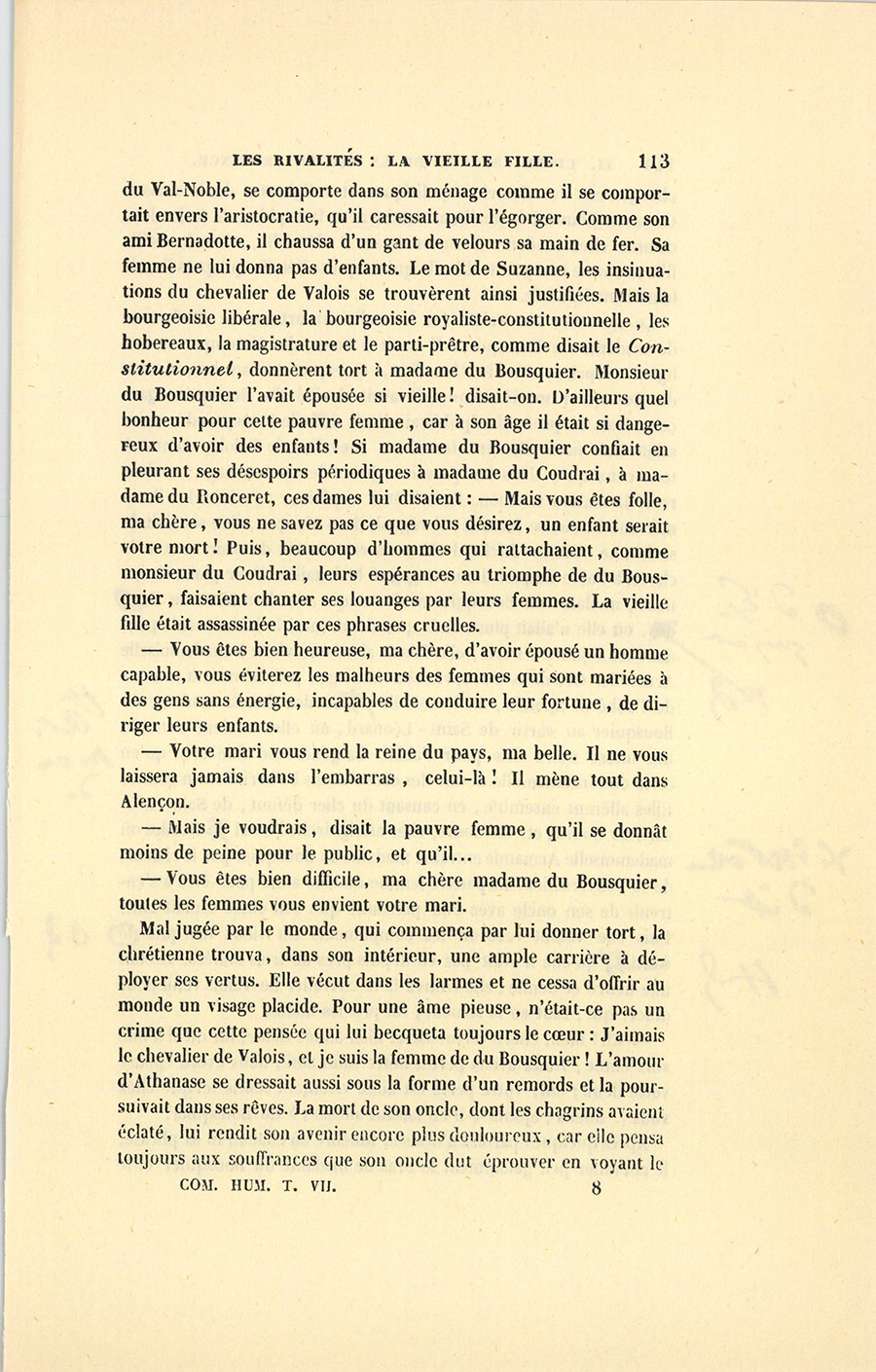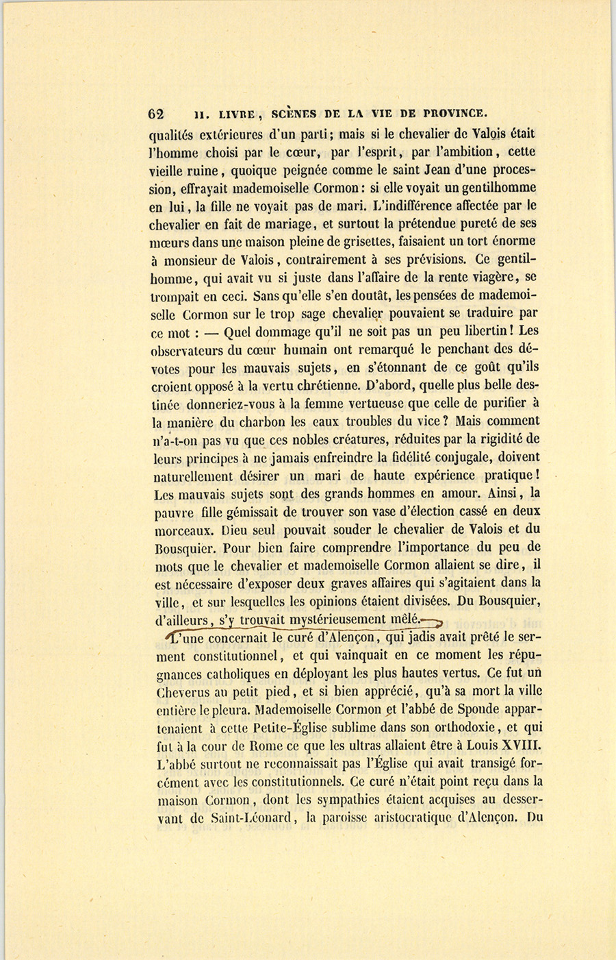 Du Bousquier sourit, et alla, comme futur maître du logis, prendre la table de piquet. Le chevalier de Valois, soit qu’il eût {p. 95} perdu la tête, soit qu’il voulût rester là pour étudier les causes de son désastre, et y remédier, se laissa faire comme un mouton qu’on mène à la boucherie. Il avait reçu le plus violent coup de massue qui puisse atteindre un homme, et un gentilhomme pouvait être étourdi à moins. Bientôt le digne abbé de Sponde et le vicomte de Troisville rentrèrent. Aussitôt mademoiselle Cormon se leva, courut dans l’antichambre, prit son oncle à part et lui dit sa résolution à l’oreille. En apprenant que la maison de la rue du Cygne convenait à monsieur de Troisville, elle pria son futur de lui rendre le service de dire que son oncle la savait à vendre. Elle n’osa pas confier ce mensonge à l’abbé, de peur d’une distraction. Le mensonge prospéra mieux que si c’eût été une action vertueuse. Dans la soirée, tout Alençon apprit la grande nouvelle. Depuis quatre jours, la ville était occupée comme aux jours néfastes de 1814 et de 1815. Les uns riaient, les autres admettaient le mariage, ceux-ci le blâmaient, ceux-là l’approuvaient. La classe moyenne d’Alençon en fut heureuse, elle y vit une conquête. Le lendemain, chez ses amis, le chevalier de Valois dit un mot cruel.