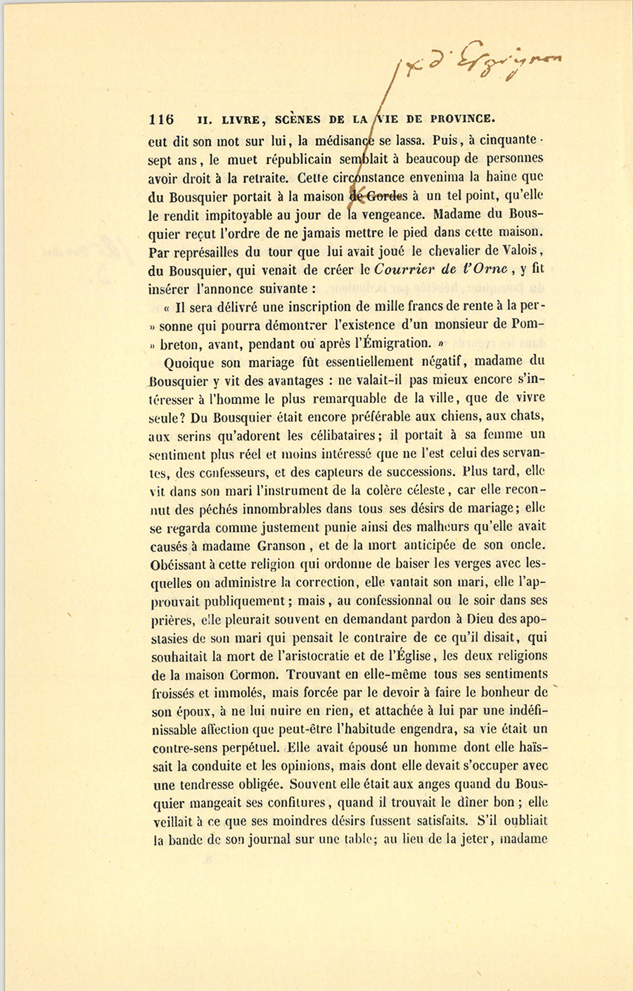 Sur la question ainsi posée, il s’émut une discussion conduite avec une excessive délicatesse par madame la vicomtesse de Troisville et la vieille marquise de Castéran qui entortillèrent si bien la pauvre vieille fille qu’elle livra, sans s’en douter, les secrets de son ménage. Mademoiselle Armande avait pris le bras du chevalier et s’était éloignée, afin de laisser les trois femmes causer mariage. Madame du Bousquier fut alors désabusée des mille déceptions de son mariage ; et comme elle était restée bestiote, elle amusa ses confidentes par de délicieuses naïvetés. Quoique dans le premier moment le mensonger mariage de mademoiselle Cormon fît rire toute la ville bientôt initiée aux manœuvres de du Bousquier, néanmoins madame du Bousquier gagna l’estime et la sympathie de toutes les femmes. Tant que mademoiselle Cormon avait couru sus au mariage sans réussir à se marier, chacun se moquait d’elle ; mais quand chacun apprit la situation exceptionnelle où la plaçait la sévérité de ses principes religieux, tout le monde l’admira. Cette pauvre madame du Bousquier remplaça cette bonne demoiselle Cormon. Le chevalier rendit ainsi pour quelque temps du Bousquier odieux et ridicule, mais le ridicule finit par s’affaiblir ; et quand chacun {p. 116} eut dit son mot sur lui, la médisance se lassa. Puis, à cinquante-sept ans, le muet républicain semblait à beaucoup de personnes avoir droit à la retraite. Cette circonstance envenima la haine que du Bousquier portait à la maison d’Esgrignon à un tel point, qu’elle le rendit impitoyable au jour de la vengeance. Madame du Bousquier reçut l’ordre de ne jamais mettre le pied dans cette maison. Par représailles du tour que lui avait joué le chevalier de Valois, du Bousquier, qui venait de créer le Courrier de l’Orne, y fit insérer l’annonce suivante :