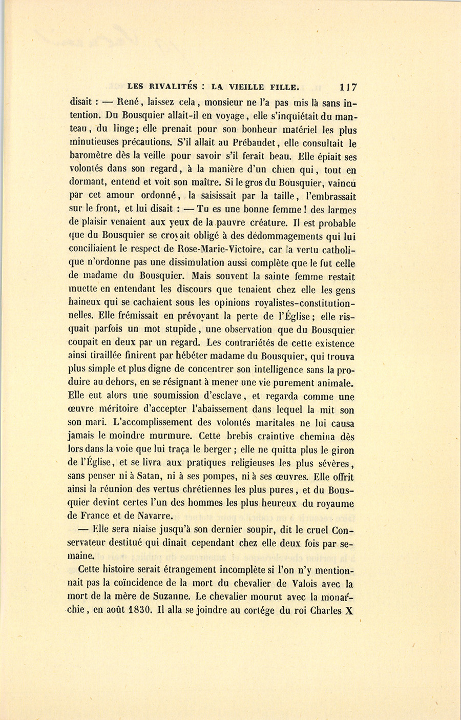 Cette histoire serait étrangement incomplète si l’on n’y mentionnait pas la coïncidence de la mort du chevalier de Valois avec la mort de la mère de Suzanne. Le chevalier mourut avec la monarchie, en août 1830. Il alla se joindre au cortége du roi Charles X {p. 118} à Nonancourt, et l’escorta pieusement jusqu’à Cherbourg avec tous les Troisville, les Castéran, les Verneuil, etc. Le vieux gentilhomme avait pris sur lui cinquante mille francs, somme à laquelle montaient ses économies et le prix de sa rente ; il l’offrit à l’un des fidèles amis de ses maîtres pour la transmettre au roi, en objectant sa mort prochaine, en disant que cette somme venait des bontés de Sa Majesté, qu’enfin l’argent du dernier des Valois appartenait à la Couronne. On ne sait si la ferveur de son zèle vainquit les répugnances du Bourbon qui abandonnait son beau royaume de France sans en emporter un liard, et qui dut être attendri par le dévouement du chevalier ; mais il est certain que Césarine, légataire universelle de monsieur de Valois, recueillit à peine six cents livres de rente. Le chevalier revint à Alençon aussi cruellement atteint par la douleur que par la fatigue, et il expira quand Charles X toucha la terre étrangère.