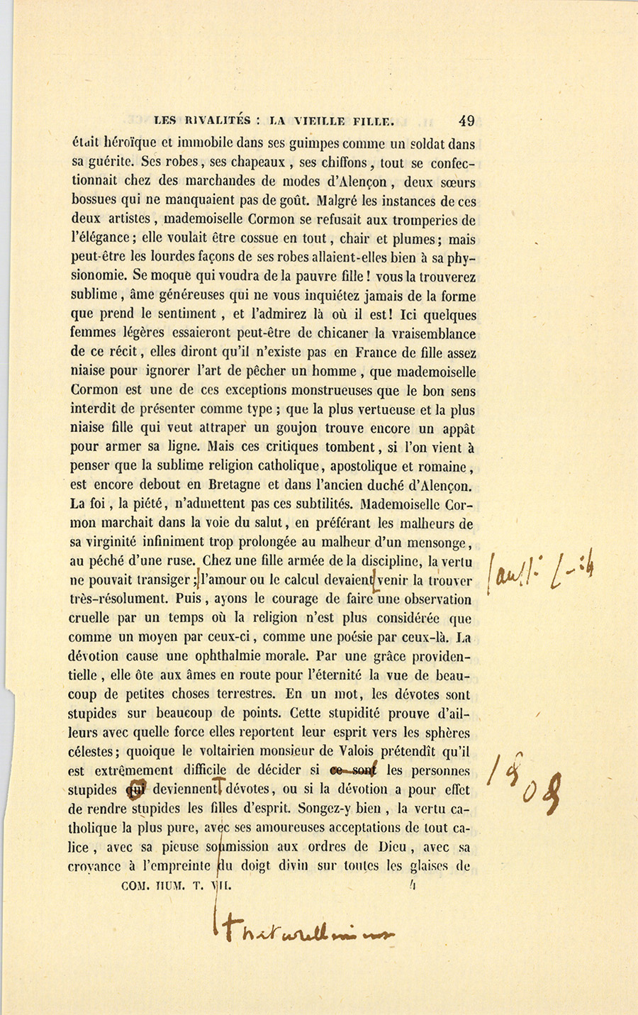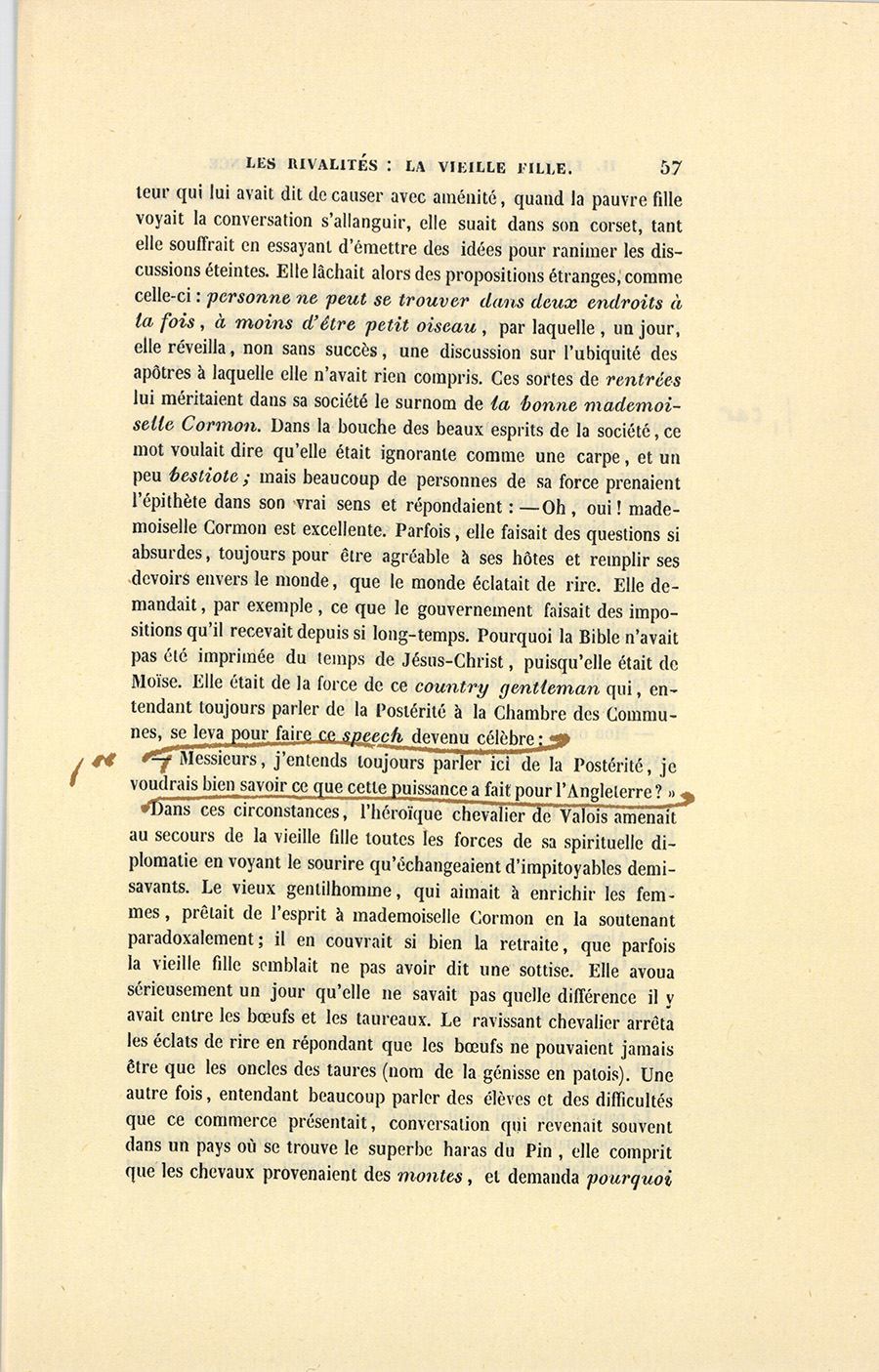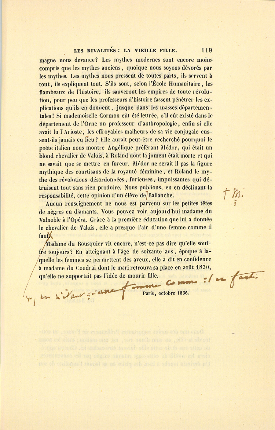 Quand cette histoire n’aurait d’autre effet que d’inspirer aux possesseurs de quelques reliques adorées une sainte peur, et les faire recourir à un codicille pour statuer immédiatement sur le sort de ces précieux souvenirs d’un bonheur qui n’est plus en les léguant à des mains fraternelles, elle aurait rendu d’énormes services à la portion chevaleresque et amoureuse du public ; mais elle renferme une moralité bien plus élevée !… ne démontre-t-elle pas la nécessité d’un enseignement nouveau ? N’invoque-t-elle pas, de la sollicitude si éclairée des ministres de l’instruction publique, la création de chaires d’anthropologie, science dans laquelle {p. 119} l’Allemagne nous devance ? Les mythes modernes sont encore moins compris que les mythes anciens, quoique nous soyons dévorés par les mythes. Les mythes nous pressent de toutes parts, ils servent à tout, ils expliquent tout. S’ils sont, selon l’École Humanitaire, les flambeaux de l’histoire, ils sauveront les empires de toute révolution, pour peu que les professeurs d’histoire fassent pénétrer les explications qu’ils en donnent, jusque dans les masses départementales ! Si mademoiselle Cormon eût été lettrée, s’il eût existé dans le département de l’Orne un professeur d’anthropologie, enfin si elle avait lu l’Arioste, les effroyables malheurs de sa vie conjugale eussent-ils jamais eu lieu ? Elle aurait peut-être recherché pourquoi le poète italien nous montre Angélique préférant Médor, qui était un blond chevalier de Valois, à Roland dont la jument était morte et qui ne savait que se mettre en fureur. Médor ne serait-il pas la figure mythique des courtisans de la royauté féminine, et Roland le mythe des révolutions désordonnées, furieuses, impuissantes qui détruisent tout sans rien produire. Nous publions, en en déclinant la responsabilité, cette opinion d’un élève de monsieur27 Ballanche.