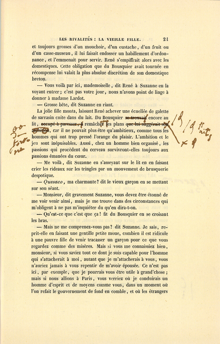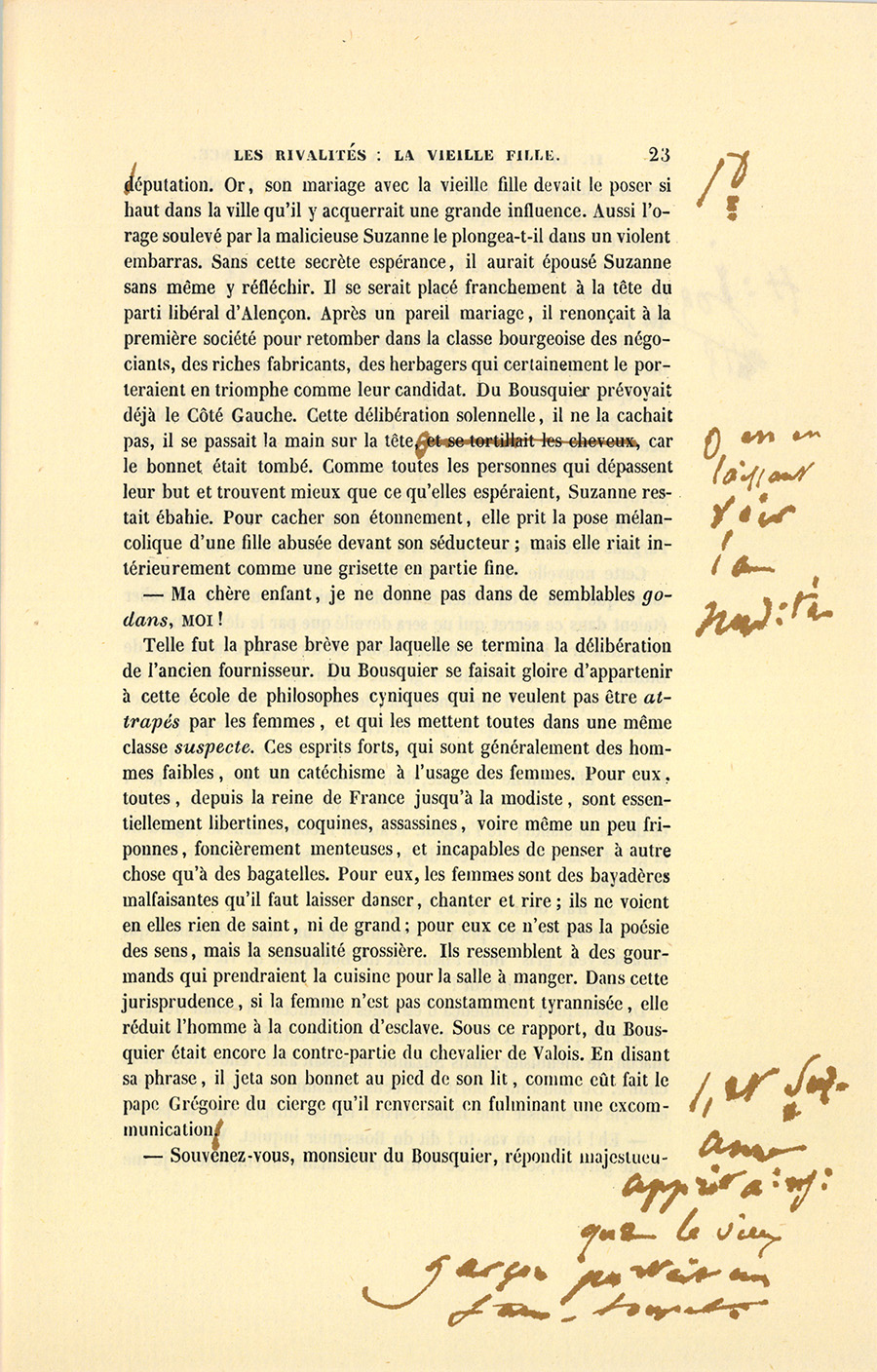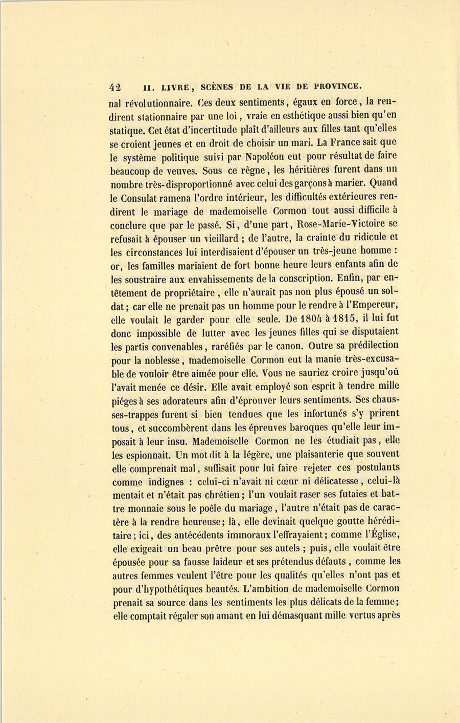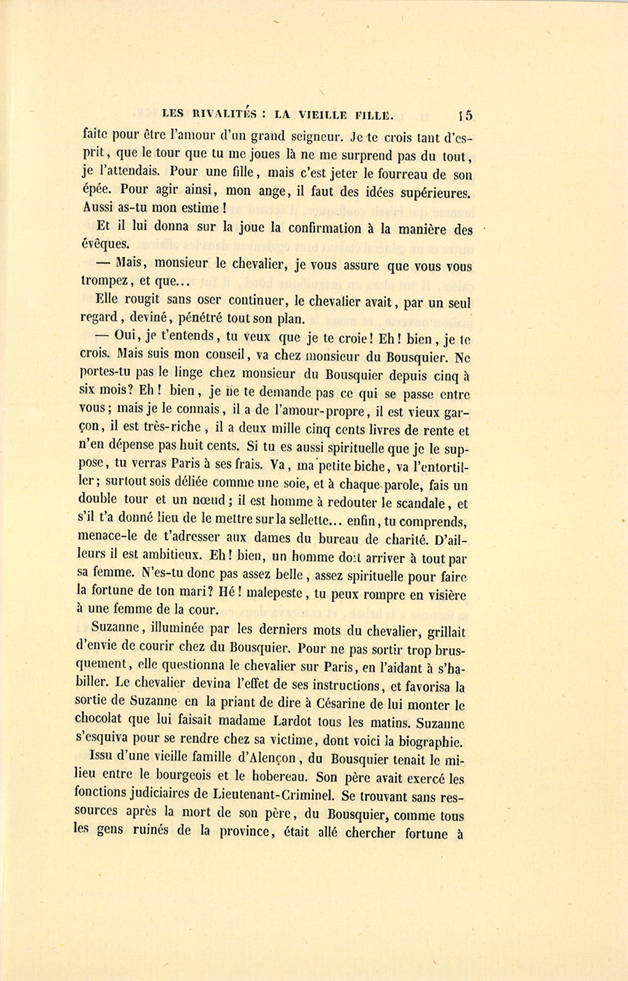 Du Bousquier était livré à mille sentiments contraires, à la joie, à la défiance, au calcul. Il avait résolu depuis long-temps d’épouser mademoiselle Cormon, car la Charte, sur laquelle il venait de ruminer, offrait à son ambition la magnifique voie politique de la {p. 23} Députation. Or, son mariage avec la vieille fille devait le poser si haut dans la ville qu’il y acquerrait une grande influence. Aussi l’orage soulevé par la malicieuse Suzanne le plongea-t-il dans un violent embarras. Sans cette secrète espérance, il aurait épousé Suzanne sans même y réfléchir. Il se serait placé franchement à la tête du parti libéral d’Alençon. Après un pareil mariage, il renonçait à la première société pour retomber dans la classe bourgeoise des négociants, des riches fabricants, des herbagers qui certainement le porteraient en triomphe comme leur candidat. Du Bousquier prévoyait déjà le Côté Gauche. Cette délibération solennelle, il ne la cachait pas, il se passait la main sur la tête en en laissant voir la nudité, car le bonnet était tombé. Comme toutes les personnes qui dépassent leur but et trouvent mieux que ce qu’elles espéraient, Suzanne restait ébahie. Pour cacher son étonnement, elle prit la pose mélancolique d’une fille abusée devant son séducteur ; mais elle riait intérieurement comme une grisette en partie fine.