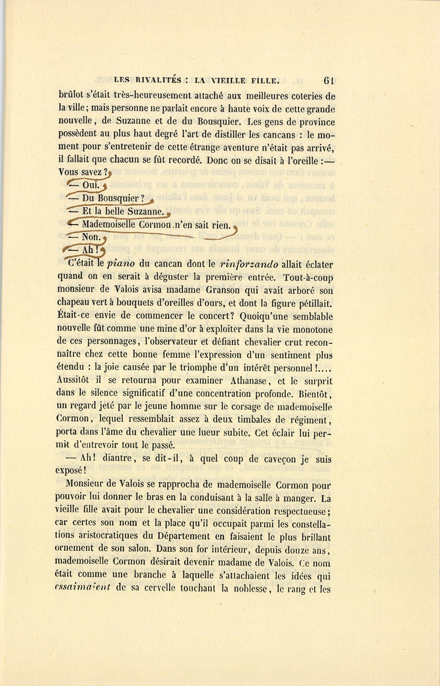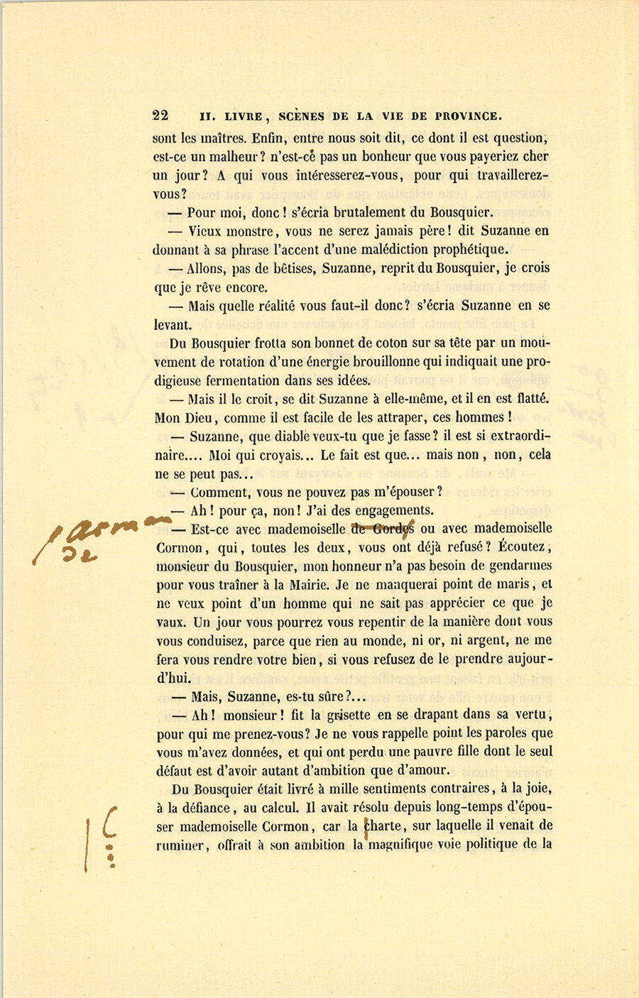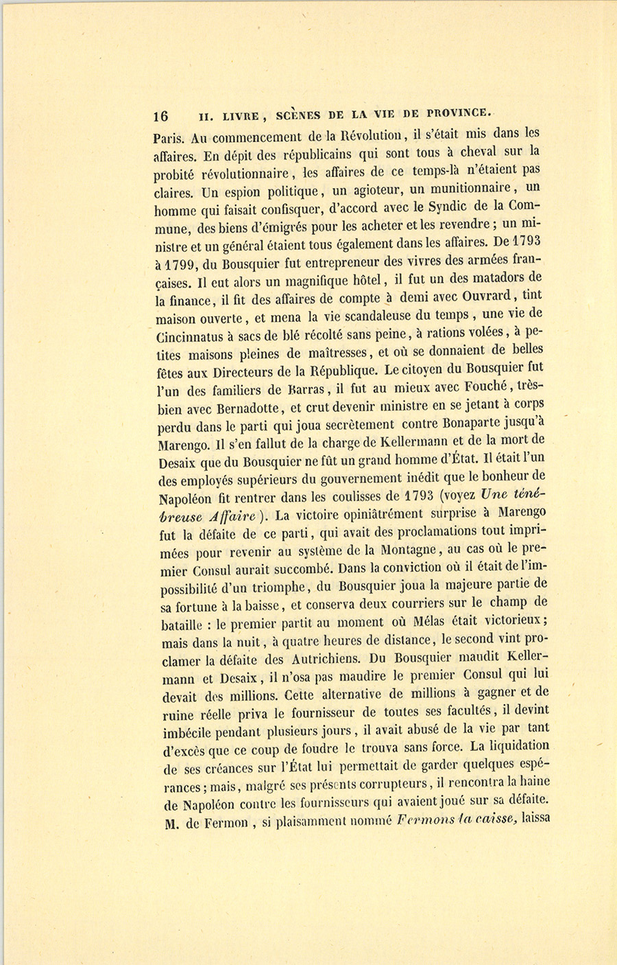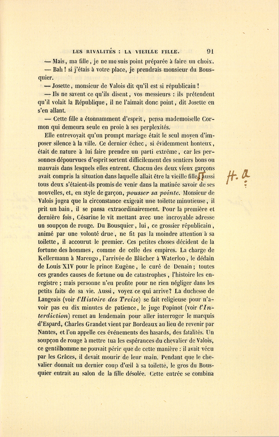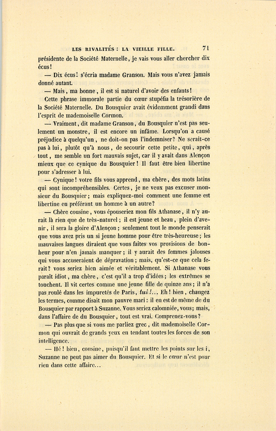 – Eh ! bien, où vas-tu ? dit du Bousquier inquiet. Voilà la belle vie de garçon, se dit-il. Je veux que le diable m’emporte si je me {p. 25} souviens de lui avoir chiffonné autre chose que sa collerette !… Et, paf ! elle s’autorise d’une plaisanterie pour tirer sur vous une lettre de change à brûle-pourpoint.