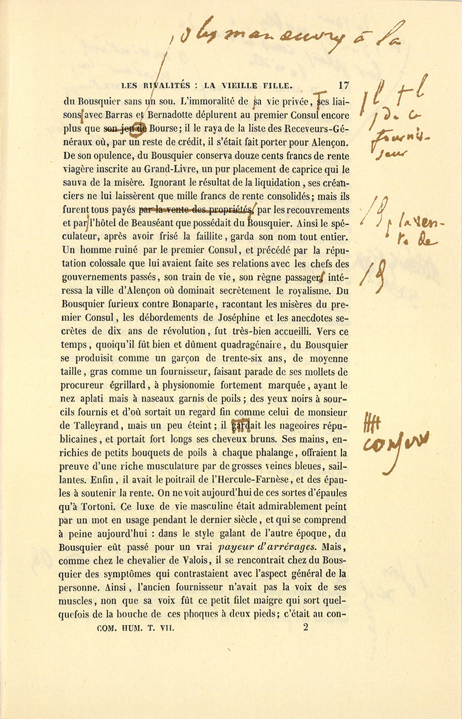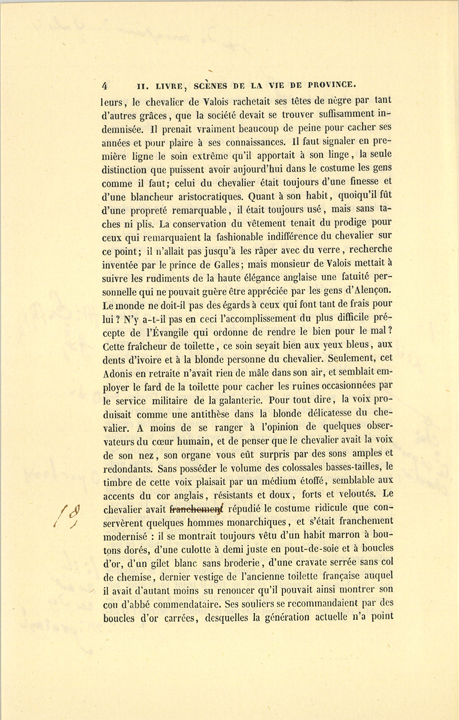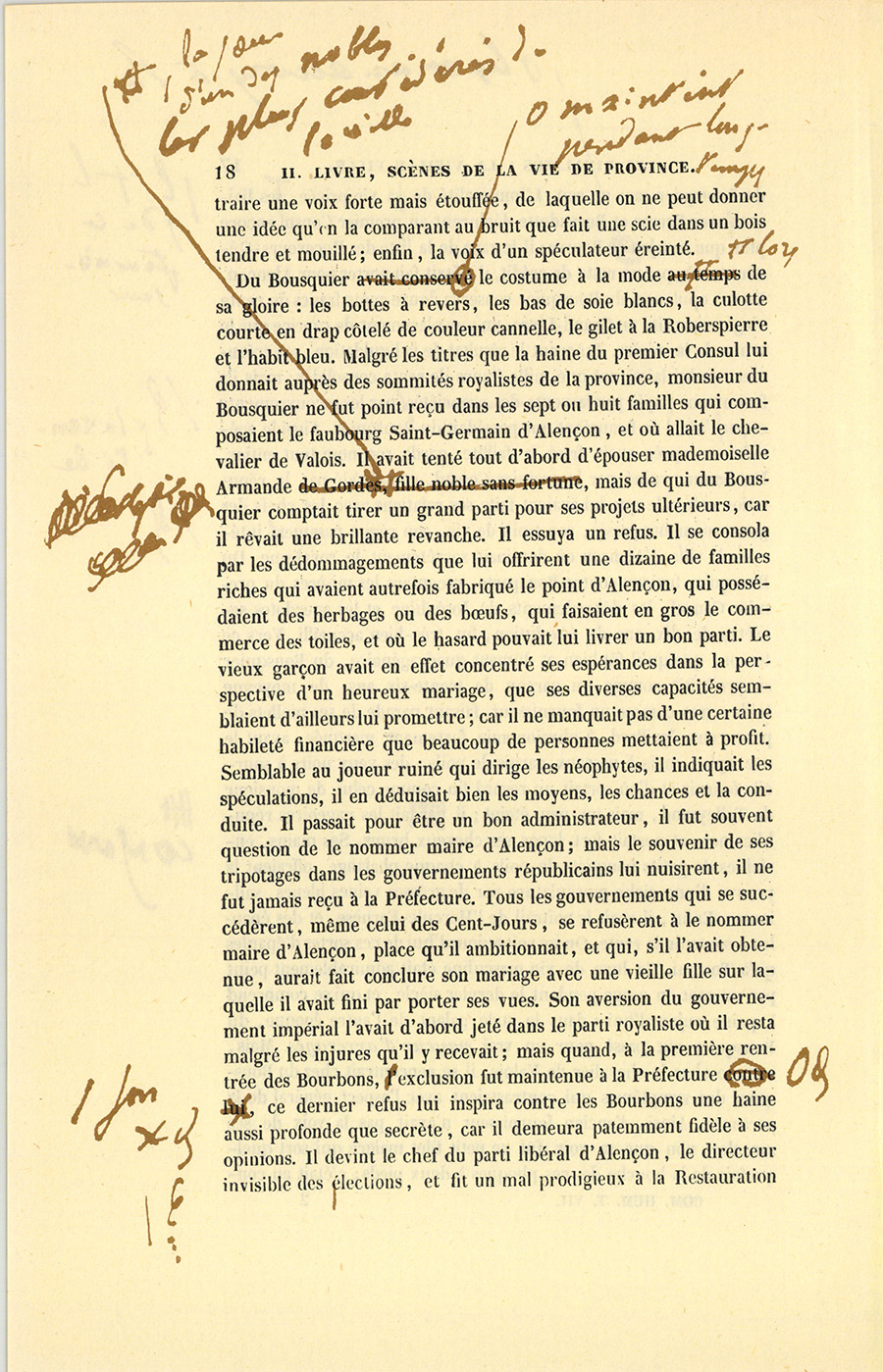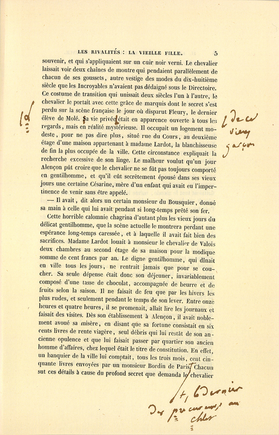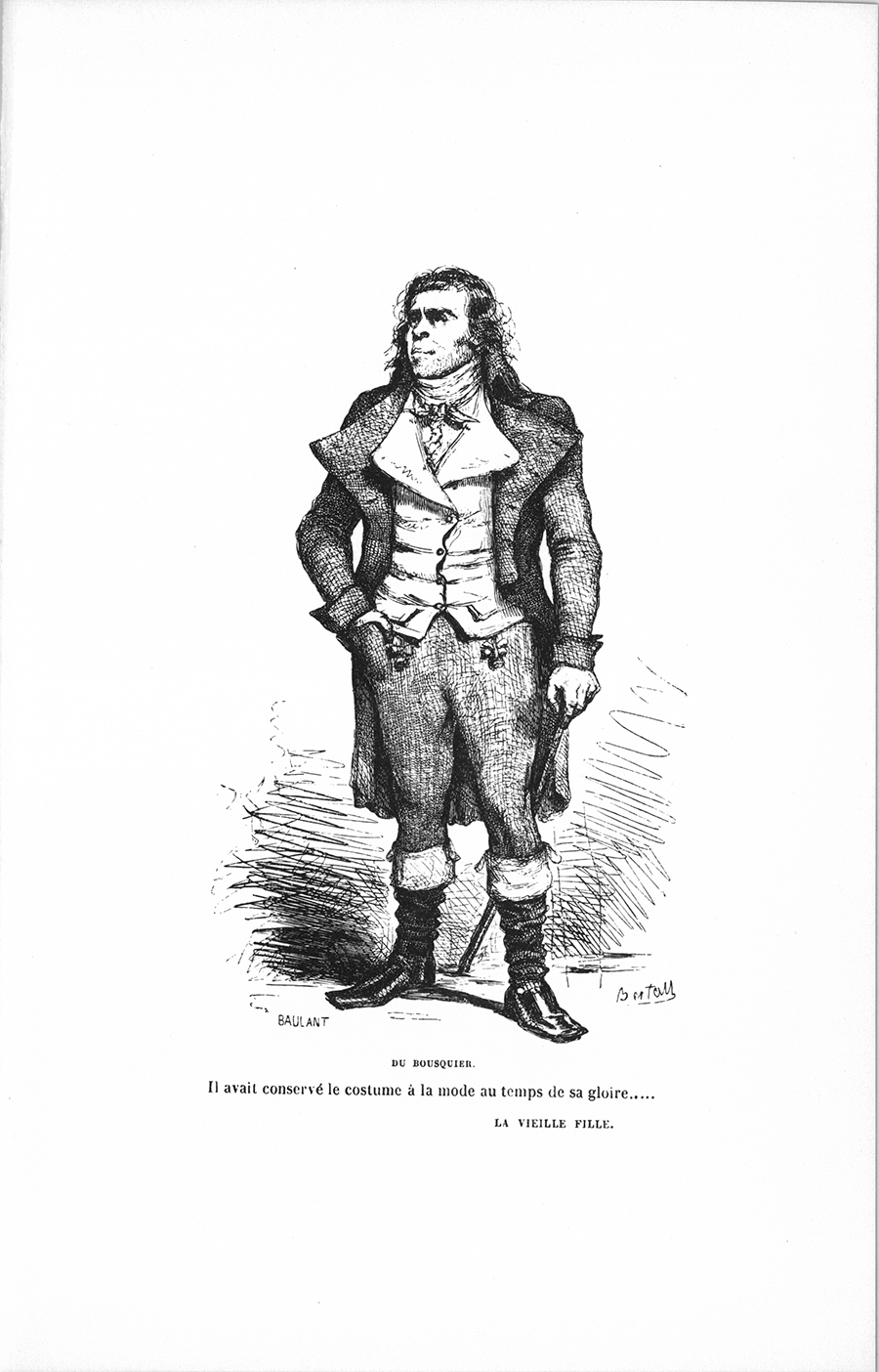 Du Bousquier maintint pendant long-temps le costume à la mode lors de sa gloire : les bottes à revers, les bas de soie blancs, la culotte courte en drap côtelé de couleur cannelle, le gilet à la Roberspierre et l’habit bleu. [ill.] Malgré les titres que la haine du premier Consul lui donnait auprès des sommités royalistes de la province, monsieur du Bousquier ne fut point reçu dans les sept ou huit familles qui composaient le faubourg Saint-Germain d’Alençon, et où allait le chevalier de Valois. Il avait tenté tout d’abord d’épouser mademoiselle Armande, la sœur d’un des nobles les plus considérés de la ville, mais de qui du Bousquier comptait tirer un grand parti pour ses projets ultérieurs, car il rêvait une brillante revanche. Il essuya un refus. Il se consola par les dédommagements que lui offrirent une dizaine de familles riches qui avaient autrefois fabriqué le point d’Alençon, qui possédaient des herbages ou des bœufs, qui faisaient en gros le commerce des toiles, et où le hasard pouvait lui livrer un bon parti. Le vieux garçon avait en effet concentré ses espérances dans la perspective d’un heureux mariage, que ses diverses capacités semblaient d’ailleurs lui promettre ; car il ne manquait pas d’une certaine habileté financière que beaucoup de personnes mettaient à profit. Semblable au joueur ruiné qui dirige les néophytes, il indiquait les spéculations, il en déduisait bien les moyens, les chances et la conduite. Il passait pour être un bon administrateur, il fut souvent question de le nommer maire d’Alençon ; mais le souvenir de ses tripotages dans les gouvernements républicains lui nuisirent, il ne fut jamais reçu à la Préfecture. Tous les gouvernements qui se succédèrent, même celui des Cent-Jours, se refusèrent à le nommer maire d’Alençon, place qu’il ambitionnait, et qui, s’il l’avait obtenue, aurait fait conclure son mariage avec une vieille fille sur laquelle il avait fini par porter ses vues. Son aversion du gouvernement impérial l’avait d’abord jeté dans le parti royaliste où il resta malgré les injures qu’il y recevait ; mais quand, à la première rentrée des Bourbons, son exclusion fut maintenue à la Préfecture, ce dernier refus lui inspira contre les Bourbons une haine aussi profonde que secrète, car il demeura patemment fidèle à ses opinions. Il devint le chef du parti libéral d’Alençon, le directeur invisible des Élections, et fit un mal prodigieux à la Restauration {p. 19} par l’habileté de ses manœuvres sourdes et par la perfidie de ses menées. Du Bousquier, comme tous ceux qui ne peuvent plus vivre que par la tête, portait dans ses sentiments haineux la tranquillité d’un ruisseau faible en apparence, mais intarissable. Sa haine était comme celle du nègre, si paisible, si patiente, qu’elle trompait l’ennemi. Sa vengeance, couvée pendant quinze années, ne fut rassasiée par aucune victoire, pas même par le triomphe des journées de juillet 1830.