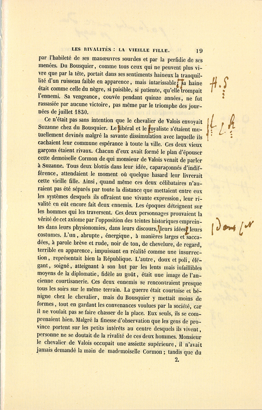 Ce n’était pas sans intention que le chevalier de Valois envoyait Suzanne chez du Bousquier. Le Libéral et le Royaliste s’étaient mutuellement devinés malgré la savante dissimulation avec laquelle ils cachaient leur commune espérance à toute la ville. Ces deux vieux garçons étaient rivaux. Chacun d’eux avait formé le plan d’épouser cette demoiselle Cormon de qui monsieur de Valois venait de parler à Suzanne. Tous deux blottis dans leur idée, caparaçonnés d’indifférence, attendaient le moment où quelque hasard leur livrerait cette vieille fille. Ainsi, quand même ces deux célibataires n’auraient pas été séparés par toute la distance que mettaient entre eux les systèmes desquels ils offraient une vivante expression, leur rivalité en eût encore fait deux ennemis. Les époques déteignent sur les hommes qui les traversent. Ces deux personnages prouvaient la vérité de cet axiome par l’opposition des teintes historiques empreintes dans leurs physionomies, dans leurs discours, dans leurs idées et leurs costumes. L’un, abrupt5, énergique, à manières larges et saccadées, à parole brève et rude, noir de ton, de chevelure, de regard, terrible en apparence, impuissant en réalité comme une insurrection, représentait bien la République. L’autre, doux et poli, élégant, soigné, atteignant à son but par les lents mais infaillibles moyens de la diplomatie, fidèle au goût, était une image de l’ancienne courtisanerie. Ces deux ennemis se rencontraient presque tous les soirs sur le même terrain. La guerre était courtoise et bénigne chez le chevalier, mais du Bousquier y mettait moins de formes, tout en gardant les convenances voulues par la société, car il ne voulait pas se faire chasser de la place. Eux seuls, ils se comprenaient bien. Malgré la finesse d’observation que les gens de province portent sur les petits intérêts au centre desquels ils vivent, personne ne se doutait de la rivalité de ces deux hommes. Monsieur le chevalier de Valois occupait une assiette supérieure, il n’avait jamais demandé la main de mademoiselle Cormon ; tandis que du {p. 20} Bousquier, qui s’était mis sur les rangs après son échec dans la maison la plus noble du pays, avait été refusé. Mais le chevalier supposait encore de grandes chances à son rival pour lui porter un coup de Jarnac si profondément enfoncé avec une lame trempée et préparée comme l’était Suzanne. Le chevalier avait jeté la sonde dans les eaux de du Bousquier ; et, comme on va le voir, il ne s’était trompé dans aucune de ses conjectures.