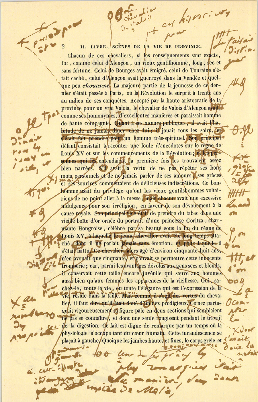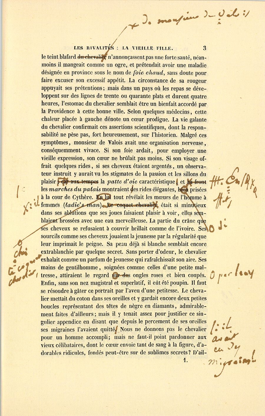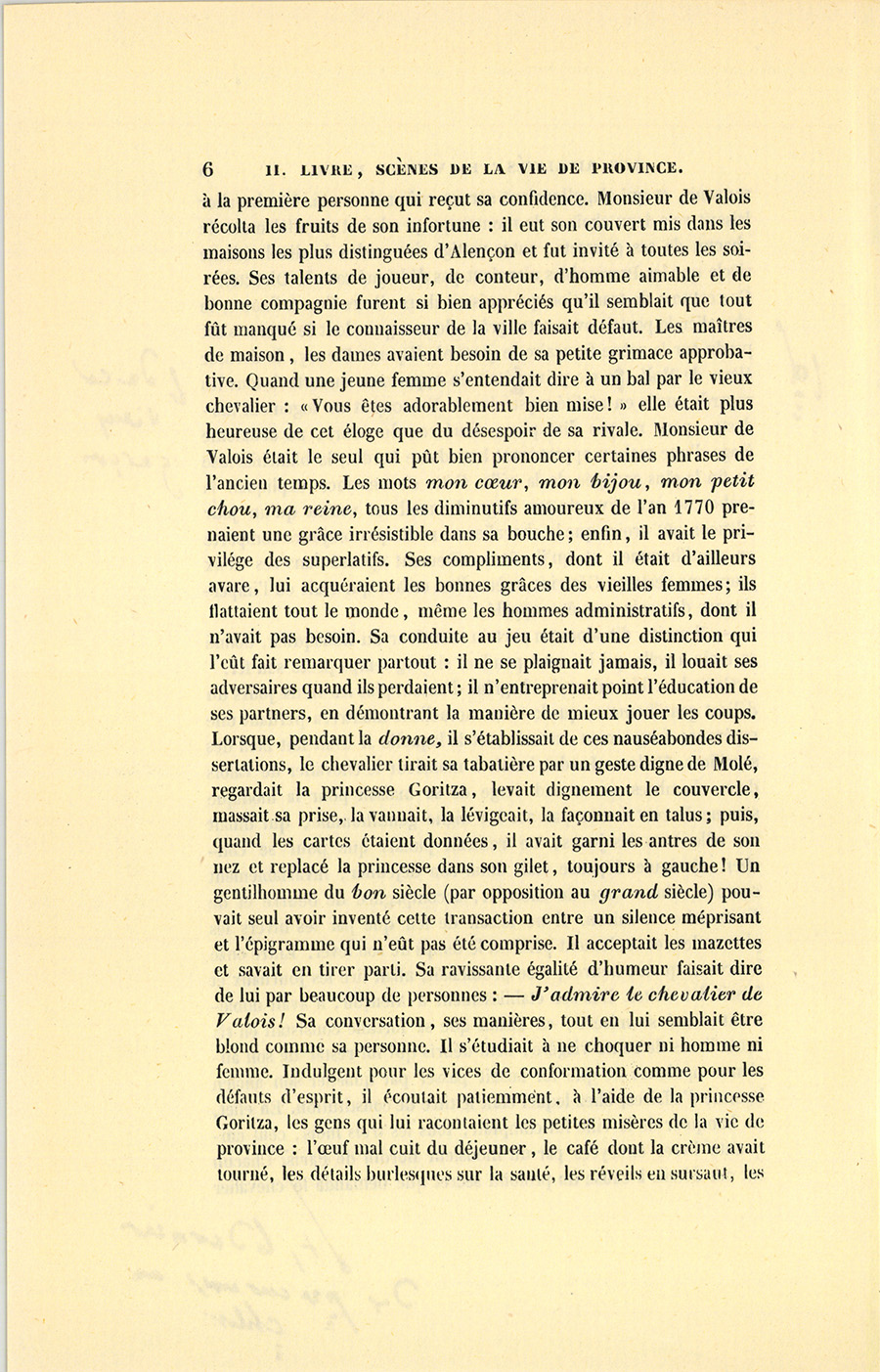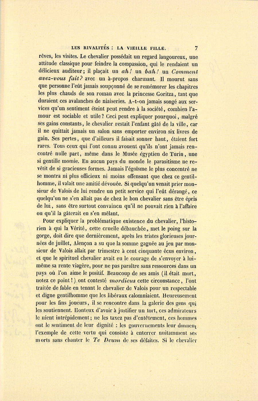 {p. 2} Chacun de ces chevaliers, si les renseignements sont exacts, fut, comme celui d’Alençon, un vieux gentilhomme, long, sec et sans fortune. Celui de Bourges avait émigré, celui de Touraine s’était caché, celui d’Alençon avait guerroyé dans la Vendée et quelque peu chouanné. La majeure partie de la jeunesse de ce dernier s’était passée à Paris, où la Révolution le surprit à trente ans au milieu de ses conquêtes. Accepté par la haute aristocratie de la province pour un vrai Valois, le chevalier de Valois d’Alençon se faisait distinguer, comme ses homonymes, par d’excellentes manières et paraissait homme de haute compagnie. Il dînait tous les jours en ville, et jouait tous les soirs. Il passait pour être un homme très-spirituel, grâce à l’un de ses défauts, qui consistait à raconter une foule d’anecdotes sur le règne de Louis XV et sur les commencements de la Révolution. Quand on entendait ces historiettes pour la première fois, on les trouvait assez bien narrées. Le chevalier de Valois avait d’ailleurs la vertu de ne pas répéter ses bons mots personnels et de ne jamais parler de ses amours ; mais ses grâces et ses sourires commettaient de délicieuses indiscrétions. Ce bonhomme usait du privilége qu’ont les vieux gentilshommes voltairiens de ne point aller à la messe, et l’on avait une excessive indulgence pour son irréligion, en faveur de son dévouement à la cause royale. Une de ses grâces les plus remarquées était sa manière, sans doute imitée de Molé, de prendre du tabac dans une vieille boîte d’or ornée du portrait d’une princesse Goritza, charmante Hongroise, célèbre par sa beauté sous la fin du règne de Louis XV. [ill.] Attaché pendant sa jeunesse à cette illustre étrangère, il en parlait toujours avec émotion, il s’était battu pour elle contre monsieur de Lauzun. Alors âgé d’environ cinquante-huit ans, il n’en avouait que cinquante, et pouvait se permettre cette innocente tromperie ; car, parmi les avantages dévolus aux gens secs et blonds, il conservait cette taille encore juvénile qui sauve aux hommes aussi bien qu’aux femmes les apparences de la vieillesse. Oui, sachez-le, toute la vie, ou toute l’élégance qui est l’expression de la vie, réside dans la taille. Au nombre des propriétés du chevalier, il faut compter le nez prodigieux dont l’avait doué la Nature. Ce nez partageait vigoureusement une figure pâle en deux sections qui semblaient ne pas se connaître, et dont une seule rougissait pendant le travail de la digestion. Ce fait est digne de remarque par un temps où la physiologie s’occupe tant du cœur humain. Cette incandescence se plaçait à gauche. Quoique les jambes hautes et fines, le corps grêle et {p. 3} le teint blafard de monsieur de Valois n’annonçassent pas une forte santé, néanmoins il mangeait comme un ogre, et prétendait avoir une maladie désignée en province sous le nom de foie chaud, sans doute pour faire excuser son excessif appétit. La circonstance de sa rougeur appuyait ses prétentions ; mais dans un pays où les repas se développent sur des lignes de trente ou quarante plats et durent quatre heures, l’estomac du chevalier semblait être un bienfait accordé par la Providence à cette bonne ville. Selon quelques médecins, cette chaleur placée à gauche dénote un cœur prodigue. La vie galante du chevalier confirmait ces assertions scientifiques, dont la responsabilité ne pèse pas, fort heureusement, sur l’historien. Malgré ces symptômes, monsieur de Valois avait une organisation nerveuse, conséquemment vivace. Si son foie ardait, pour employer une vieille expression, son cœur ne brûlait pas moins. Si son visage offrait quelques rides, si ses cheveux étaient argentés, un observateur instruit y aurait vu les stigmates de la passion et les sillons du plaisir. En effet, la patte d’oie caractéristique et les marches du palais montraient ces rides élégantes, si prisées à la cour de Cythère. Chez le coquet chevalier, tout révélait les mœurs de l’homme à femmes (ladie’s man) : il était si minutieux dans ses ablutions que ses joues faisaient plaisir à voir, elles semblaient brossées avec une eau merveilleuse. La partie du crâne que ses cheveux se refusaient à couvrir brillait comme de l’ivoire. Ses sourcils comme ses cheveux jouaient la jeunesse par la régularité que leur imprimait le peigne. Sa peau déjà si blanche semblait encore extrablanchie par quelque secret. Sans porter d’odeur, le chevalier exhalait comme un parfum de jeunesse qui rafraîchissait son aire. Ses mains de gentilhomme, soignées comme celles d’une petite maîtresse, attiraient le regard par leurs ongles roses et bien coupés. Enfin, sans son nez magistral et superlatif, il eût été poupin. Il faut se résoudre à gâter ce portrait par l’aveu d’une petitesse. Le chevalier mettait du coton dans ses oreilles et y gardait encore deux petites boucles représentant des têtes de nègre en diamants, admirablement faites d’ailleurs ; mais il y tenait assez pour justifier ce singulier appendice en disant que depuis le percement de ses oreilles ses migraines l’avaient quitté : il avait eu des migraines ! Nous ne donnons pas le chevalier pour un homme accompli ; mais ne faut-il point pardonner aux vieux célibataires, dont le cœur envoie tant de sang à la figure, d’adorables ridicules, fondés peut-être sur de sublimes secrets ? {p. 4} D’ailleurs, le chevalier de Valois rachetait ses têtes de nègre par tant d’autres grâces que la société devait se trouver suffisamment indemnisée. Il prenait vraiment beaucoup de peine pour cacher ses années et pour plaire à ses connaissances. Il faut signaler en première ligne le soin extrême qu’il apportait à son linge, la seule distinction que puissent avoir aujourd’hui dans le costume les gens comme il faut ; celui du chevalier était toujours d