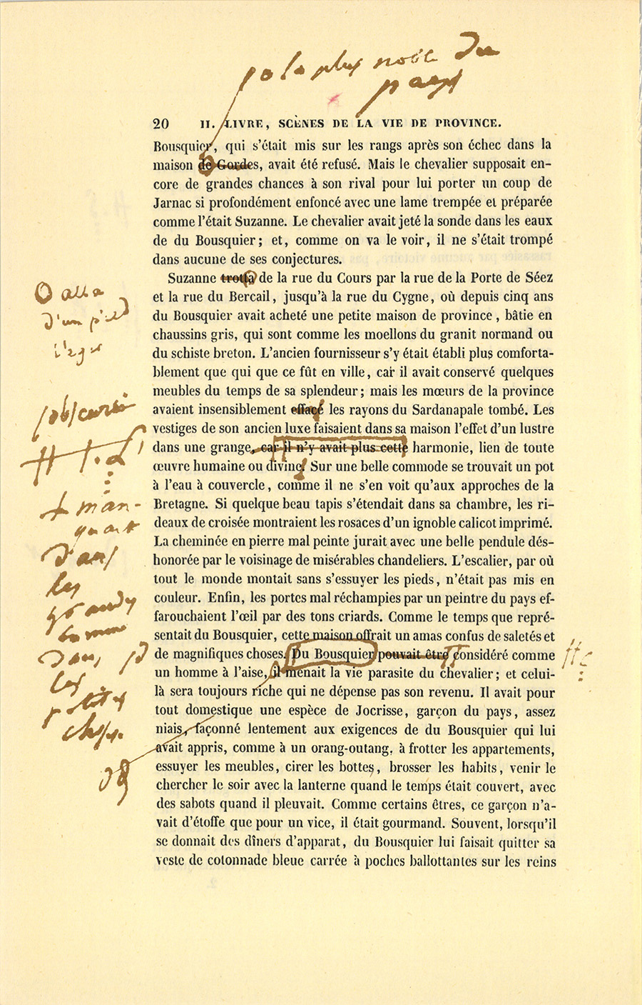 Suzanne alla d’un pied léger de la rue du Cours par la rue de la Porte de Séez et la rue du Bercail, jusqu’à la rue du Cygne, où depuis cinq ans du Bousquier avait acheté une petite maison de province, bâtie en chaussins gris, qui sont comme les moellons du granit normand ou du schiste breton. L’ancien fournisseur s’y était établi plus comfortablement que qui que ce fût en ville, car il avait conservé quelques meubles du temps de sa splendeur ; mais les mœurs de la province avaient insensiblement obscurci les rayons du Sardanapale tombé. Les vestiges de son ancien luxe faisaient dans sa maison l’effet d’un lustre dans une grange. L’harmonie, lien de toute œuvre humaine ou divine, manquait dans les grandes comme dans les petites choses. Sur une belle commode se trouvait un pot à l’eau à couvercle, comme il ne s’en voit qu’aux approches de la Bretagne. Si quelque beau tapis s’étendait dans sa chambre, les rideaux de croisée montraient les rosaces d’un ignoble calicot imprimé. La cheminée en pierre mal peinte jurait avec une belle pendule déshonorée par le voisinage de misérables chandeliers. L’escalier, par où tout le monde montait sans s’essuyer les pieds, n’était pas mis en couleur. Enfin, les portes mal réchampies par un peintre du pays effarouchaient l’œil par des tons criards. Comme le temps que représentait du Bousquier, cette maison offrait un amas confus de saletés et de magnifiques choses. Considéré comme un homme à l’aise, du Bousquier menait la vie parasite du chevalier ; et celui-là sera toujours riche qui ne dépense pas son revenu. Il avait pour tout domestique une espèce de Jocrisse, garçon du pays, assez niais, façonné lentement aux exigences de du Bousquier qui lui avait appris, comme à un orang-outang, à frotter les appartements, essuyer les meubles, cirer les bottes, brosser les habits, venir le chercher le soir avec la lanterne quand le temps était couvert, avec des sabots quand il pleuvait. Comme certains êtres, ce garçon n’avait d’étoffe que pour un vice, il était gourmand. Souvent, lorsqu’il se donnait des dîners d’apparat, du Bousquier lui faisait quitter sa veste de cotonnade bleue carrée à poches ballottantes sur les reins {p. 21} et toujours grosses d’un mouchoir, d’un eustache, d’un fruit ou d’un casse-museau, il lui faisait endosser un habillement d’ordonnance, et l’emmenait pour servir. René s’empiffrait alors avec les domestiques. Cette obligation que du Bousquier avait tournée en récompense lui valait la plus absolue discrétion de son domestique breton.
