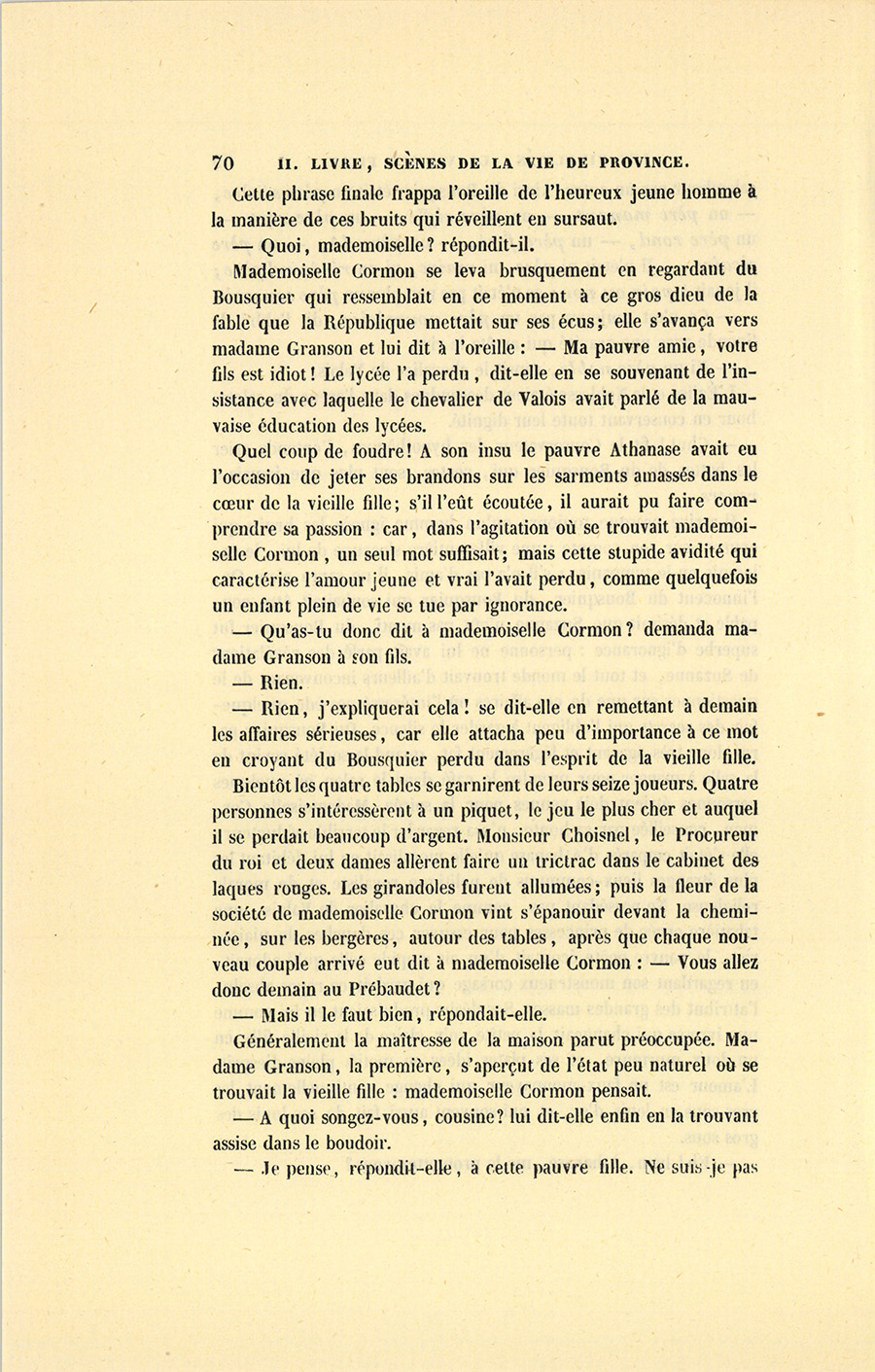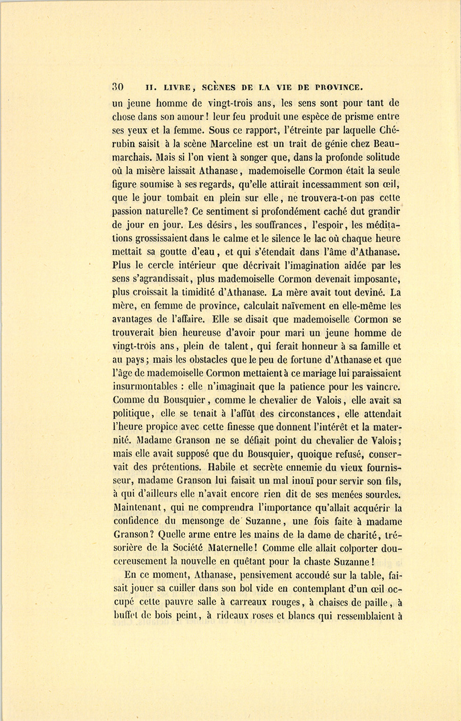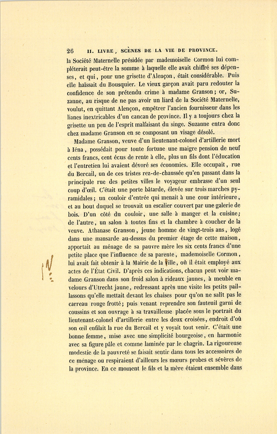 Madame Granson, veuve d’un lieutenant-colonel d’artillerie mort à Iéna, possédait pour toute fortune une maigre pension de neuf cents francs, cent écus de rente à elle, plus un fils dont l’éducation et l’entretien lui avaient dévoré ses économies. Elle occupait, rue du Bercail, un de ces tristes rez-de-chaussée qu’en passant dans la principale rue des petites villes le voyageur embrasse d’un seul coup d’œil. C’était une porte bâtarde, élevée sur trois marches pyramidales ; un couloir d’entrée qui menait à une cour intérieure, et au bout duquel se trouvait un escalier couvert par une galerie de bois. D’un côté du couloir, une salle à manger et la cuisine ; de l’autre, un salon à toutes fins et la chambre à coucher de la veuve. Athanase Granson, jeune homme de vingt-trois ans, logé dans une mansarde au-dessus du premier étage de cette maison, apportait au ménage de sa pauvre mère les six cents francs d’une petite place que l’influence de sa parente, mademoiselle Cormon, lui avait fait obtenir à la Mairie de la Ville, où il était employé aux actes de l’État Civil. D’après ces indications, chacun peut voir madame Granson dans son froid salon à rideaux jaunes, à meuble en velours d’Utrecht jaune, redressant après une visite les petits paillassons qu’elle mettait devant les chaises pour qu’on ne salît pas le carreau rouge frotté ; puis venant reprendre son fauteuil garni de coussins et son ouvrage à sa travailleuse placée sous le portrait du lieutenant-colonel d’artillerie entre les deux croisées, endroit d’où son œil enfilait la rue du Bercail et y voyait tout venir. C’était une bonne femme, mise avec une simplicité bourgeoise, en harmonie avec sa figure pâle et comme laminée par le chagrin. La rigoureuse modestie de la pauvreté se faisait sentir dans tous les accessoires de ce ménage où respiraient d’ailleurs les mœurs probes et sévères de la province. En ce moment le fils et la mère étaient ensemble dans {p. 27} la salle à manger, où ils déjeunaient d’une tasse de café accompagnée de beurre et de radis. Pour faire comprendre le plaisir que la visite de Suzanne allait causer à madame Granson, il faut expliquer les secrets intérêts de la mère et du fils.