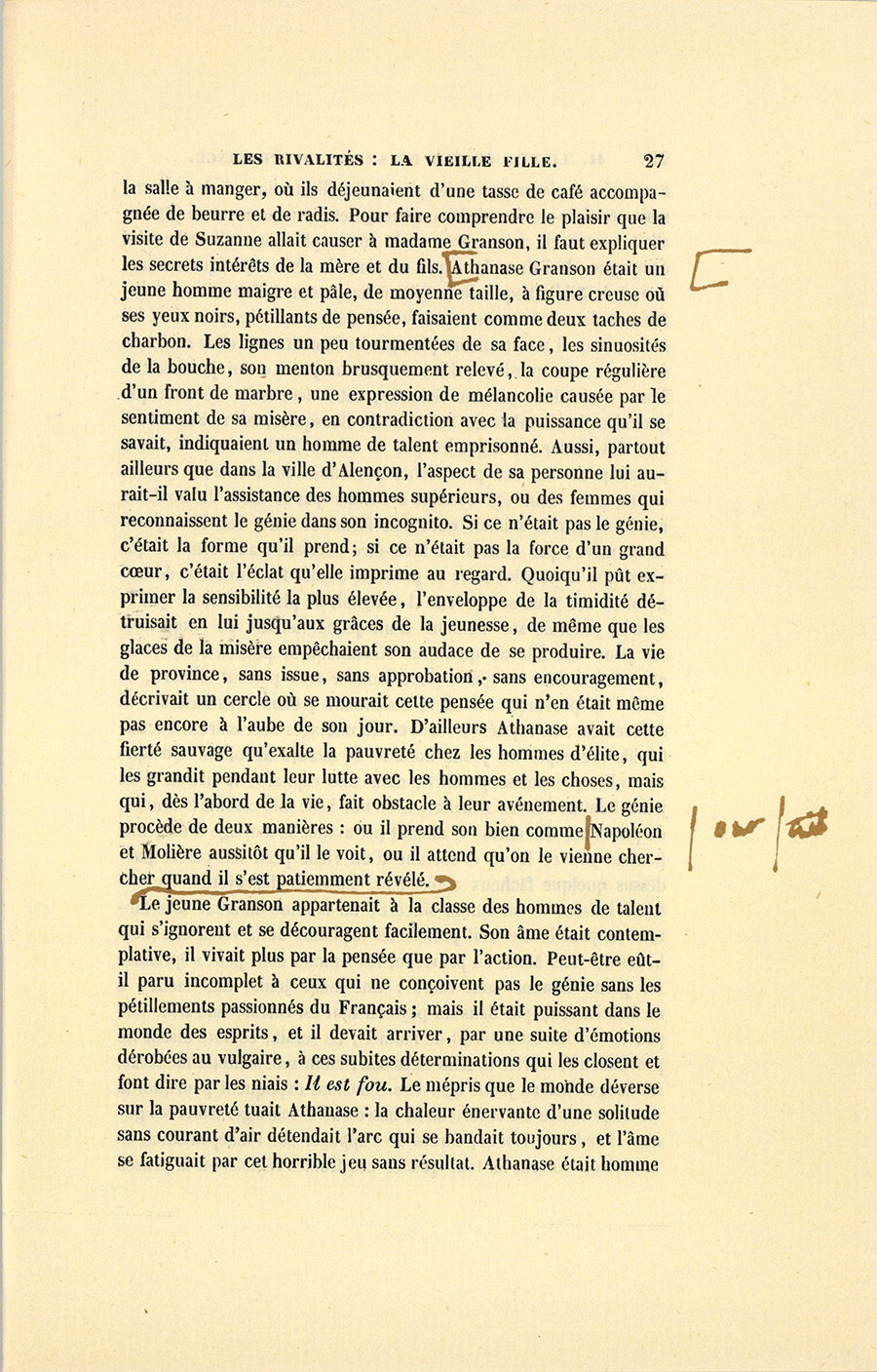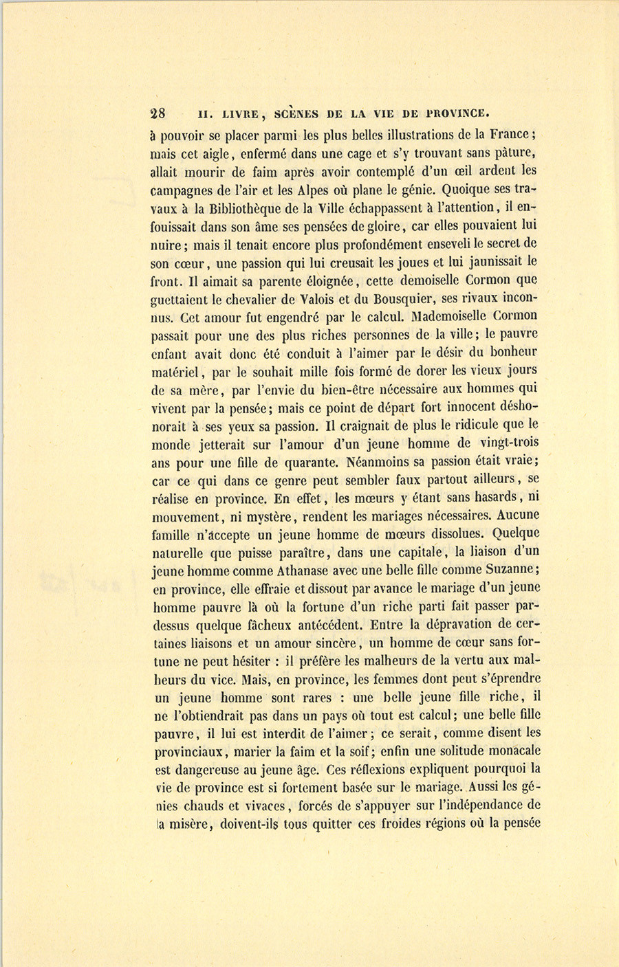 Athanase Granson était un jeune homme maigre et pâle, de moyenne taille, à figure creuse où ses yeux noirs, pétillants de pensée, faisaient comme deux taches de charbon. Les lignes un peu tourmentées de sa face, les sinuosités de la bouche, son menton brusquement relevé, la coupe régulière d’un front de marbre, une expression de mélancolie causée par le sentiment de sa misère, en contradiction avec la puissance qu’il se savait, indiquaient un homme de talent emprisonné. Aussi, partout ailleurs que dans la ville d’Alençon, l’aspect de sa personne lui aurait-il valu l’assistance des hommes supérieurs, ou des femmes qui reconnaissent le génie dans son incognito. Si ce n’était pas le génie, c’était la forme qu’il prend ; si ce n’était pas la force d’un grand cœur, c’était l’éclat qu’elle imprime au regard. Quoiqu’il pût exprimer la sensibilité la plus élevée, l’enveloppe de la timidité détruisait en lui jusqu’aux grâces de la jeunesse, de même que les glaces de la misère empêchaient son audace de se produire. La vie de province, sans issue, sans approbation, sans encouragement, décrivait un cercle où se mourait cette pensée qui n’en était même pas encore à l’aube de son jour. D’ailleurs Athanase avait cette fierté sauvage qu’exalte la pauvreté chez les hommes d’élite, qui les grandit pendant leur lutte avec les hommes et les choses, mais qui, dès l’abord de la vie, fait obstacle à leur avénement. Le génie procède de deux manières : ou il prend son bien comme ont fait Napoléon et Molière aussitôt qu’il le voit, ou il attend qu’on le vienne chercher quand il s’est patiemment révélé. Le jeune Granson appartenait à la classe des hommes de talent qui s’ignorent et se découragent facilement. Son âme était contemplative, il vivait plus par la pensée que par l’action. Peut-être eût-il paru incomplet à ceux qui ne conçoivent pas le génie sans les pétillements passionnés du Français ; mais il était puissant dans le monde des esprits, et il devait arriver, par une suite d’émotions dérobées au vulgaire, à ces subites déterminations qui les closent et font dire par les niais : Il est fou. Le mépris que le monde déverse sur la pauvreté tuait Athanase : la chaleur énervante d’une solitude sans courant d’air détendait l’arc qui se bandait toujours, et l’âme se fatiguait par cet horrible jeu sans résultat. Athanase était homme {p. 28} à pouvoir se placer parmi les plus belles illustrations de la France ; mais cet aigle, enfermé dans une cage et s’y trouvant sans pâture, allait mourir de faim après avoir contemplé d’un œil ardent les campagnes de l’air et les Alpes où plane le génie. Quoique ses travaux à la Bibliothèque de la Ville échappassent à l’attention, il enfouissait dans son âme ses pensées de gloire, car elles pouvaient lui nuire ; mais il tenait encore plus profondément enseveli le secret de son cœur, une passion qui lui creusait les joues et lui jaunissait le front. Il aimait sa parente éloignée, cette demoiselle Cormon que guettaient le chevalier de Valois et du Bousquier, ses rivaux inconnus. Cet amour fut engendré par le calcul. Mademoiselle Cormon passait pour une des plus riches personnes de la ville ; le pauvre enfant avait donc été conduit à l’aimer par le désir du bonheur matériel, par le souhait mille fois formé de dorer les vieux jours de sa mère, par l’envie du bien-être nécessaire aux hommes qui vivent par la pensée ; mais ce point de départ fort innocent déshonorait à ses yeux sa passion. Il craignait de plus le ridicule que le monde jetterait sur l’amour d’un jeune homme de vingt-trois ans pour une fille de quarante. Néanmoins sa passion était vraie ; car ce qui dans ce genre peut sembler faux partout ailleurs, se réalise en province. En effet, les mœurs y étant sans hasards, ni mouvement, ni mystère, rendent les mariages nécessaires. Aucune famille n’accepte un jeune homme de mœurs dissolues. Quelque naturelle que puisse paraître, dans une capitale, la liaison d’un jeune homme comme Athanase avec une belle fille comme Suzanne ; en province, elle effraie et dissout par avance le mariage d’un jeune homme pauvre là où la fortune d’un riche parti fait passer par-dessus quelque fâcheux antécédent. Entre la dépravation de certaines liaisons et un amour sincère, un homme de cœur sans fortune ne peut hésiter : il préfère les malheurs de la vertu aux malheurs du vice. Mais, en province, les femmes dont peut s’éprendre un jeune homme sont rares : une belle jeune fille riche, il ne l’obtiendrait pas dans un pays où tout est calcul ; une belle fille pauvre, il lui est interdit de l’aimer ; ce serait, comme disent les provinciaux, marier la faim et la soif ; enfin une solitude monacale est dangereuse au jeune âge. Ces réflexions expliquent pourquoi la vie de province est si fortement basée sur le mariage. Aussi les génies chauds et vivaces, forcés de s’appuyer sur l’indépendance de la misère, doivent-ils tous quitter ces froides régions où la pensée {p. 29} est persécutée par une brutale indifférence, où pas une femme ne peut ni ne veut se faire sœur de charité auprès d’un homme de science ou d’art. Qui se rendra compte de la passion d’Athanase pour mademoiselle Cormon ? Ce ne sera ni les gens riches, ces sultans de la société qui y trouvent des harems, ni les bourgeois qui suivent la grande route battue par les préjugés, ni les femmes qui, ne voulant rien concevoir aux passions des artistes, leur imposent le talion de leurs vertus, en s’imaginant que les deux sexes se gouvernent par les mêmes lois. Ici, peut-être, faut-il en appeler aux jeunes gens souffrant de leurs premiers désirs réprimés au moment où toutes leurs forces se tendent, aux artistes malades de leur génie étouffé par les étreintes de la mis