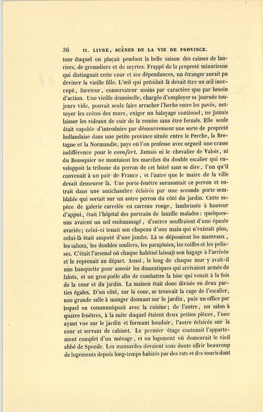 Bâtie sous Henri IV par Pierre Cormon, intendant du dernier duc d’Alençon, la maison où demeurait mademoiselle Cormon avait toujours appartenu à sa famille, et parmi tous ses biens visibles, celui-là stimulait particulièrement la convoitise de ses deux vieux amants. Cependant loin de donner des revenus, ce logis était une cause de dépense ; mais il est si rare de trouver dans une ville de province une demeure placée au centre, sans méchant voisinage, belle au dehors, commode à l’intérieur, que tout Alençon partageait cette envie. Ce vieil hôtel était situé précisément au milieu de la rue du Val-Noble, appelée par corruption le Val-Noble, sans doute à cause du pli que fait dans le terrain la Brillante, petit cours d’eau qui traverse Alençon. Cette maison est remarquable par la forte architecture que produisit Marie de Médicis. Quoique bâtie en granit, pierre qui se travaille difficilement, ses angles, les encadrements des fenêtres et ceux des portes sont décorés par des bossages taillés en pointes de diamant. Elle se compose d’un étage au-dessus d’un rez-de-chaussée ; son toit extrêmement élevé présente des croisées saillantes à tympans sculptés, assez élégamment encastrées dans le chéneau doublé de plomb, extérieurement orné par des balustres. Entre chacune de ces croisées s’avance une gargouille figurant une gueule fantastique d’animal sans corps qui vomit les eaux sur de grandes pierres percées de cinq trous. Les deux pignons sont terminés par des bouquets en plomb, symbole de bourgeoisie, car aux nobles seuls appartenait autrefois le droit d’avoir des girouettes. Du côté de la cour, à droite, sont les remises et les écuries ; à gauche, la cuisine, le bûcher et la buanderie. Un des battants de la porte cochère restait ouvert et garni d’une petite porte basse, à claire-voie et à sonnette, qui permettait aux passants de voir, au milieu d’une vaste cour, une corbeille de fleurs dont les terres amoncelées étaient retenues par une petite haie de troëne. Quelques rosiers des quatre saisons, des giroflées, des scabieuses, des lis et des genêts d’Espagne composaient le massif, {p. 36} autour duquel on plaçait pendant la belle saison des caisses de lauriers, de grenadiers et de myrtes. Frappé de la propreté minutieuse qui distinguait cette cour et ses dépendances, un étranger aurait pu deviner la vieille fille. L’œil qui présidait là devait être un œil inoccupé, fureteur, conservateur moins par caractère que par besoin d’action. Une vieille demoiselle, chargée d’employer sa journée toujours vide, pouvait seule faire arracher l’herbe entre les pavés, nettoyer les crêtes des murs, exiger un balayage continuel, ne jamais laisser les rideaux de cuir de la remise sans être fermés. Elle seule était capable d’introduire par désœuvrement une sorte de propreté hollandaise dans une petite province située entre le Perche, la Bretagne et la Normandie, pays où l’on professe avec orgueil une crasse indifférence pour le comfort. Jamais ni le chevalier de Valois, ni du Bousquier ne montaient les marches du double escalier qui enveloppait la tribune du perron de cet hôtel sans se dire, l’un qu’il convenait à un pair de France, et l’autre que le maire de la ville devait demeurer là. Une porte-fenêtre surmontait ce perron et entrait dans une antichambre éclairée par une seconde porte semblable qui sortait sur un autre perron du côté du jardin. Cette espèce de galerie carrelée en carreau rouge, lambrissée à hauteur d’appui, était l’hôpital des portraits de famille malades : quelques-uns avaient un œil endommagé, d’autres souffraient d’une épaule avariée ; celui-ci tenait son chapeau d’une main qui n’existait plus, celui-là était amputé d’une jambe. Là se déposaient les manteaux, les sabots, les doubles souliers, les parapluies, les coiffes et les pelisses. C’était l’arsenal où chaque habitué laissait son bagage à l’arrivée et le reprenait au départ. Aussi, le long de chaque mur y avait-il une banquette pour asseoir les domestiques qui arrivaient armés de falots, et un gros poêle afin de combattre la bise qui venait à la fois de la cour et du jardin. La maison était donc divisée en deux parties égales. D’un côté, sur la cour, se trouvait la cage de l’escalier, une grande salle à manger donnant sur le jardin, puis un office par lequel on communiquait avec la cuisine ; de l’autre, un salon à quatre fenêtres, à la suite duquel étaient deux petites pièces, l’une ayant vue sur le jardin et formant boudoir, l’autre éclairée sur la cour et servant de cabinet. Le premier étage contenait l’appartement complet d’un ménage, et un logement où demeurait le vieil abbé de Sponde. Les mansardes devaient sans doute offrir beaucoup de logements depuis long-temps habités par des rats et des souris dont {p. 37} les hauts-faits nocturnes étaient redits par mademoiselle Cormon au chevalier de Valois, en s’étonnant de l’inutilité des moyens employés contre eux. Le jardin, d’environ un demi-arpent, est margé par la Brillante, ainsi nommée à cause des parcelles de mica qui paillettent son lit ; mais partout ailleurs que dans le Val-Noble où ses eaux maigres sont chargées de teintures et des débris qu’y jettent les industries de la ville. La rive opposée au jardin de mademoiselle Cormon est encombrée, comme dans toutes les villes de province où passe un cours d’eau, de maisons où s’exercent des professions altérées ; mais par bonheur elle n’avait alors en face d’elle que des gens tranquilles, des bourgeois, un boulanger, un dégraisseur, des ébénistes. Ce jardin, plein de fleurs communes, est terminé naturellement par une terrasse formant un quai, au bas de laquelle se trouvent quelques marches pour descendre à la Brillante. Sur la balustrade de la terrasse imaginez de grands vases en fa