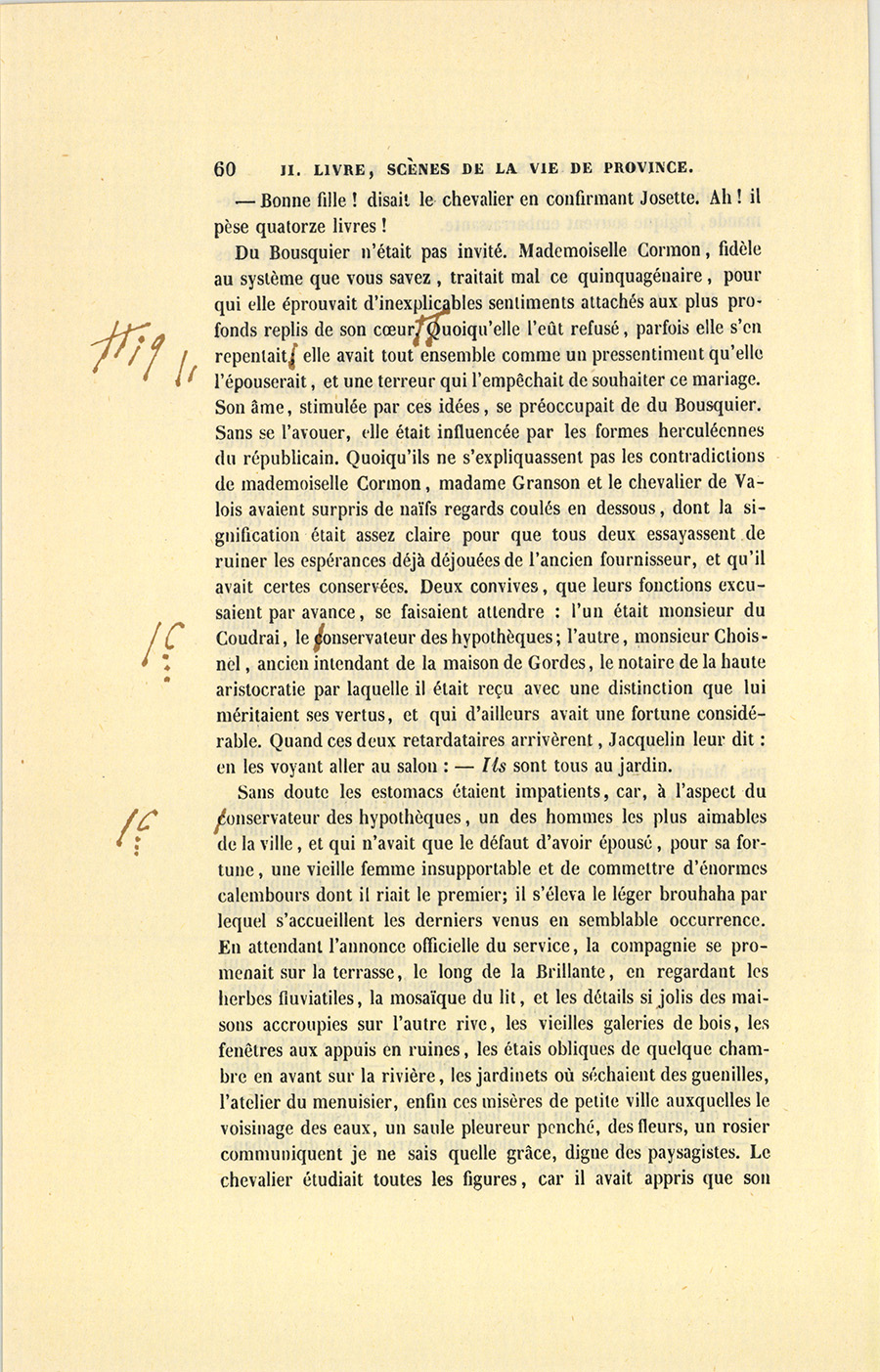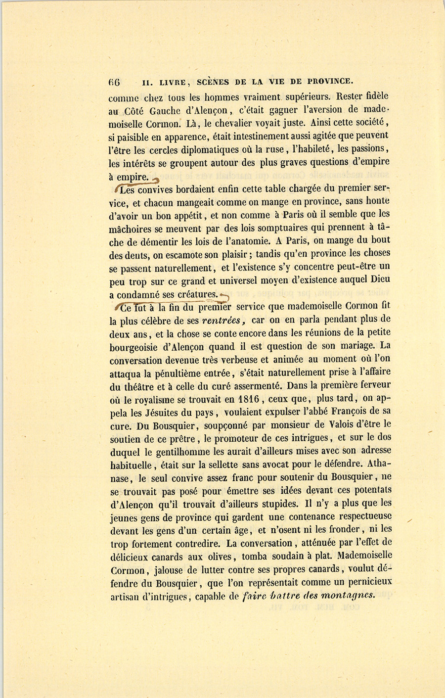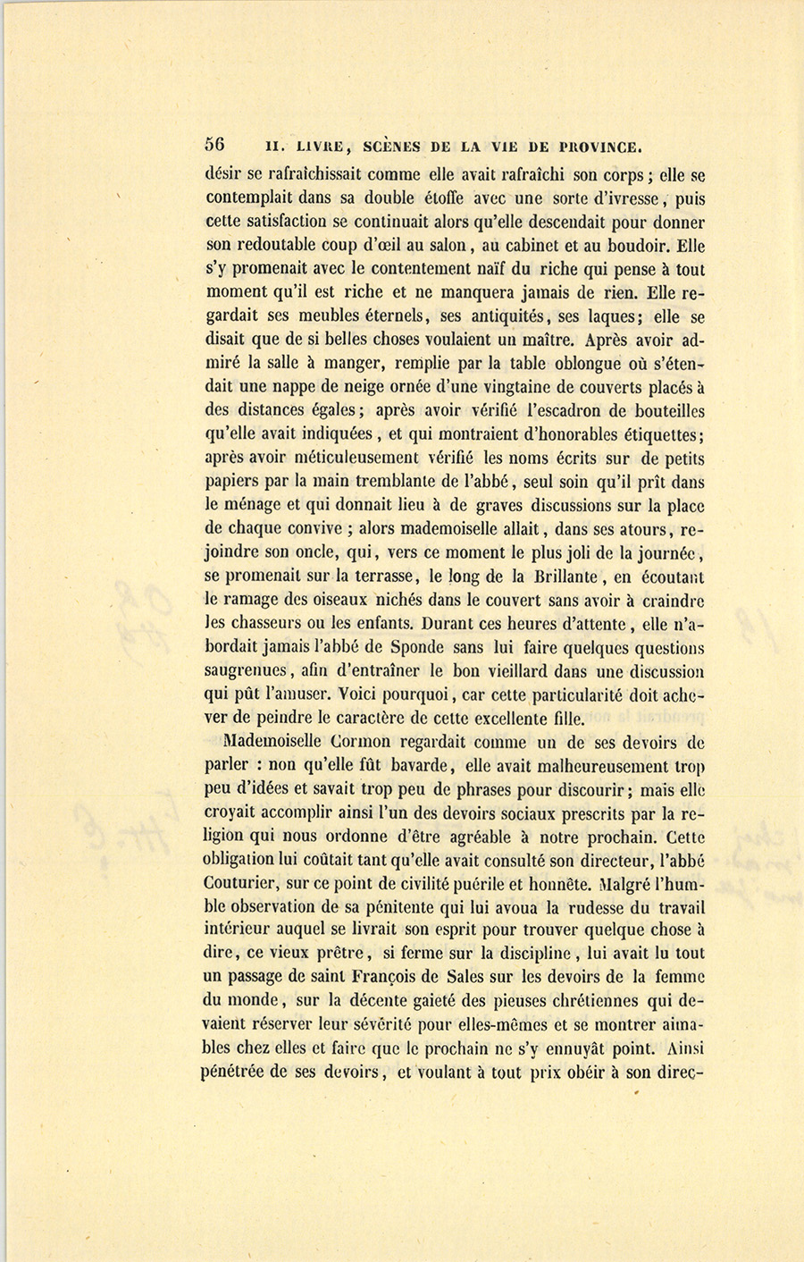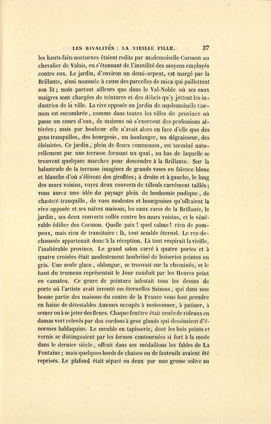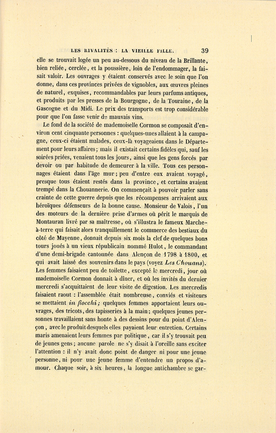 Les touristes de la Bretagne et de la Normandie, du Maine et de l’Anjou, doivent avoir tous vu, dans les capitales de ces provinces, une maison qui ressemblait plus ou moins à l’hôtel des Cormon ; car il est, dans son genre, un archétype des maisons bourgeoises d’une grande partie de la France, et mérite d’autant mieux sa place dans cet ouvrage qu’il explique des mœurs, et représente des idées. Qui ne sent déjà combien la vie était calme et routinière dans ce vieil édifice ? Il y existait une bibliothèque, mais {p. 39} elle se trouvait logée un peu au-dessous du niveau de la Brillante, bien reliée, cerclée, et la poussière, loin de l’endommager, la faisait valoir. Les ouvrages y étaient conservés avec le soin que l’on donne, dans ces provinces privées de vignobles, aux œuvres pleines de naturel, exquises, recommandables par leurs parfums antiques, et produits par les presses de la Bourgogne, de la Touraine, de la Gascogne et du Midi. Le prix des transports est trop considérable pour que l’on fasse venir de mauvais vins.