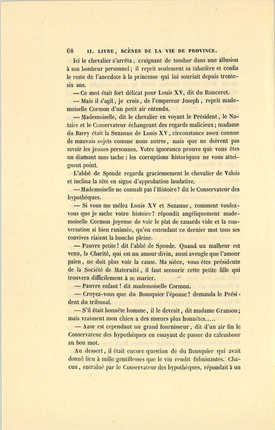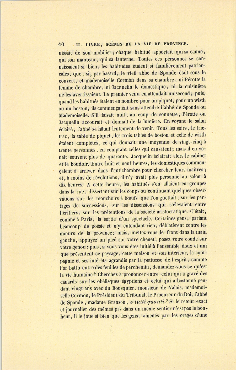 Le fond de la société de mademoiselle Cormon se composait d’environ cent cinquante personnes : quelques-unes allaient à la campagne, ceux-ci étaient malades, ceux-là voyageaient dans le Département pour leurs affaires ; mais il existait certains fidèles qui, sauf les soirées priées, venaient tous les jours, ainsi que les gens forcés par devoir ou par habitude de demeurer à la ville. Tous ces personnages étaient dans l’âge mûr8 ; peu d’entre eux avaient voyagé, presque tous étaient restés dans la province, et certains avaient trempé dans la Chouannerie. On commençait à pouvoir parler sans crainte de cette guerre depuis que les récompenses arrivaient aux héroïques défenseurs de la bonne cause. Monsieur de Valois, l’un des moteurs de la dernière prise d’armes où périt le marquis de Montauran livré par sa maîtresse, où s’illustra le fameux Marche-à-terre qui faisait alors tranquillement le commerce des bestiaux du côté de Mayenne, donnait depuis six mois la clef de quelques bons tours joués à un vieux républicain nommé Hulot, le commandant d’une demi-brigade cantonnée dans Alençon de 1798 à 1800, et qui avait laissé des souvenirs dans le pays (voyez Les Chouans). Les femmes faisaient peu de toilette, excepté le mercredi, jour où mademoiselle Cormon donnait à dîner, et où les invités du dernier mercredi s’acquittaient de leur visite de digestion. Les mercredis faisaient raout : l’assemblée était nombreuse, conviés et visiteurs se mettaient in fiocchi ; quelques femmes apportaient leurs ouvrages, des tricots, des tapisseries à la main ; quelques jeunes personnes travaillaient sans honte à des dessins pour du point d’Alençon, avec le produit desquels elles payaient leur entretien. Certains maris amenaient leurs femmes par politique, car il s’y trouvait peu de jeunes gens ; aucune parole ne s’y disait à l’oreille sans exciter l’attention : il n’y avait donc point de danger ni pour une jeune personne, ni pour une jeune femme d’entendre un propos d’amour. Chaque soir, à six heures, la longue antichambre se {p. 40} garnissait de son mobilier ; chaque habitué apportait qui sa canne, qui son manteau, qui sa lanterne. Toutes ces personnes se connaissaient si bien, les habitudes étaient si familièrement patriarcales, que, si, par hasard, le vieil abbé de Sponde était sous le couvert, et mademoiselle Cormon dans sa chambre, ni Pérotte la femme de chambre, ni Jacquelin le domestique, ni la cuisinière ne les avertissaient. Le premier venu en attendait un second ; puis, quand les habitués étaient en nombre pour un piquet, pour un wisth ou un boston, ils commençaient sans attendre l’abbé de Sponde ou Mademoiselle. S’il faisait nuit, au coup de sonnette, Pérotte ou Jacquelin accourait et donnait de la lumière. En voyant le salon éclairé, l’abbé se hâtait lentement de venir. Tous les soirs, le trictrac, la table de piquet, les trois tables de boston et celle de wisth étaient complètes, ce qui donnait une moyenne de vingt-cinq à trente personnes, en comptant celles qui causaient ; mais il en venait souvent plus de quarante. Jacquelin éclairait alors le cabinet et le boudoir. Entre huit et neuf heures, les domestiques commençaient à arriver dans l’antichambre pour chercher leurs maîtres ; et, à moins de révolutions, il n’y avait plus personne au salon à dix heures. À cette heure, les habitués s’en allaient en groupes dans la rue, dissertant sur les coups ou continuant quelques observations sur les mouchoirs à bœufs que l’on guettait, sur les partages de successions, sur les dissensions qui s’élevaient entre héritiers, sur les prétentions de la société aristocratique. C’était, comme à Paris, la sortie d’un spectacle. Certaines gens, parlant beaucoup de poésie et n’y entendant rien, déblatèrent contre les mœurs de la province ; mais, mettez-vous le front dans la main gauche, appuyez un pied sur votre chenet, posez votre coude sur votre genou ; puis, si vous vous êtes initié à l’ensemble doux et uni que présentent ce paysage, cette maison et son intérieur, la compagnie et ses intérêts agrandis par la petitesse de l’esprit, comme l’or battu entre des feuilles de parchemin, demandez-vous ce qu’est la vie humaine ? Cherchez à prononcer entre celui qui a gravé des canards sur les obélisques égyptiens et celui qui a bostonné pendant vingt ans avec du Bousquier, monsieur de Valois, mademoiselle Cormon, le Président du Tribunal, le Procureur du Roi, l’abbé de Sponde, madame Granson, e tutti quanti ? Si le retour exact et journalier des mêmes pas dans un même sentier n’est pas le bonheur, il le joue si bien que les gens, amenés par les orages d’une {p. 41} vie agitée à réfléchir sur les bienfaits du calme, diront que là était le bonheur. Pour chiffrer l’importance du salon de mademoiselle Cormon, il suffira de dire que, statisticien né de la société, du Bousquier avait calculé que les personnes qui le hantaient possédaient cent trente et une voix au Collége électoral et réunissaient dix-huit cent mille livres de rente en fonds de terre dans la province. La ville d’Alençon n’était cependant pas entièrement représentée par ce salon, la haute compagnie aristocratique avait le sien, puis le salon du Receveur-Général était comme une auberge administrative due par le gouvernement où toute la société dansait, intriguait, papillonnait, aimait et soupait. Ces deux autres salons communiquaient au moyen de quelques personnes mixtes avec la maison Cormon, et vice versâ ; mais le salon Cormon jugeait sévèrement ce qui se passait dans ces deux autres camps : on y critiquait le luxe des dîners, on y ruminait les glaces des bals, on discutait la conduite des femmes, les toilettes, les inventions nouvelles qui s’y produisaient.