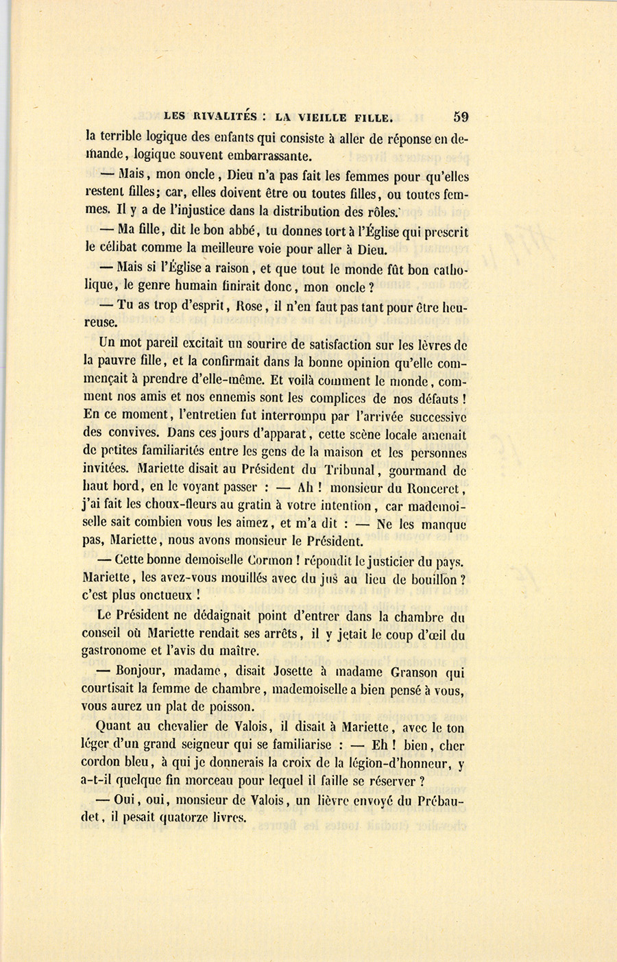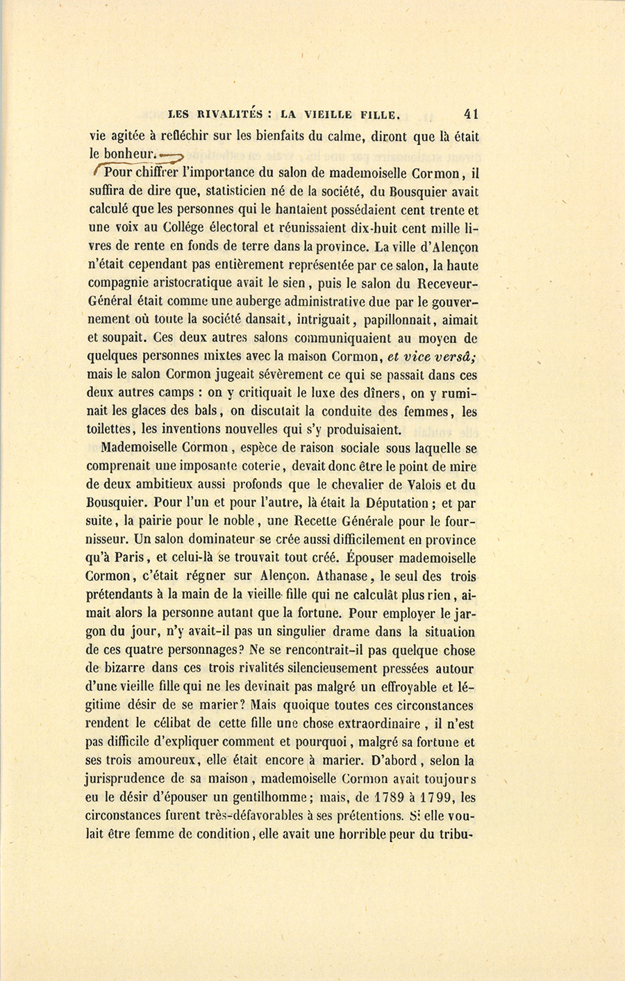 En France, dans presque toutes les Préfectures du second ordre, il existe un salon où se réunissent des personnes considérables et considérées, qui néanmoins ne sont pas encore la crème de la société. Le maître et la maîtresse de la maison comptent bien parmi les sommités de la ville et sont reçus partout où il leur plaît d’aller, il ne se donne pas en ville une fête, un dîner diplomatique, qu’ils n’y soient invités ; mais les gens à châteaux, les pairs qui possèdent de belles terres, la grande compagnie du Département ne vient pas chez eux, et reste à leur égard dans les termes d’une visite faite de part et d’autre, d’un dîner ou d’une soirée acceptés et rendus. Ce salon mixte où se rencontrent la petite noblesse à poste {p. 34} fixe, le clergé, la magistrature, exerce une grande influence. La raison et l’esprit du pays résident dans cette société solide et sans faste où chacun connaît les revenus du voisin, où l’on professe une parfaite indifférence du luxe et de la toilette, jugés comme des enfantillages en comparaison d’un mouchoir à bœufs de dix ou douze arpents dont l’acquisition a été couvée pendant des années, et qui a donné lieu à d’immenses combinaisons diplomatiques. Inébranlable dans ses préjugés bons ou mauvais, ce cénacle suit une même voie sans regarder ni en avant ni en arrière. Il n’admet rien de Paris sans un long examen, se refuse aux cachemires aussi bien qu’aux inscriptions sur le Grand-Livre, se moque des nouveautés, ne lit rien et veut tout ignorer : science, littérature, inventions industrielles. Il obtient le changement d’un préfet qui ne convient pas, et si l’administrateur résiste, il l’isole à la manière des abeilles qui couvrent de cire un colimaçon venu dans leur ruche. Enfin, là, les bavardages deviennent souvent de solennels arrêts. Aussi, quoiqu’il ne s’y fasse que des parties de jeu, les jeunes femmes y apparaissent-elles de loin en loin ; elles y viennent chercher une approbation de leur conduite, une consécration de leur importance. Cette suprématie accordée à une maison froisse souvent l’amour-propre de quelques naturels du pays qui se consolent en supputant la dépense qu’elle impose, et dont ils profitent. S’il ne se rencontre pas de fortune assez considérable pour tenir maison ouverte, les gros bonnets choisissent pour lieu de réunion, comme faisaient les gens d’Alençon, la maison d’une personne inoffensive de qui la vie arrêtée, dont le caractère ou la position laisse la société maîtresse chez elle, en ne portant ombrage ni aux vanités, ni aux intérêts de chacun. Ainsi, la haute société d’Alençon se réunissait depuis long-temps chez la vieille fille dont la fortune était à son insu couchée en joue par madame Granson, son arrière-petite-cousine, et par les deux vieux garçons dont les secrètes espérances viennent d’être dévoilées. Cette demoiselle vivait avec son oncle maternel, un ancien Grand-Vicaire de l’Évêché de Séez, autrefois son tuteur, et de qui elle devait hériter. La famille, que représentait alors Rose-Marie-Victoire Cormon, comptait autrefois parmi les plus considérables de la province. Quoique roturière, elle frayait avec la noblesse à laquelle elle s’était souvent alliée, elle avait fourni jadis des intendants aux ducs d’Alençon, force magistrats à la Robe et plusieurs évêques au Clergé. Monsieur de Sponde, le grand-père {p. 35} maternel de mademoiselle Cormon, fut élu par la Noblesse aux États-Généraux, et monsieur Cormon, son père, par le Tiers-État ; mais aucun n’accepta cette mission. Depuis environ cent ans, les filles s’étaient mariées à des nobles de la province, en sorte que cette famille avait si bien tallé dans le Duché, qu’elle y embrassait tous les arbres généalogiques. Nulle bourgeoisie ne ressemblait davantage à la noblesse.