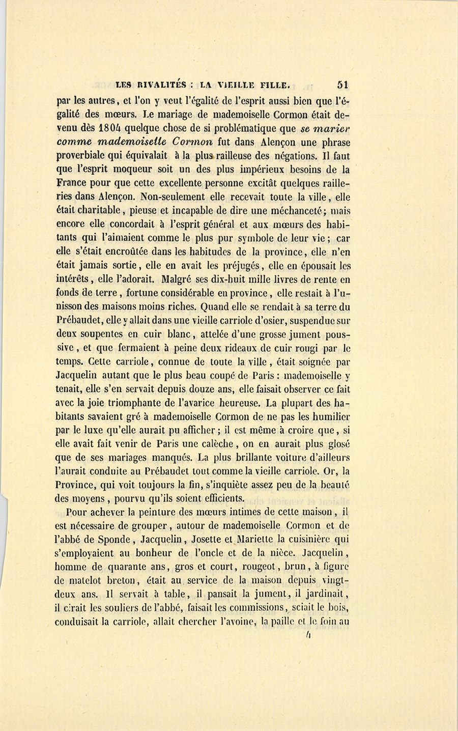 Un mois se passa dans les plus étranges alternatives, relativement au mariage de mademoiselle Cormon. Il y eut un parti d’Incrédules qui nia le mariage, et un parti de Croyants qui l’affirma. Au bout de quinze jours, le parti des Incrédules reçut un vigoureux échec : la maison de du Bousquier fut vendue quarante-trois mille francs à monsieur de Troisville, qui ne voulait qu’une maison fort simple à Alençon ; car il devait aller plus tard à Paris quand la princesse Sherbellof serait décédée : il comptait attendre paisiblement cet héritage en s’occupant à reconstituer sa terre. Ceci semblait positif. Les Incrédules ne se laissèrent pas accabler. Ils prétendirent que, marié ou non, du Bousquier faisait une excellente affaire ; sa maison ne lui était revenue qu’à vingt-sept mille francs. Les Croyants furent battus par cette péremptoire observation des Incrédules. Choisnel, le notaire de mademoiselle Cormon, n’avait pas encore entendu parler du premier mot relativement au contrat, dirent encore les Incrédules. Les Croyants, fermes dans leur foi, remportèrent, le vingtième jour, une victoire signalée sur les Incrédules. Monsieur Lepressoir, notaire des Libéraux, vint chez mademoiselle Cormon où le contrat fut signé. Ce fut le premier des nombreux sacrifices que devait faire mademoiselle Cormon à son mari. Du Bousquier portait une haine profonde à Choisnel ; il lui attribuait le premier refus qu’il avait essuyé de mademoiselle Armande, {p. 98} et le refus de mademoiselle Armande avait, selon lui, dicté celui de mademoiselle Cormon. Le vieil athlète du Directoire fit si bien auprès de la noble fille, qui croyait avoir mal jugé la belle âme du fournisseur, qu’elle voulut expier ses torts : elle sacrifia son notaire à l’amour ! néanmoins, elle lui communiqua le contrat, et Choisnel, qui était un homme digne de Plutarque, défendit par écrit les intérêts de mademoiselle Cormon. Cette circonstance seule faisait traîner le mariage en longueur. Mademoiselle Cormon reçut plusieurs lettres anonymes. Elle apprit, à son grand étonnement, que Suzanne était une fille aussi vierge qu’elle pouvait l’être elle-même, et que le séducteur au faux toupet ne devait jamais se trouver pour quelque chose en de pareilles aventures. Mademoiselle Cormon dédaigna les lettres anonymes ; mais elle écrivit à Suzanne, dans le but d’éclairer la religion de la Société de Maternité. Suzanne, qui sans doute avait appris le futur mariage de du Bousquier, avoua sa ruse, envoya mille francs à l’Association, et desservit fortement le vieux fournisseur. Mademoiselle Cormon convoqua la Société de Maternité, qui tint une séance extraordinaire, où l’on prit un arrêté portant que le bureau ne secourrait plus les malheurs à échoir, mais uniquement ceux échus. Nonobstant ces menées qui défrayaient la ville de cancans distillés avec friandise, les bans se publiaient aux Églises et à la Mairie. Athanase dut préparer les actes. Par mesure de pudeur publique et de sûreté générale, la fiancée alla au Prébaudet où du Bousquier, flanqué d’atroces et somptueux bouquets, se rendait le matin et revenait pour dîner, le soir. Enfin, par une pluvieuse et triste journée de juin, à midi, le mariage entre mademoiselle Cormon et le sieur du Bousquier, disaient les Incrédules, eut lieu à la paroisse d’Alençon, à la vue de tout Alençon. Les époux se rendirent de chez eux à la Mairie, de la Mairie à l’église dans une calèche, magnifique pour Alençon, que du Bousquier avait fait venir de Paris en secret. La perte de la vieille carriole fut aux yeux de toute la ville une espèce de calamité. Le sellier de la Porte de Séez jeta les hauts cris, car il perdait cinquante francs de rente que lui rapportaient les raccommodages. Alençon vit avec effroi le luxe s’introduisant dans la ville par la maison Cormon. Chacun craignit le renchérissement des denrées, l’exhaussement du prix des loyers, et l’invasion des mobiliers parisiens. Il y eut des personnes assez piquées de curiosité pour donner quelque dix sous à Jacquelin afin de regarder de près la calèche {p. 99} attentatoire à l’économie du pays. Les deux chevaux achetés en Normandie effrayèrent aussi beaucoup.