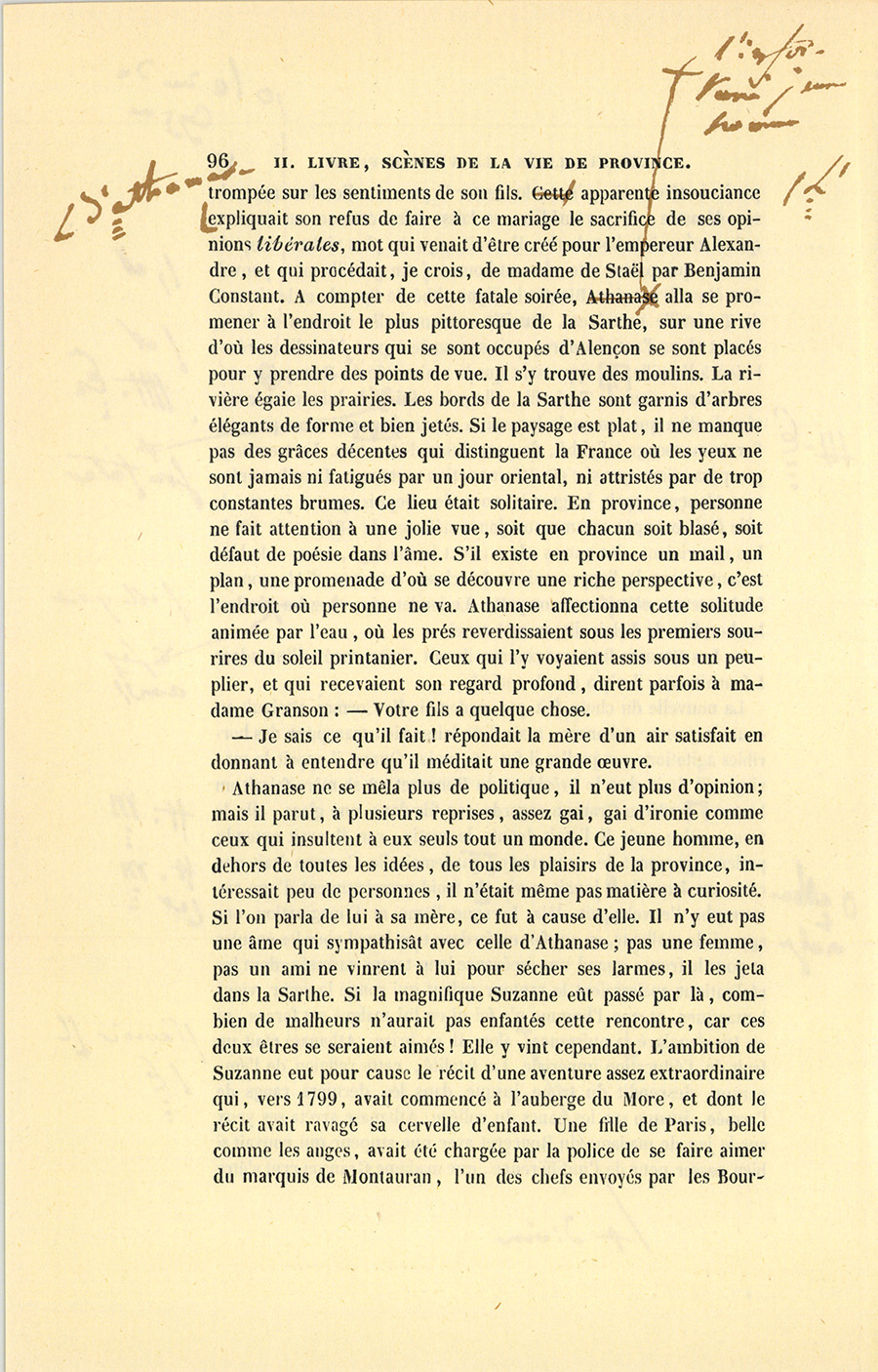 Athanase ne se mêla plus de politique, il n’eut plus d’opinion ; mais il parut, à plusieurs reprises, assez gai, gai d’ironie comme ceux qui insultent à eux seuls tout un monde. Ce jeune homme, en dehors de toutes les idées, de tous les plaisirs de la province, intéressait peu de personnes, il n’était même pas matière à curiosité. Si l’on parla de lui à sa mère, ce fut à cause d’elle. Il n’y eut pas une âme qui sympathisât avec celle d’Athanase ; pas une femme, pas un ami ne vinrent à lui pour sécher ses larmes, il les jeta dans la Sarthe. Si la magnifique Suzanne eût passé par là, combien de malheurs n’aurait pas enfantés cette rencontre, car ces deux êtres se seraient aimés ! Elle y vint cependant. L’ambition de Suzanne eut pour cause le récit d’une aventure assez extraordinaire qui, vers 1799, avait commencé à l’auberge du More, et dont le récit avait ravagé sa cervelle d’enfant. Une fille de Paris, belle comme les anges, avait été chargée par la police de se faire aimer du marquis de Montauran, l’un des chefs envoyés par les {p. 97} Bourbons pour commander les Chouans ; elle l’avait rencontré précisément à l’auberge du More au retour de son expédition de Mortagne : elle l’avait séduit et l’avait livré. Cette fantastique personne, ce pouvoir de la beauté sur l’homme, tout dans l’affaire de Marie de Verneuil et du marquis de Montauran, éblouit Suzanne ; elle éprouva dès l’âge de raison un désir de se jouer des hommes. Quelques mois après sa fuite, elle ne se refusa donc pas à traverser sa ville natale pour aller en Bretagne avec un artiste. Elle voulut voir Fougères où s’était dénouée l’aventure du marquis de Montauran, et parcourir le théâtre de cette guerre pittoresque dont les tragédies, encore peu connues, avaient bercé son jeune âge. Puis elle désirait traverser Alençon dans un si brillant entourage et si bien métamorphosée que personne ne la reconnût. Elle comptait en un seul moment mettre sa mère à l’abri du malheur, et délicatement envoyer au pauvre Athanase la somme qui, dans notre époque, est pour le génie ce qu’était, au Moyen-âge, le cheval de combat et l’armure que Rebecca procure à Ivanhoé.