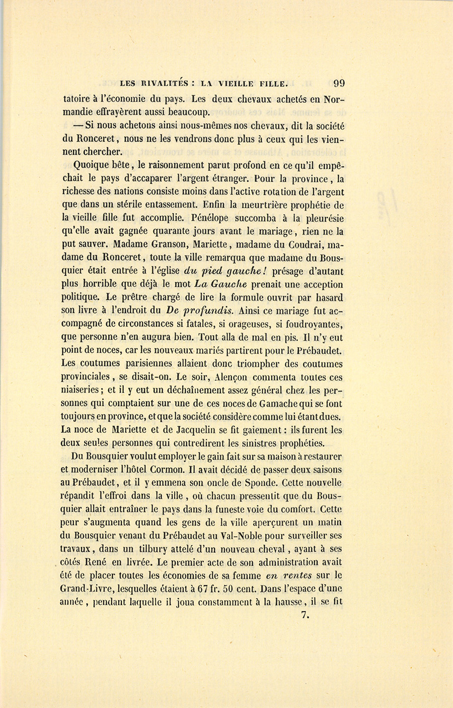 Quoique bête, le raisonnement parut profond en ce qu’il empêchait le pays d’accaparer l’argent étranger. Pour la province, la richesse des nations consiste moins dans l’active rotation de l’argent que dans un stérile entassement. Enfin la meurtrière prophétie de la vieille fille fut accomplie. Pénélope succomba à la pleurésie qu’elle avait gagnée quarante jours avant le mariage, rien ne la put sauver. Madame Granson, Mariette, madame du Coudrai, madame du Ronceret, toute la ville remarqua que madame du Bousquier était entrée à l’église du pied gauche ! présage d’autant plus horrible que déjà le mot La Gauche prenait une acception politique. Le prêtre chargé de lire la formule ouvrit par hasard son livre à l’endroit du De profundis. Ainsi ce mariage fut accompagné de circonstances si fatales, si orageuses, si foudroyantes, que personne n’en augura bien. Tout alla de mal en pis. Il n’y eut point de noces, car les nouveaux mariés partirent pour le Prébaudet. Les coutumes parisiennes allaient donc triompher des coutumes provinciales, se disait-on. Le soir, Alençon commenta toutes ces niaiseries ; et il y eut un déchaînement assez général chez les personnes qui comptaient sur une de ces noces de Gamache qui se font toujours en province, et que la société considère comme lui étant dues. La noce de Mariette et de Jacquelin se fit gaiement : ils furent les deux seules personnes qui contredirent les sinistres prophéties.