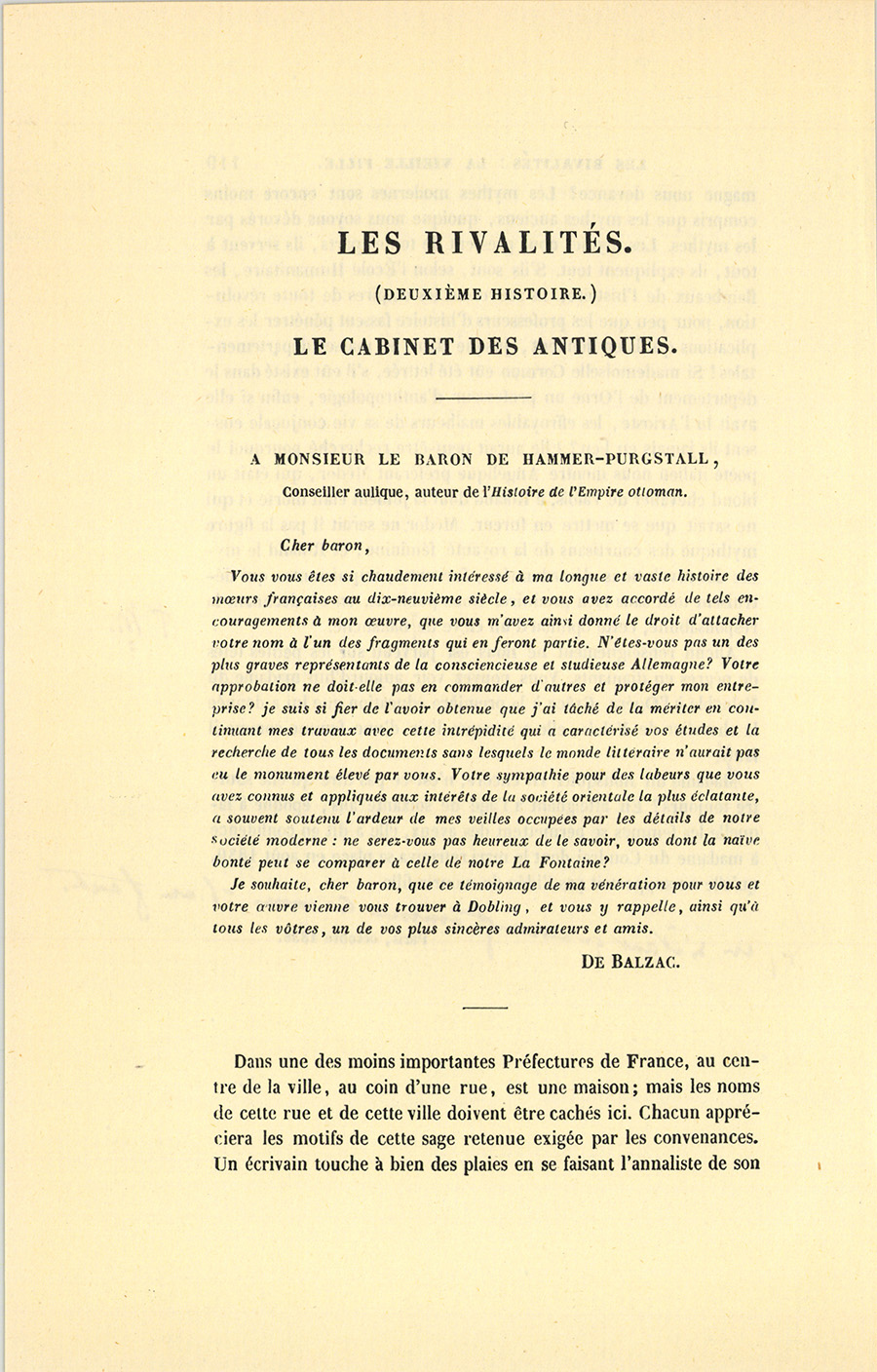 Vous vous êtes si chaudement intéressé à ma longue et vaste histoire des mœurs françaises au dix-neuvième siècle, et vous avez accordé de tels encouragements à mon œuvre, que vous m’avez ainsi donné le droit d’attacher votre nom à l’un des fragments qui en feront partie. N’êtes-vous pas un des plus graves représentants de la consciencieuse et studieuse Allemagne ? Votre approbation ne doit-elle pas en commander d’autres et protéger mon entreprise ? je suis si fier de l’avoir obtenue que j’ai tâché de la mériter en continuant mes travaux avec cette intrépidité qui a caractérisé vos études et la recherche de tous les documents sans lesquels le monde littéraire n’aurait pas eu le monument élevé par vous. Votre sympathie pour des labeurs que vous avez connus et appliqués aux intérêts de la société orientale la plus éclatante, a souvent soutenu l’ardeur de mes veilles occupées par les détails de notre société moderne : ne serez-vous pas heureux de le savoir, vous dont la naïve bonté peut se comparer à celle de notre La Fontaine ?