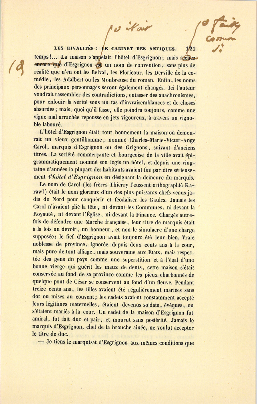 Dans une des moins importantes Préfectures de France, au centre de la ville, au coin d’une rue, est une maison ; mais les noms de cette rue et de cette ville doivent être cachés ici. Chacun appréciera les motifs de cette sage retenue exigée par les convenances. Un écrivain touche à bien des plaies en se faisant l’annaliste de son {p. 121} temps !… La maison s’appelait l’hôtel d’Esgrignon ; mais faites comme si d’Esgrignon était un nom de convention, sans plus de réalité que n’en ont les Belval, les Floricour, les Derville de la comédie, les Adalbert ou les Monbreuse du roman. Enfin, les noms des principaux personnages seront également changés. Ici l’auteur voudrait rassembler des contradictions, entasser des anachronismes, pour enfouir la vérité sous un tas d’invraisemblances et de choses absurdes ; mais, quoi qu’il fasse, elle poindra toujours, comme une vigne mal arrachée repousse en jets vigoureux, à travers un vignoble labouré.
