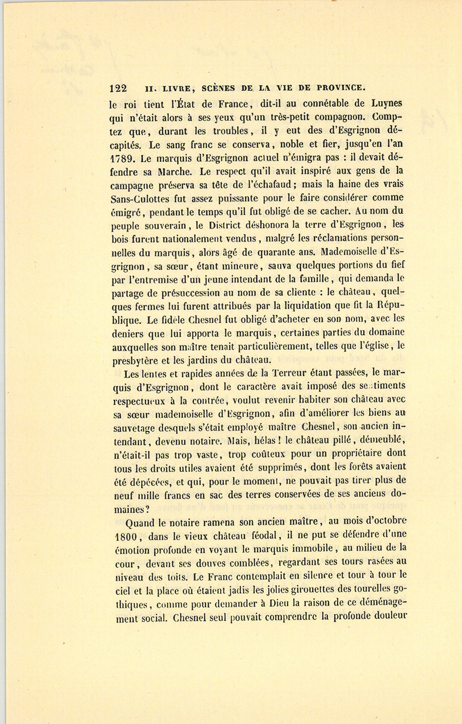 Quand le notaire ramena son ancien maître, au mois d’octobre 1800, dans le vieux château féodal, il ne put se défendre d’une émotion profonde en voyant le marquis immobile, au milieu de la cour, devant ses douves comblées, regardant ses tours rasées au niveau des toits. Le Franc contemplait en silence et tour à tour le ciel et la place où étaient jadis les jolies girouettes des tourelles gothiques, comme pour demander à Dieu la raison de ce déménagement social. Chesnel seul pouvait comprendre la profonde douleur {p. 123} du marquis, alors nommé le citoyen Carol. Ce grand d’Esgrignon resta long-temps muet, il aspira la senteur patrimoniale de l’air et jeta la plus mélancolique des interjections.