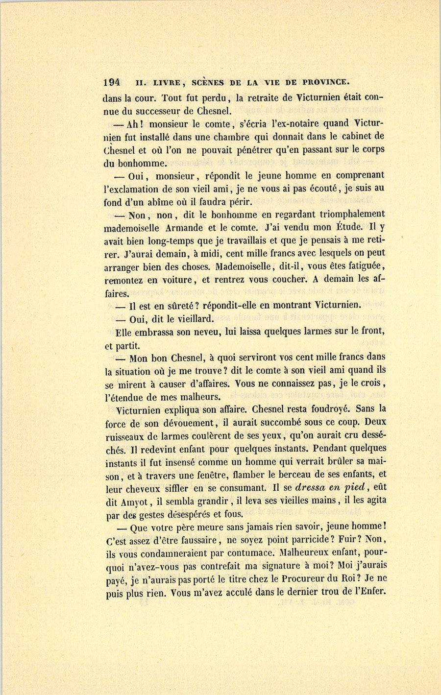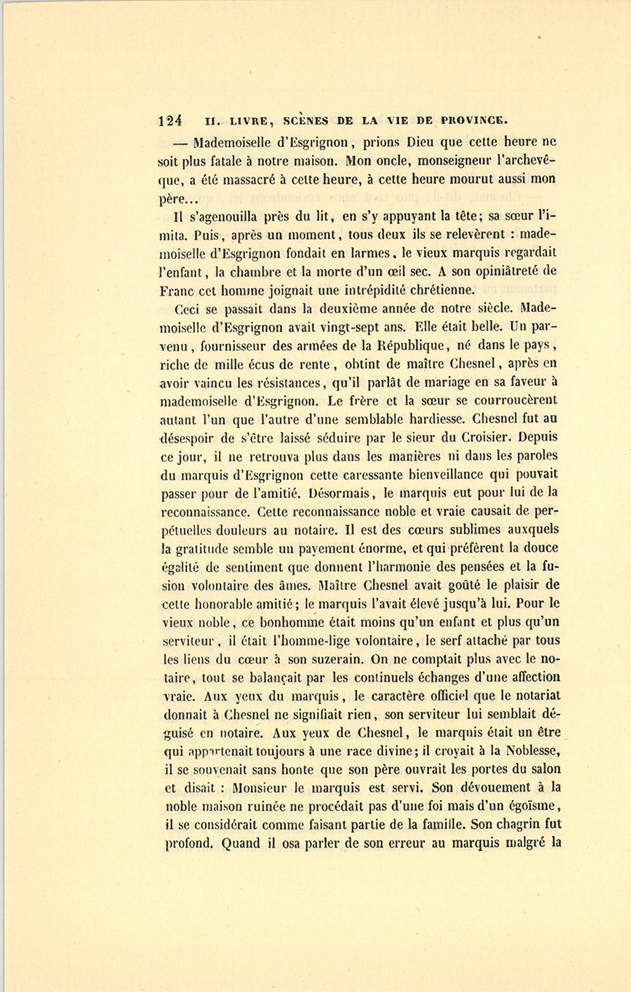 {p. 124} – Mademoiselle d’Esgrignon, prions Dieu que cette heure ne soit plus fatale à notre maison. Mon oncle, monseigneur l’archevêque, a été massacré à cette heure, à cette heure mourut aussi mon père…