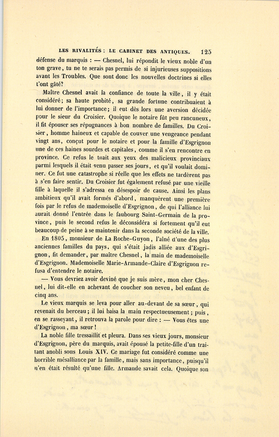 Le nom de Carol (les frères Thierry l’eussent orthographié Karawl) était le nom glorieux d’un des plus puissants chefs venus jadis du Nord pour conquérir et féodaliser les Gaules. Jamais les Carol n’avaient plié la tête, ni devant les Communes, ni devant la Royauté, ni devant l’Église, ni devant la Finance. Chargés autrefois de défendre une Marche française, leur titre de marquis était à la fois un devoir, un honneur, et non le simulacre d’une charge supposée ; le fief d’Esgrignon avait toujours été leur bien. Vraie noblesse de province, ignorée depuis deux cents ans à la cour, mais pure de tout alliage, mais souveraine aux États, mais respectée des gens du pays comme une superstition et à l’égal d’une bonne vierge qui guérit les maux de dents, cette maison s’était conservée au fond de sa province comme les pieux charbonnés de quelque pont de César se conservent au fond d’un fleuve. Pendant treize cents ans, les filles avaient été régulièrement mariées sans dot ou mises au couvent ; les cadets avaient constamment accepté leurs légitimes maternelles, étaient devenus soldats, évêques, ou s’étaient mariés à la cour. Un cadet de la maison d’Esgrignon fut amiral, fut fait duc et pair, et mourut sans postérité. Jamais le marquis d’Esgrignon, chef de la branche aînée, ne voulut accepter le titre de duc.