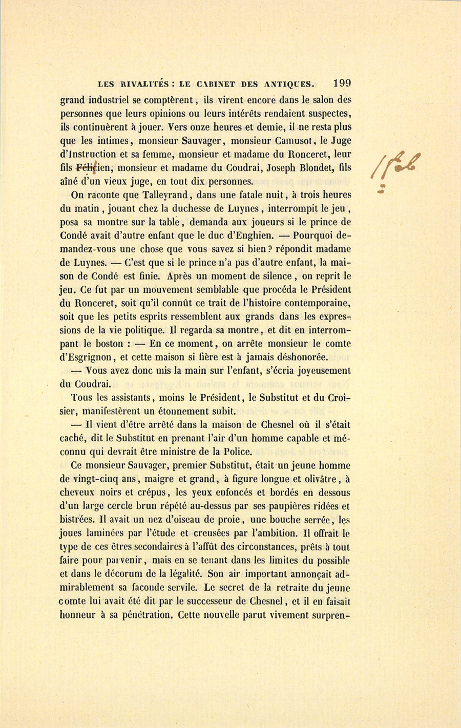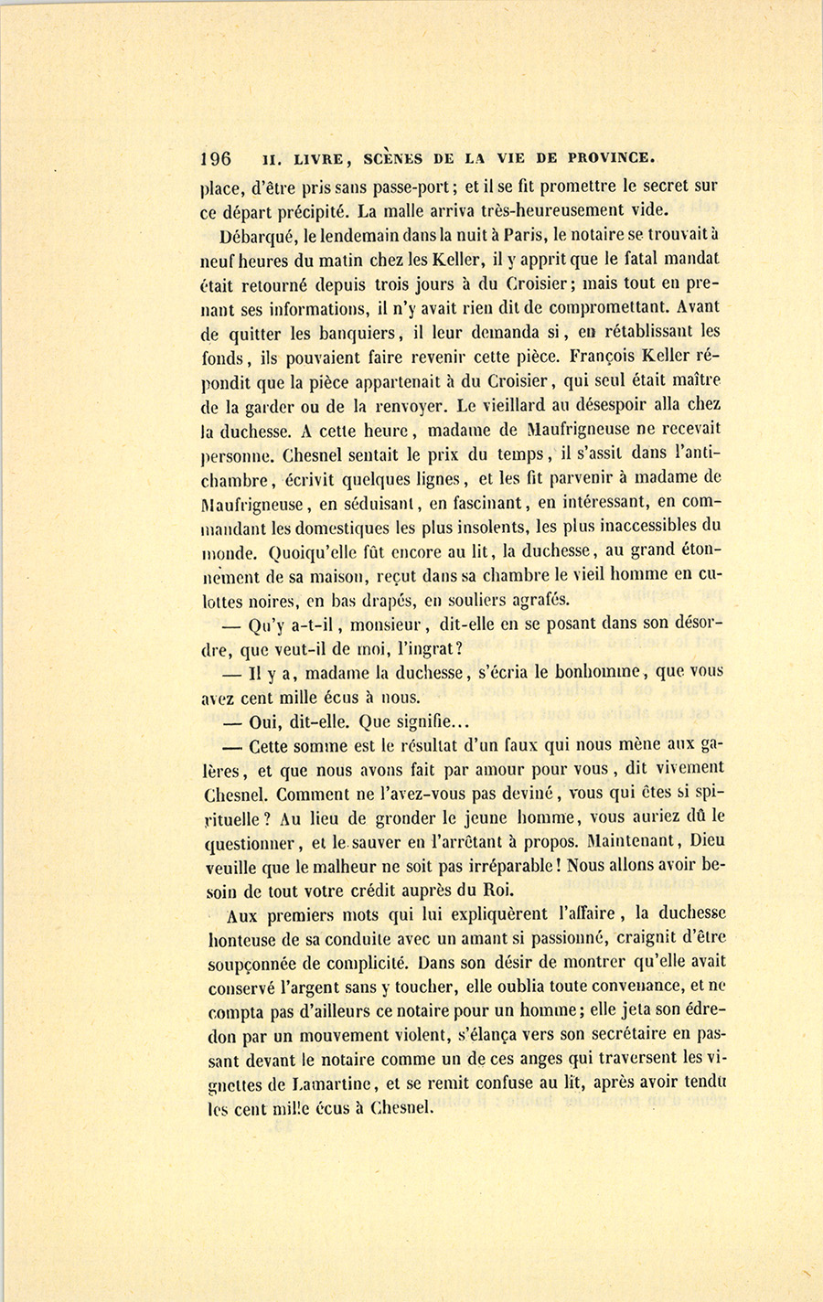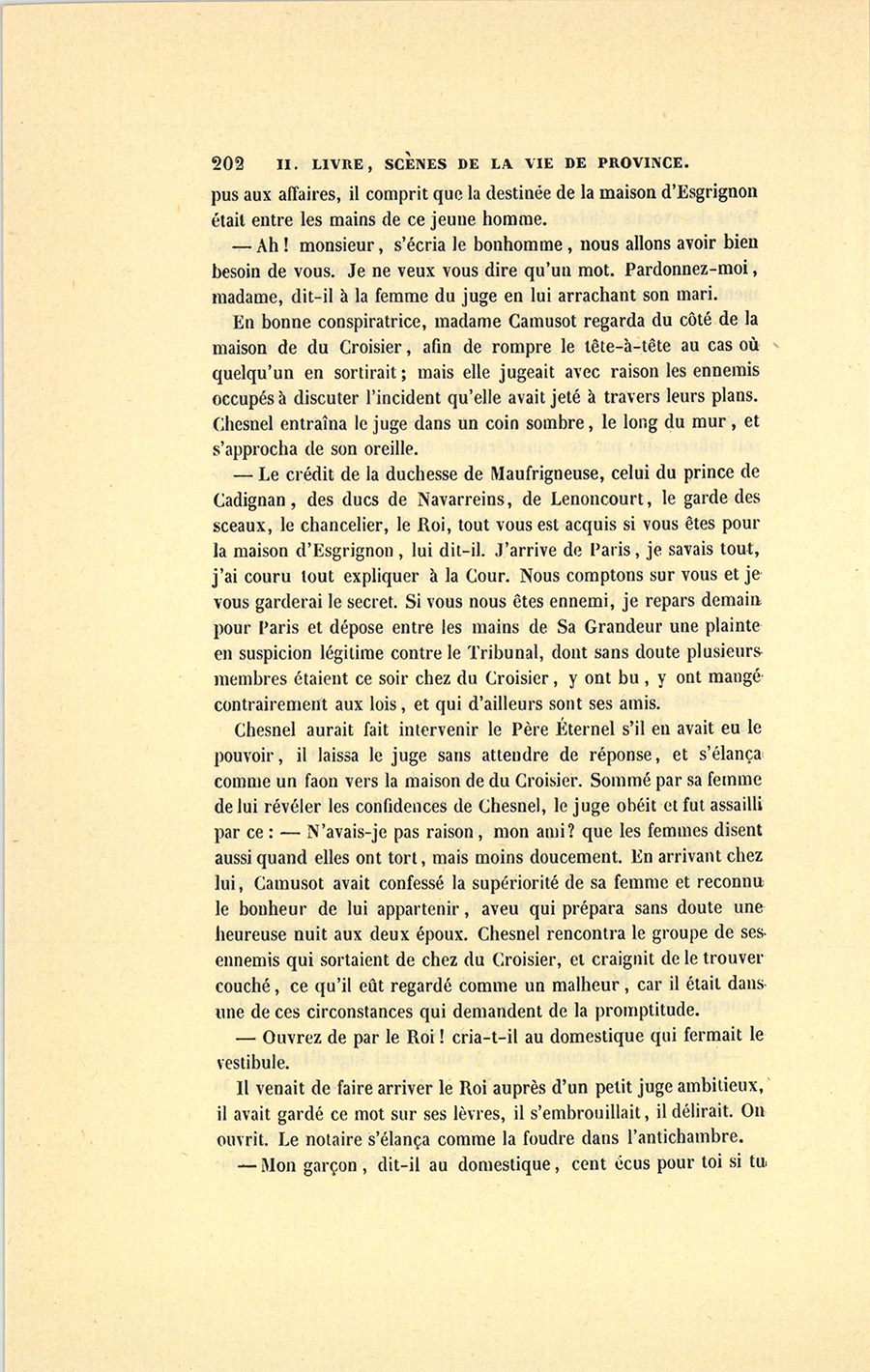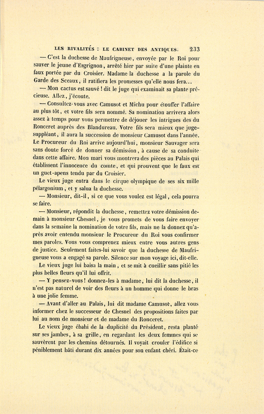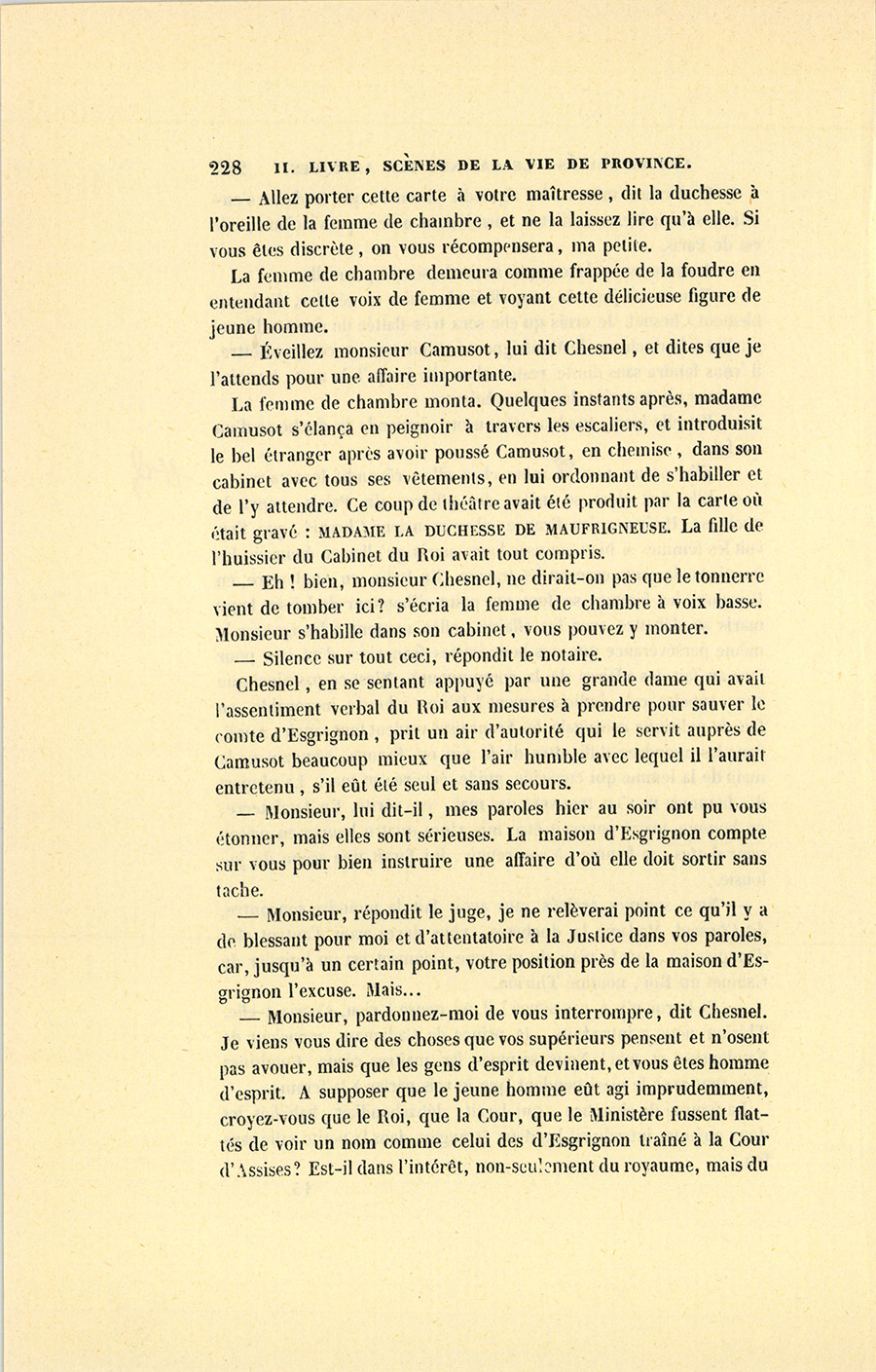 {p. 233} – C’est la duchesse de Maufrigneuse, envoyée par le Roi pour sauver le jeune d’Esgrignon, arrêté hier par suite d’une plainte en faux portée par du Croisier. Madame la duchesse a la parole du Garde des Sceaux, il ratifiera les promesses qu’elle nous fera…