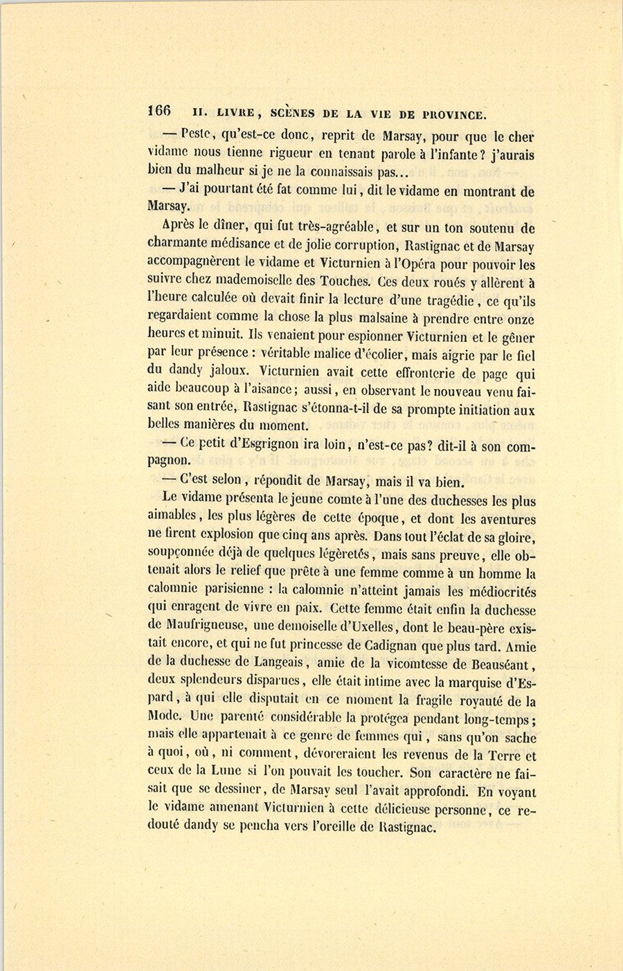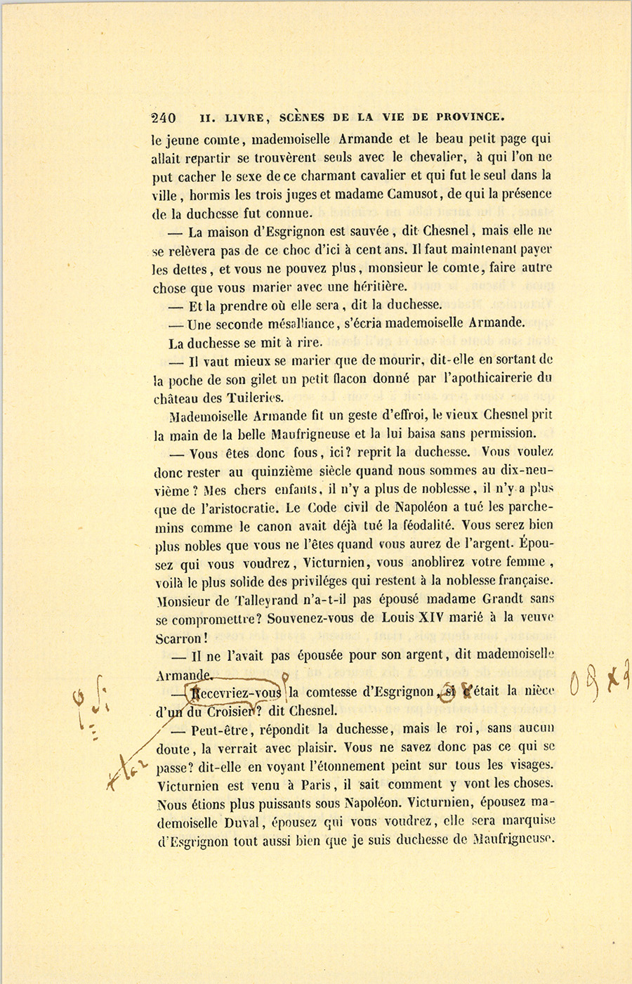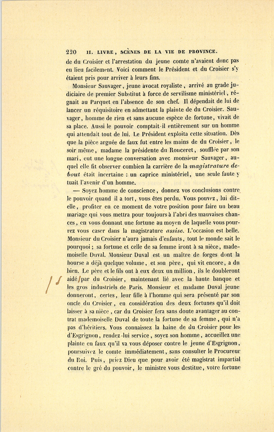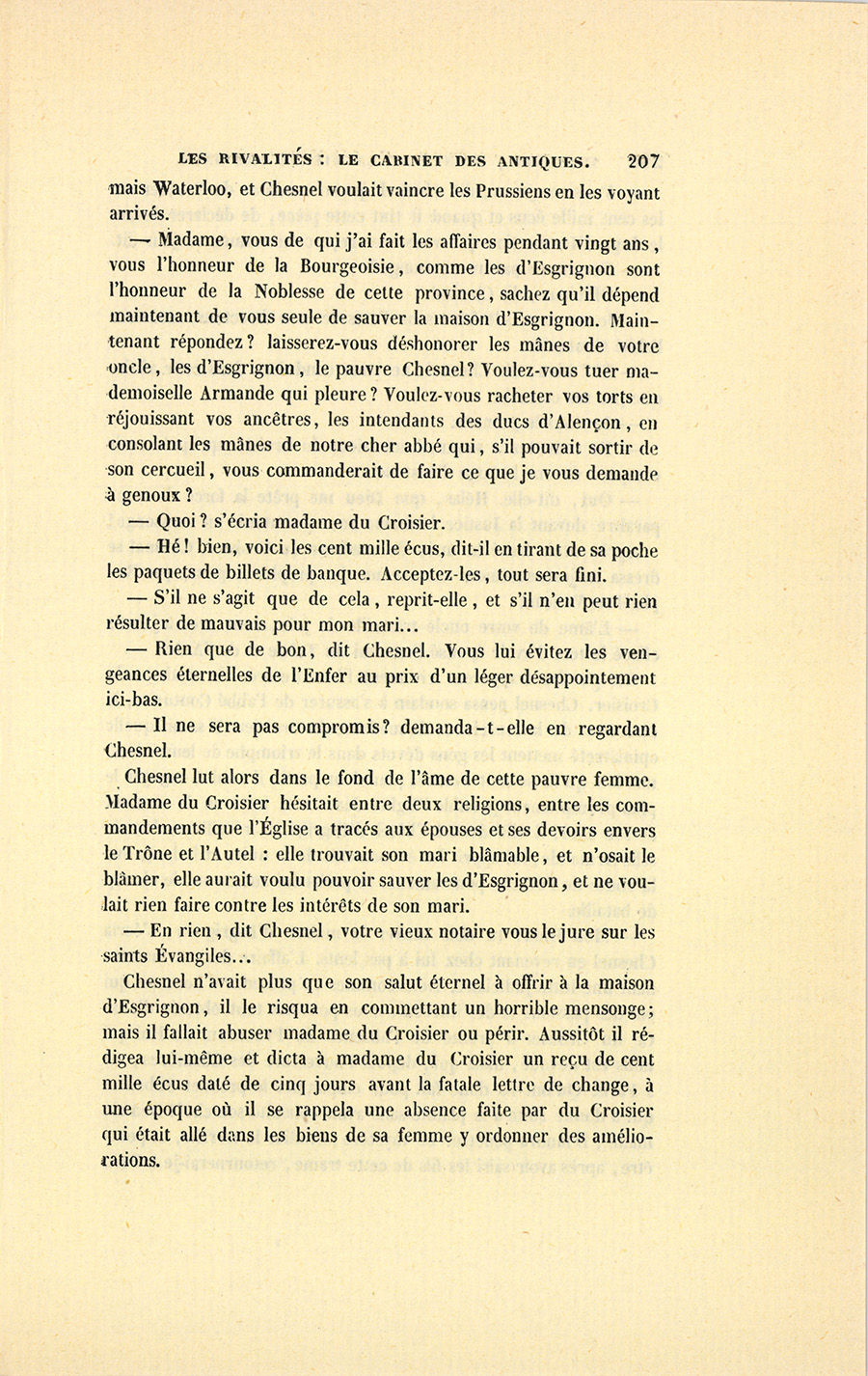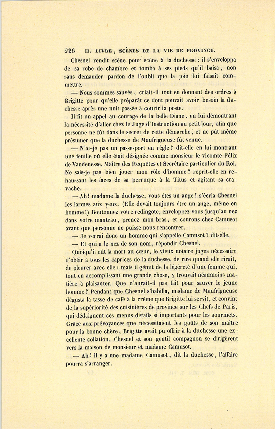 {p. 233} – C’est la duchesse de Maufrigneuse, envoyée par le Roi pour sauver le jeune d’Esgrignon, arrêté hier par suite d’une plainte en faux portée par du Croisier. Madame la duchesse a la parole du Garde des Sceaux, il ratifiera les promesses qu’elle nous fera…