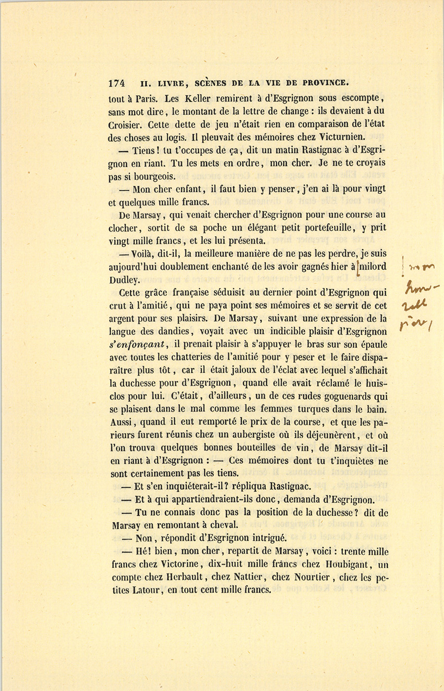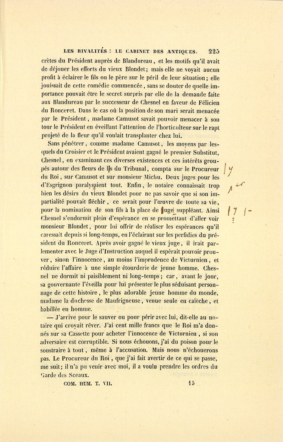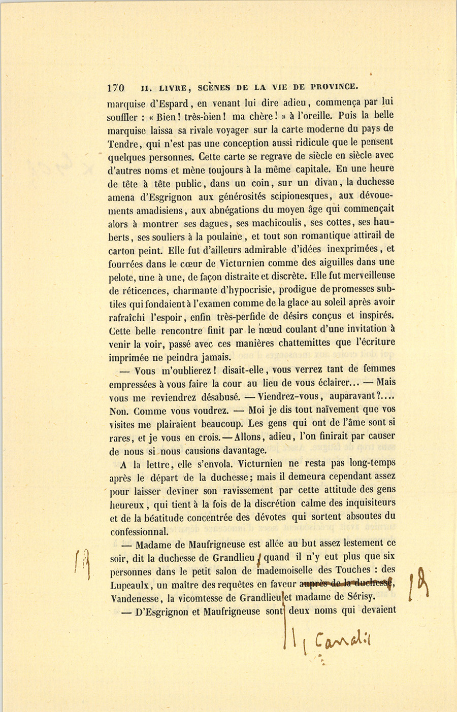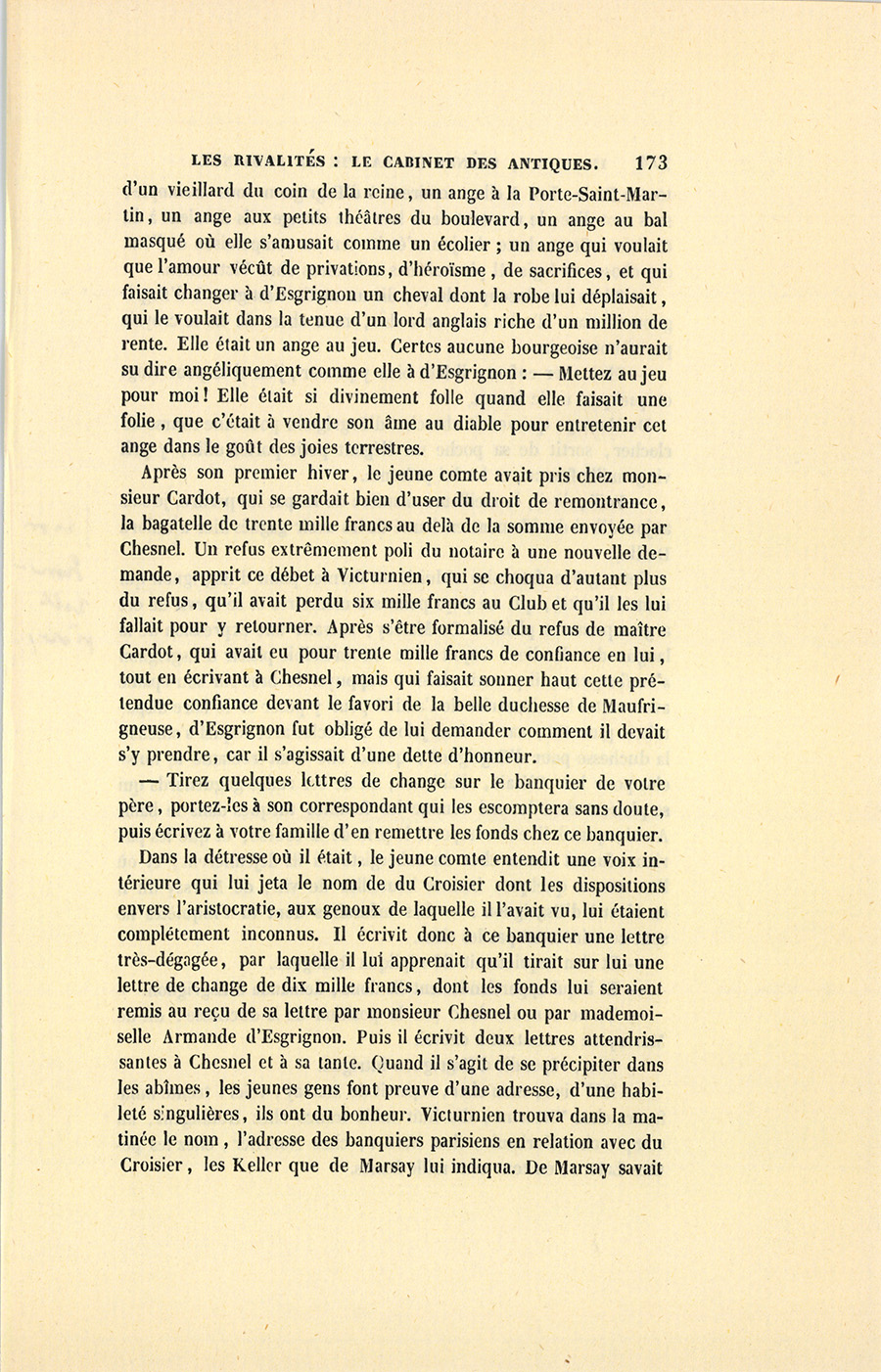 {p. 233} – C’est la duchesse de Maufrigneuse, envoyée par le Roi pour sauver le jeune d’Esgrignon, arrêté hier par suite d’une plainte en faux portée par du Croisier. Madame la duchesse a la parole du Garde des Sceaux, il ratifiera les promesses qu’elle nous fera…