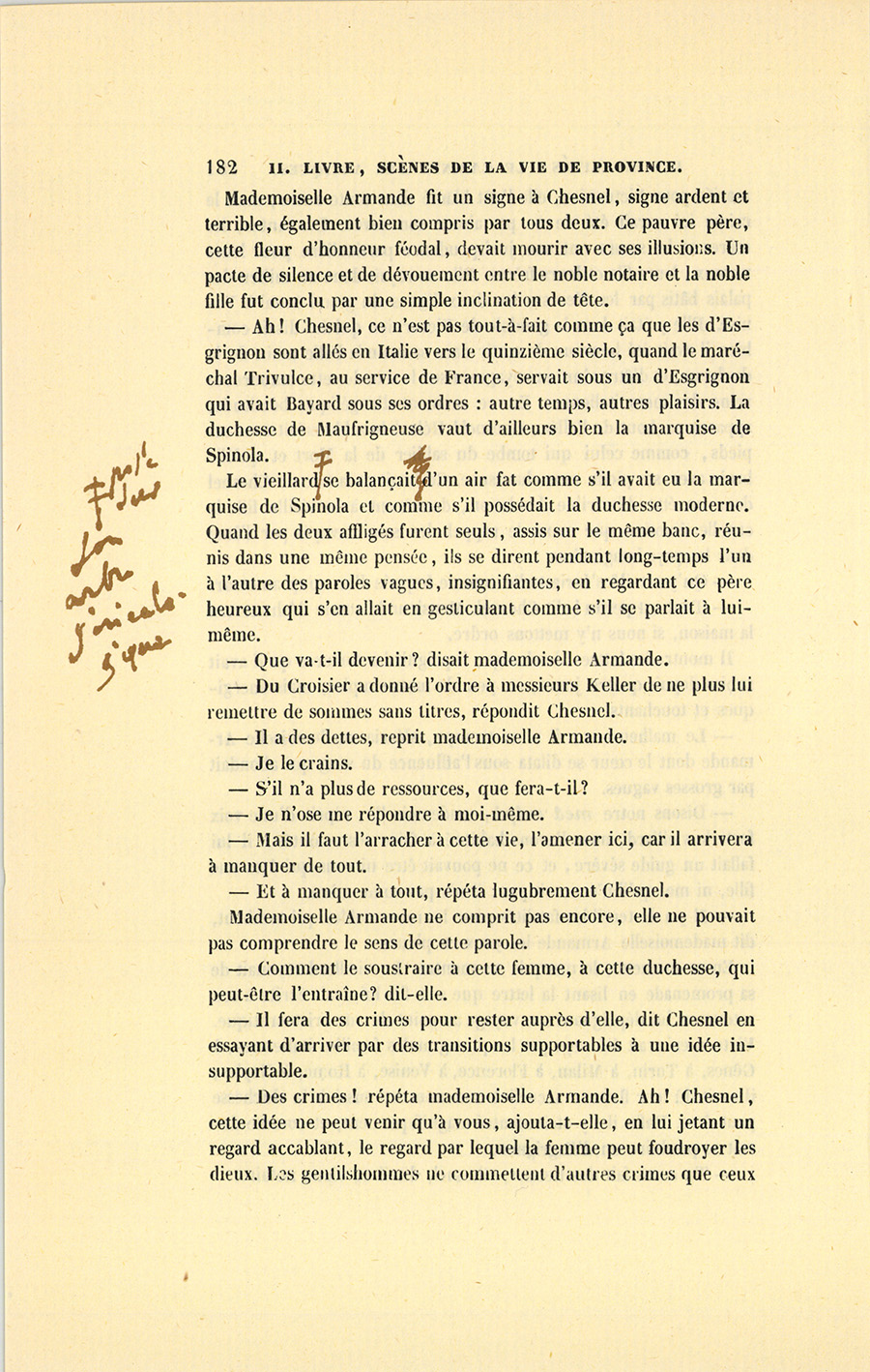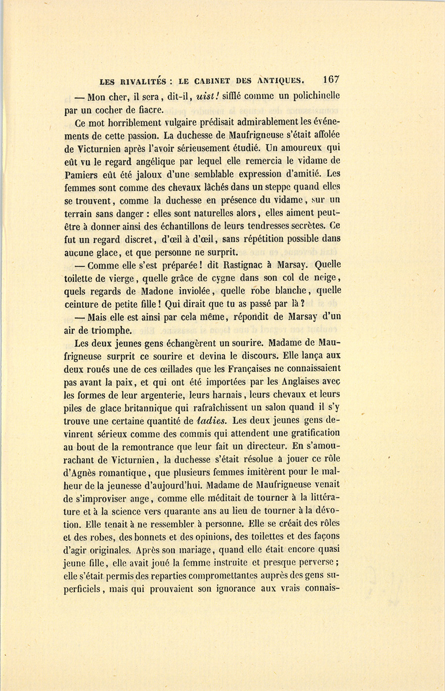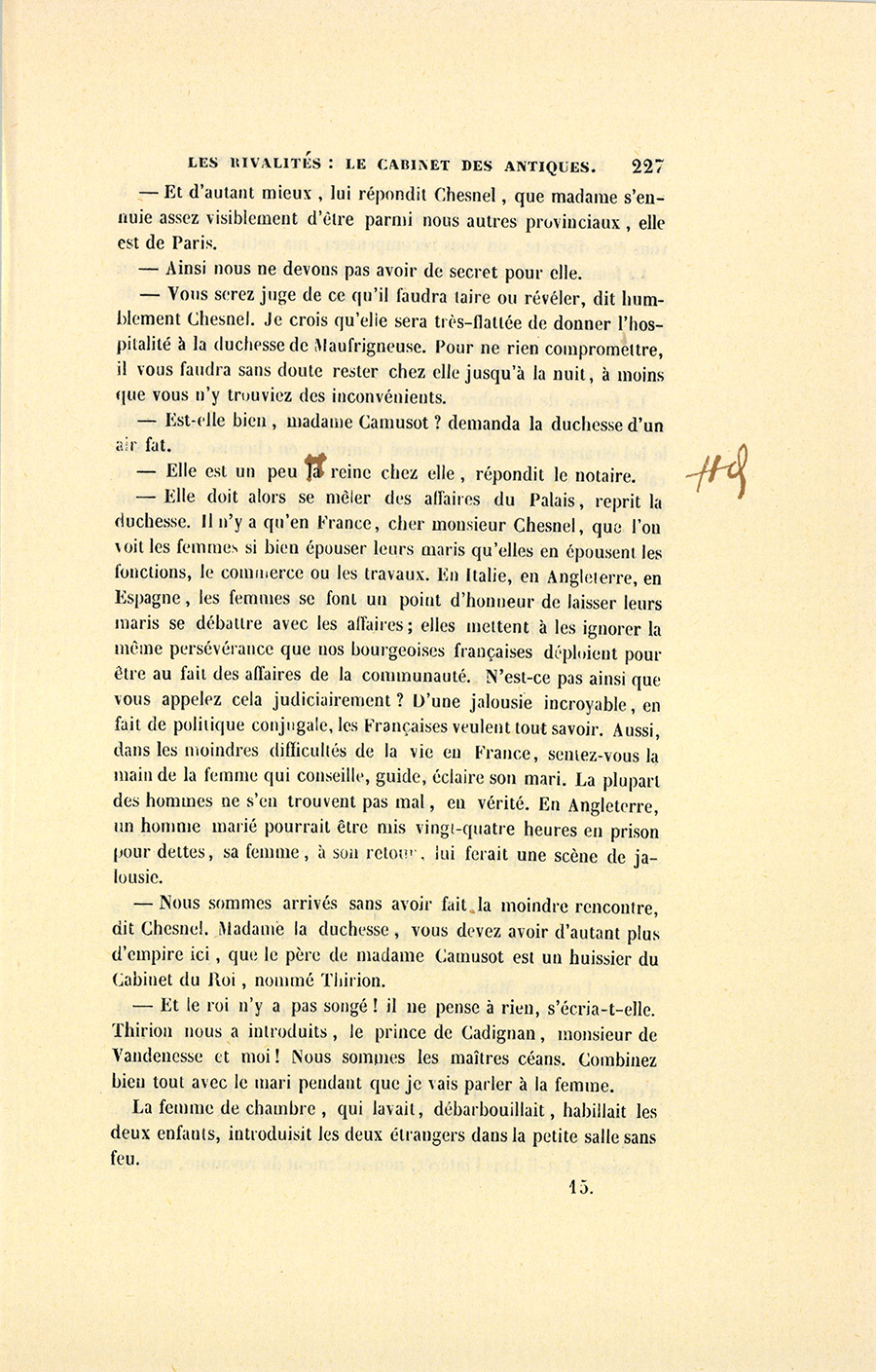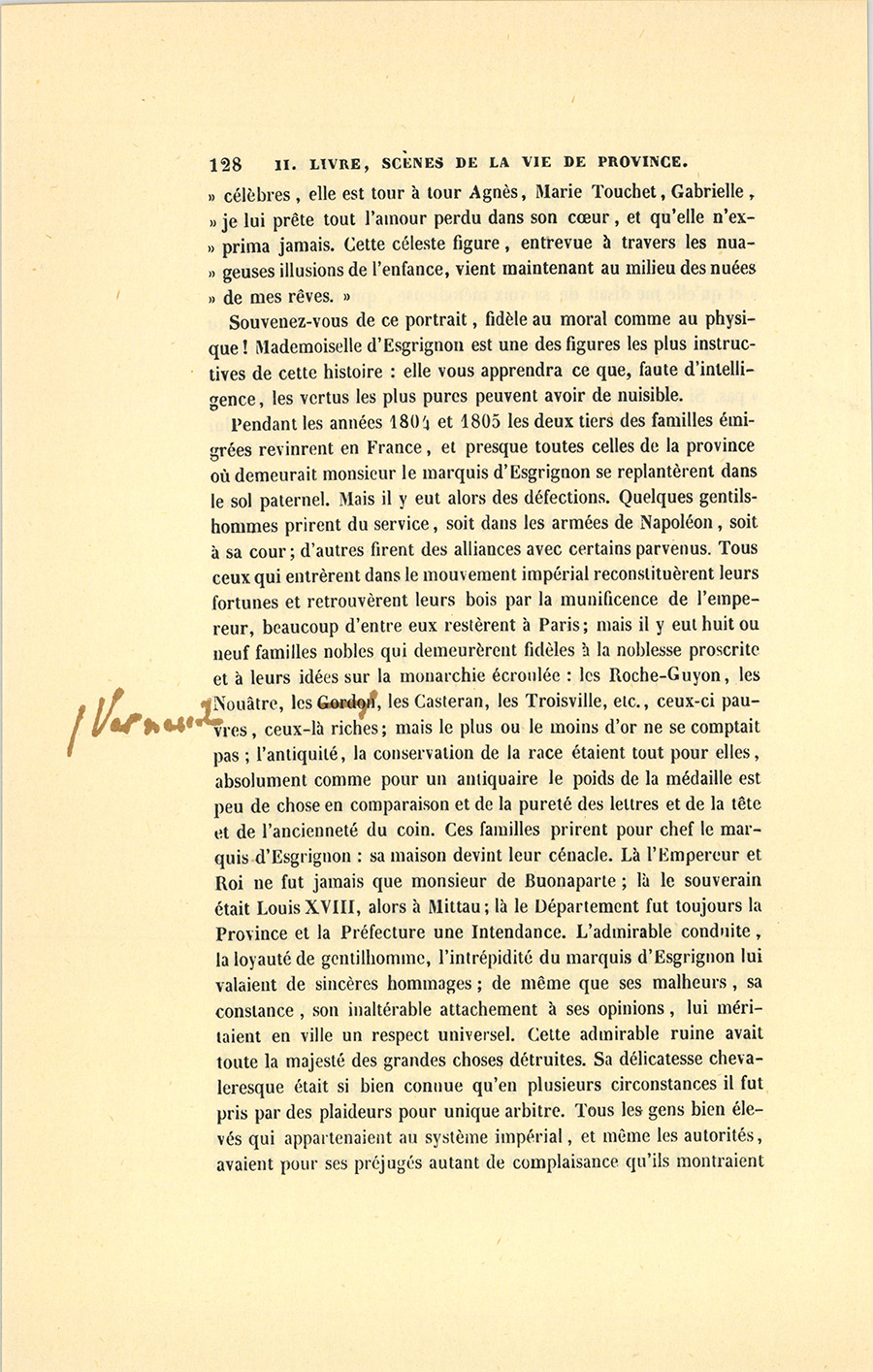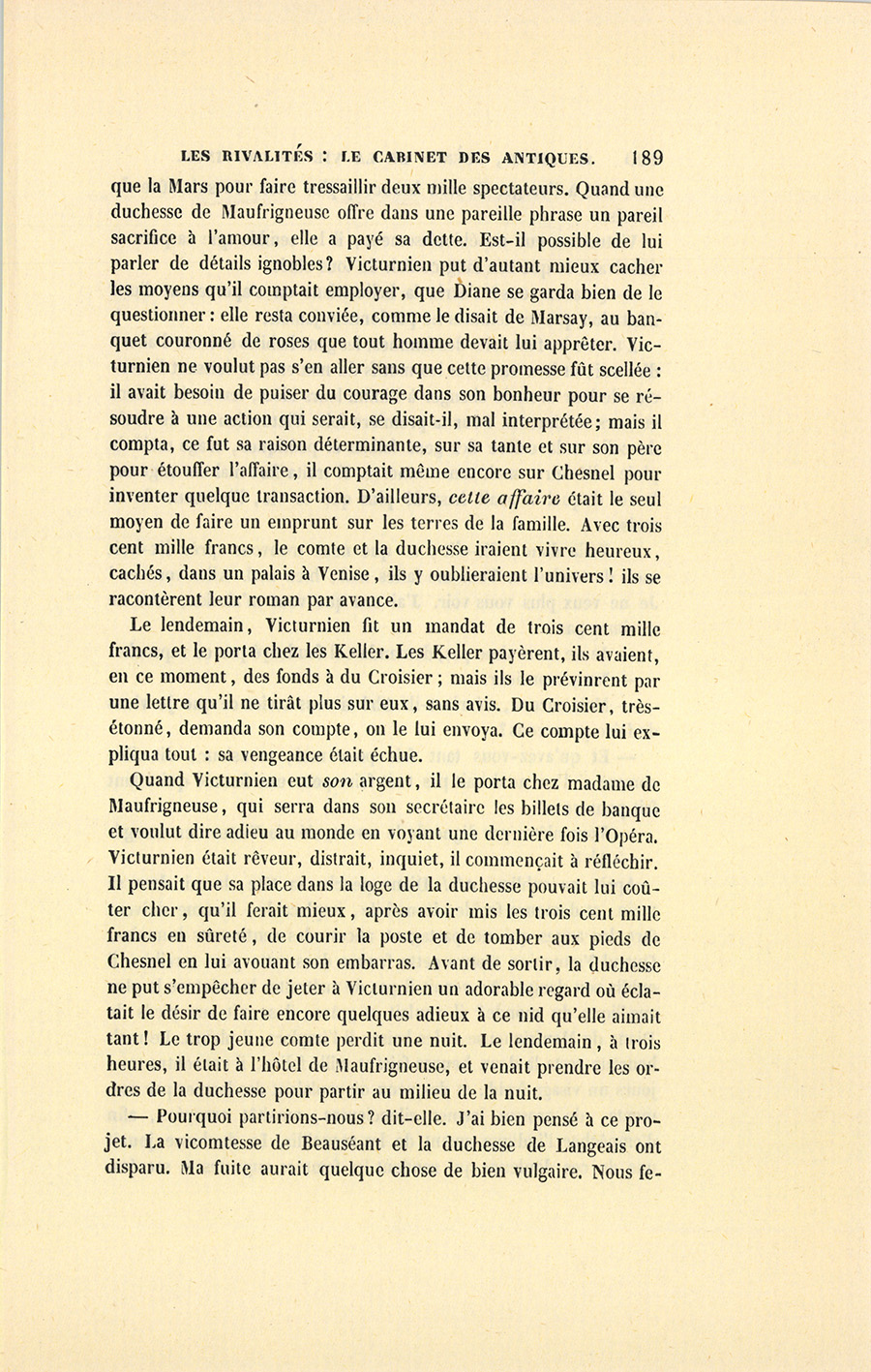 {p. 233} – C’est la duchesse de Maufrigneuse, envoyée par le Roi pour sauver le jeune d’Esgrignon, arrêté hier par suite d’une plainte en faux portée par du Croisier. Madame la duchesse a la parole du Garde des Sceaux, il ratifiera les promesses qu’elle nous fera…