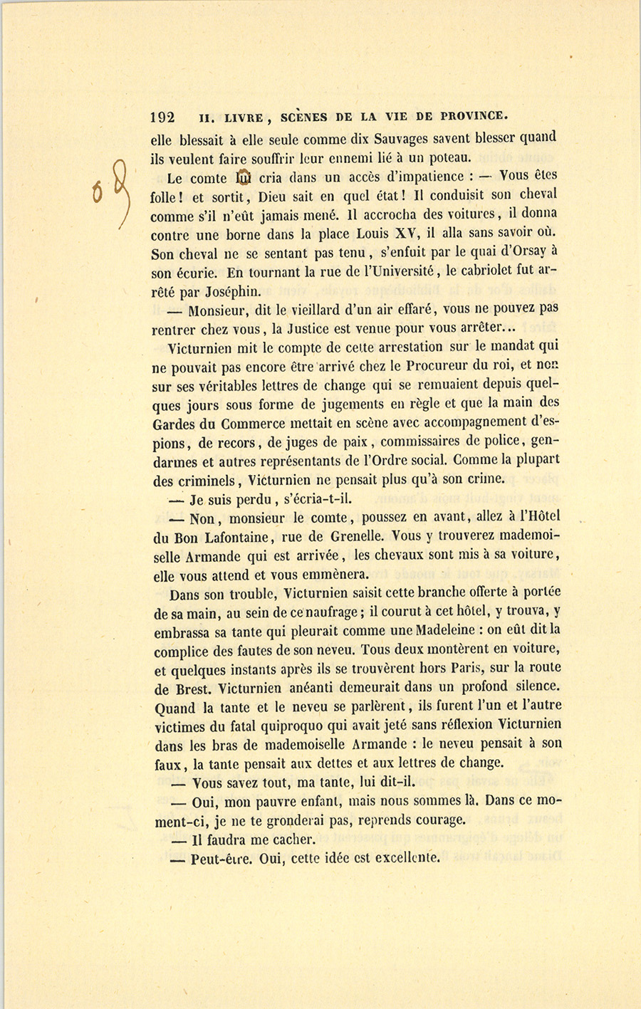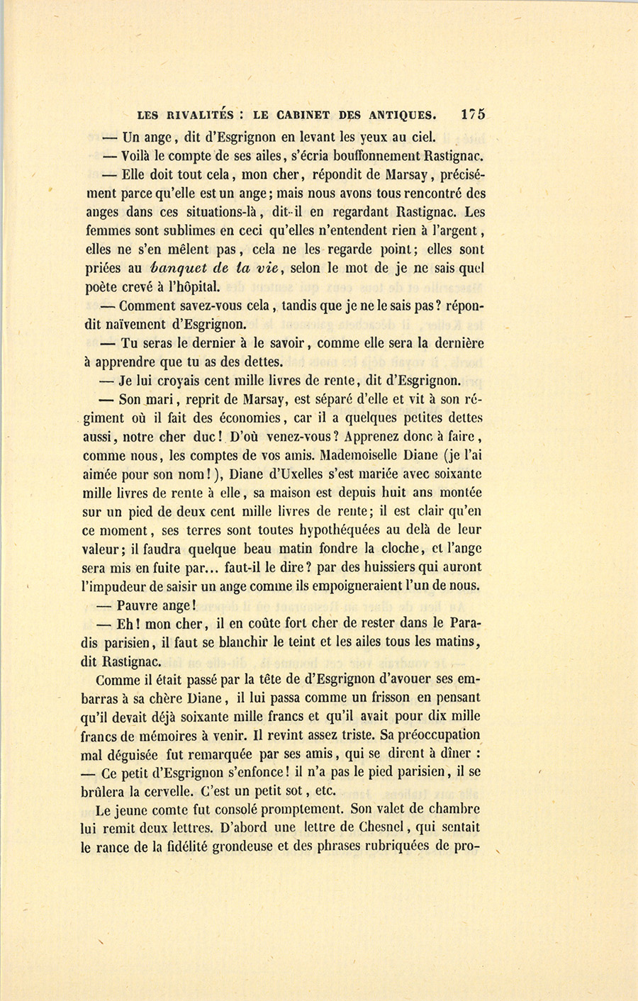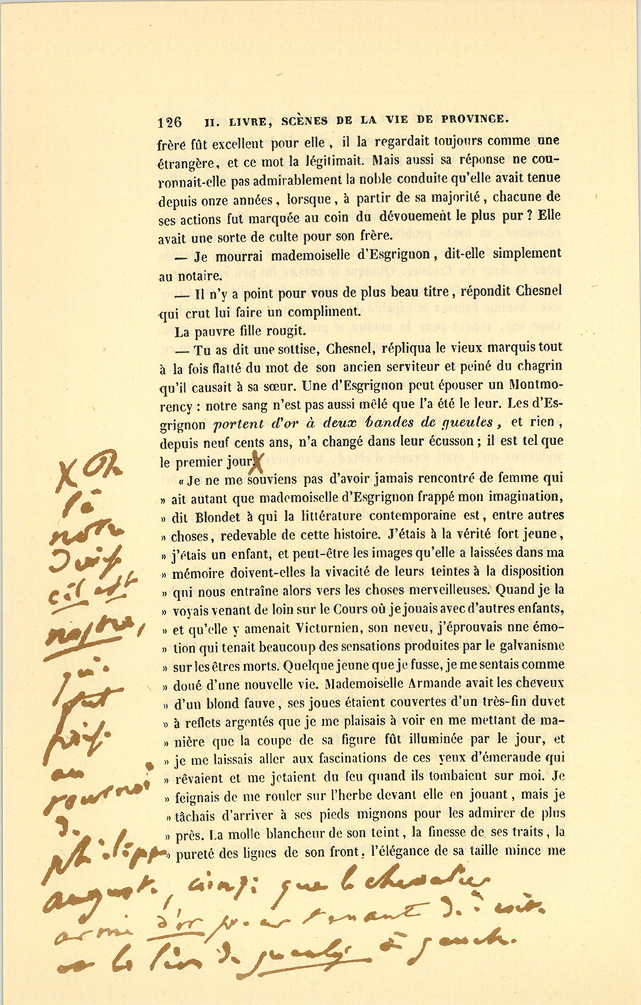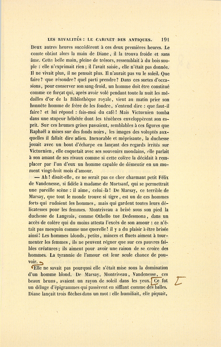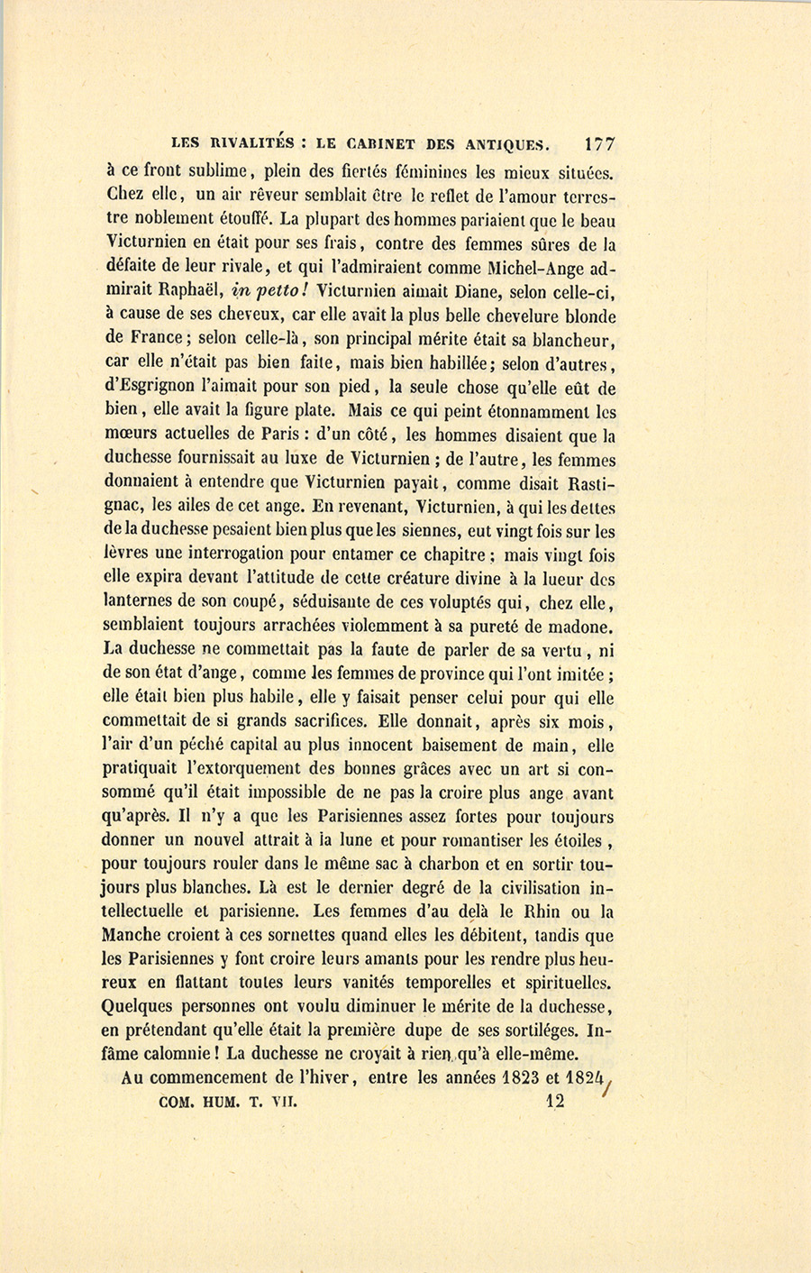 {p. 233} – C’est la duchesse de Maufrigneuse, envoyée par le Roi pour sauver le jeune d’Esgrignon, arrêté hier par suite d’une plainte en faux portée par du Croisier. Madame la duchesse a la parole du Garde des Sceaux, il ratifiera les promesses qu’elle nous fera…