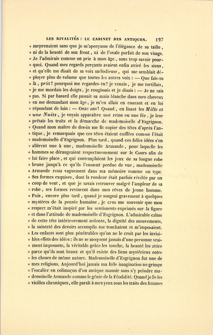 « Je ne me souviens pas d’avoir jamais rencontré de femme qui ait autant que mademoiselle d’Esgrignon frappé mon imagination, dit Blondet à qui la littérature contemporaine est, entre autres choses, redevable de cette histoire. J’étais à la vérité fort jeune, j’étais un enfant, et peut-être les images qu’elle a laissées dans ma mémoire doivent-elles la vivacité de leurs teintes à la disposition qui nous entraîne alors vers les choses merveilleuses. Quand je la voyais venant de loin sur le Cours où je jouais avec d’autres enfants, et qu’elle y amenait Victurnien, son neveu, j’éprouvais une émotion qui tenait beaucoup des sensations produites par le galvanisme sur les êtres morts. Quelque jeune que je fusse, je me sentais comme doué d’une nouvelle vie. Mademoiselle Armande avait les cheveux d’un blond fauve, ses joues étaient couvertes d’un très-fin duvet à reflets argentés que je me plaisais à voir en me mettant de manière que la coupe de sa figure fût illuminée par le jour, et je me laissais aller aux fascinations de ces yeux d’émeraude qui rêvaient et me jetaient du feu quand ils tombaient sur moi. Je feignais de me rouler sur l’herbe devant elle en jouant, mais je tâchais d’arriver à ses pieds mignons pour les admirer de plus près. La molle blancheur de son teint, la finesse de ses traits, la pureté des lignes de son front, l’élégance de sa taille mince me {p. 127} surprenaient sans que je m’aperçusse de l’élégance de sa taille, ni de la beauté de son front, ni de l’ovale parfait de son visage. Je l’admirais comme on prie à mon âge, sans trop savoir pourquoi. Quand mes regards perçants avaient enfin attiré les siens, et qu’elle me disait de sa voix mélodieuse, qui me semblait déployer plus de volume que toutes les autres voix : – Que fais-tu là, petit ? pourquoi me regardes-tu ? je venais, je me tortillais, je me mordais les doigts, je rougissais et je disais : – Je ne sais pas. Si par hasard elle passait sa main blanche dans mes cheveux en me demandant mon âge, je m’en allais en courant et en lui répondant de loin : – Onze ans ! Quand, en lisant les Mille et une Nuits, je voyais apparaître une reine ou une fée, je leur prêtais les traits et la démarche de mademoiselle d’Esgrignon. Quand mon maître de dessin me fit copier des têtes d’après l’antique, je remarquais que ces têtes étaient coiffées comme l’était mademoiselle d’Esgrignon. Plus tard, quand ces folles idées s’en allèrent une à une, mademoiselle Armande, pour laquelle les hommes se dérangeaient respectueusement sur le Cours afin de lui faire place, et qui contemplaient les jeux de sa longue robe brune jusqu’à ce qu’ils l’eussent perdue de vue, mademoiselle Armande resta vaguement dans ma mémoire comme un type. Ses formes exquises, dont la rondeur était parfois révélée par un coup de vent, et que je savais retrouver malgré l’ampleur de sa robe, ses formes revinrent dans mes rêves de jeune homme. Puis, encore plus tard, quand je songeai gravement à quelques mystères de la pensée humaine, je crus me souvenir que mon respect m’était inspiré par les sentiments exprimés sur la figure et dans l’attitude de mademoiselle d’Esgrignon. L’admirable calme de cette tête intérieurement ardente, la dignité des mouvements, la sainteté des devoirs accomplis me touchaient et m’imposaient. Les enfants sont plus pénétrables qu’on ne le croit par les invisibles effets des idées : ils ne se moquent jamais d’une personne vraiment imposante, la véritable grâce les touche, la beauté les attire parce qu’ils sont beaux et qu’il existe des liens mystérieux entre les choses de même nature. Mademoiselle d’Esgrignon fut une de mes religions. Aujourd’hui jamais ma folle imagination ne grimpe l’escalier en colimaçon d’un antique manoir sans s’y peindre mademoiselle Armande comme le génie de la Féodalité. Quand je lis les vieilles chroniques, elle paraît à mes yeux sous les traits des femmes {p. 128} célèbres, elle est tour à tour Agnès, Marie Touchet, Gabrielle, je lui prête tout l’amour perdu dans son cœur, et qu’elle n’exprima jamais. Cette céleste figure, entrevue à travers les nuageuses illusions de l’enfance, vient maintenant au milieu des nuées de mes rêves. »