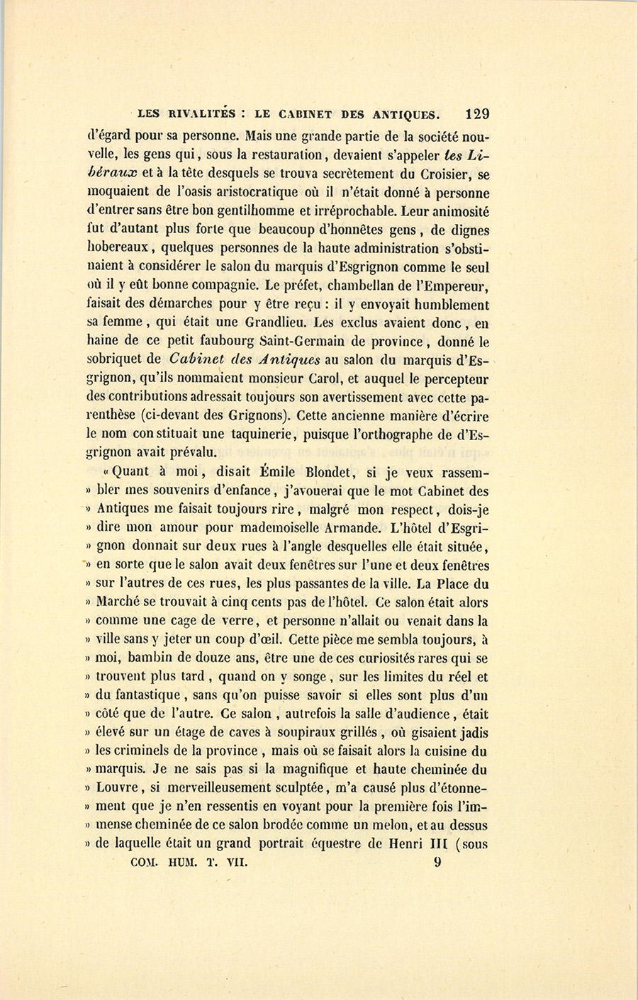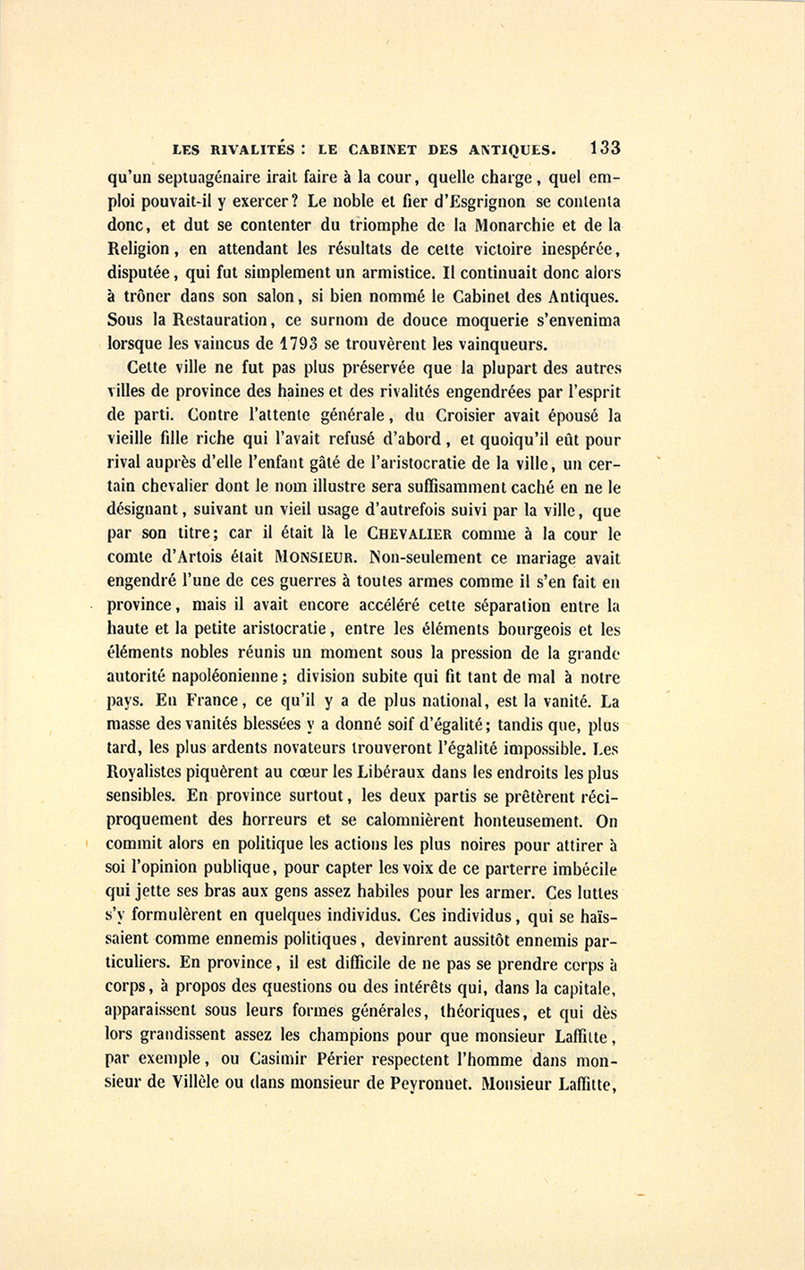 Pendant les années 1804 et 1805 les deux tiers des familles émigrées revinrent en France, et presque toutes celles de la province où demeurait monsieur le marquis d’Esgrignon se replantèrent dans le sol paternel. Mais il y eut alors des défections. Quelques gentilshommes prirent du service, soit dans les armées de Napoléon, soit à sa cour ; d’autres firent des alliances avec certains parvenus. Tous ceux qui entrèrent dans le mouvement impérial reconstituèrent leurs fortunes et retrouvèrent leurs bois par la munificence de l’empereur, beaucoup d’entre eux restèrent à Paris ; mais il y eut huit ou neuf familles nobles qui demeurèrent fidèles à la noblesse proscrite et à leurs idées sur la monarchie écroulée : les Roche-Guyon, les Nouâtre, les Verneuil, les Castéran1, les Troisville, etc., ceux-ci pauvres, ceux-là riches ; mais le plus ou le moins d’or ne se comptait pas ; l’antiquité, la conservation de la race étaient tout pour elles, absolument comme pour un antiquaire le poids de la médaille est peu de chose en comparaison et de la pureté des lettres et de la tête et de l’ancienneté du coin. Ces familles prirent pour chef le marquis d’Esgrignon : sa maison devint leur cénacle. Là l’Empereur et Roi ne fut jamais que monsieur de Buonaparte ; là le souverain était Louis XVIII, alors à Mittau ; là le Département fut toujours la Province et la Préfecture une Intendance. L’admirable conduite, la loyauté de gentilhomme, l’intrépidité du marquis d’Esgrignon lui valaient de sincères hommages ; de même que ses malheurs, sa constance, son inaltérable attachement à ses opinions, lui méritaient en ville un respect universel. Cette admirable ruine avait toute la majesté des grandes choses détruites. Sa délicatesse chevaleresque était si bien connue qu’en plusieurs circonstances il fut pris par des plaideurs pour unique arbitre. Tous les gens bien élevés qui appartenaient au système impérial, et même les autorités, avaient pour ses préjugés autant de complaisance qu’ils montraient {p. 129} d’égard pour sa personne. Mais une grande partie de la société nouvelle, les gens qui, sous la restauration, devaient s’appeler les Libéraux et à la tête desquels se trouva secrètement du Croisier, se moquaient de l’oasis aristocratique où il n’était donné à personne d’entrer sans être bon gentilhomme et irréprochable. Leur animosité fut d’autant plus forte que beaucoup d’honnêtes gens, de dignes hobereaux, quelques personnes de la haute administration s’obstinaient à considérer le salon du marquis d’Esgrignon comme le seul où il y eût bonne compagnie. Le préfet, chambellan de l’Empereur, faisait des démarches pour y être reçu : il y envoyait humblement sa femme, qui était une Grandlieu. Les exclus avaient donc, en haine de ce petit faubourg Saint-Germain de province, donné le sobriquet de Cabinet des Antiques au salon du marquis d’Esgrignon, qu’ils nommaient monsieur Carol, et auquel le percepteur des contributions adressait toujours son avertissement avec cette parenthèse (ci-devant des Grignons). Cette ancienne manière d’écrire le nom constituait une taquinerie, puisque l’orthographe de d’Esgrignon avait prévalu.