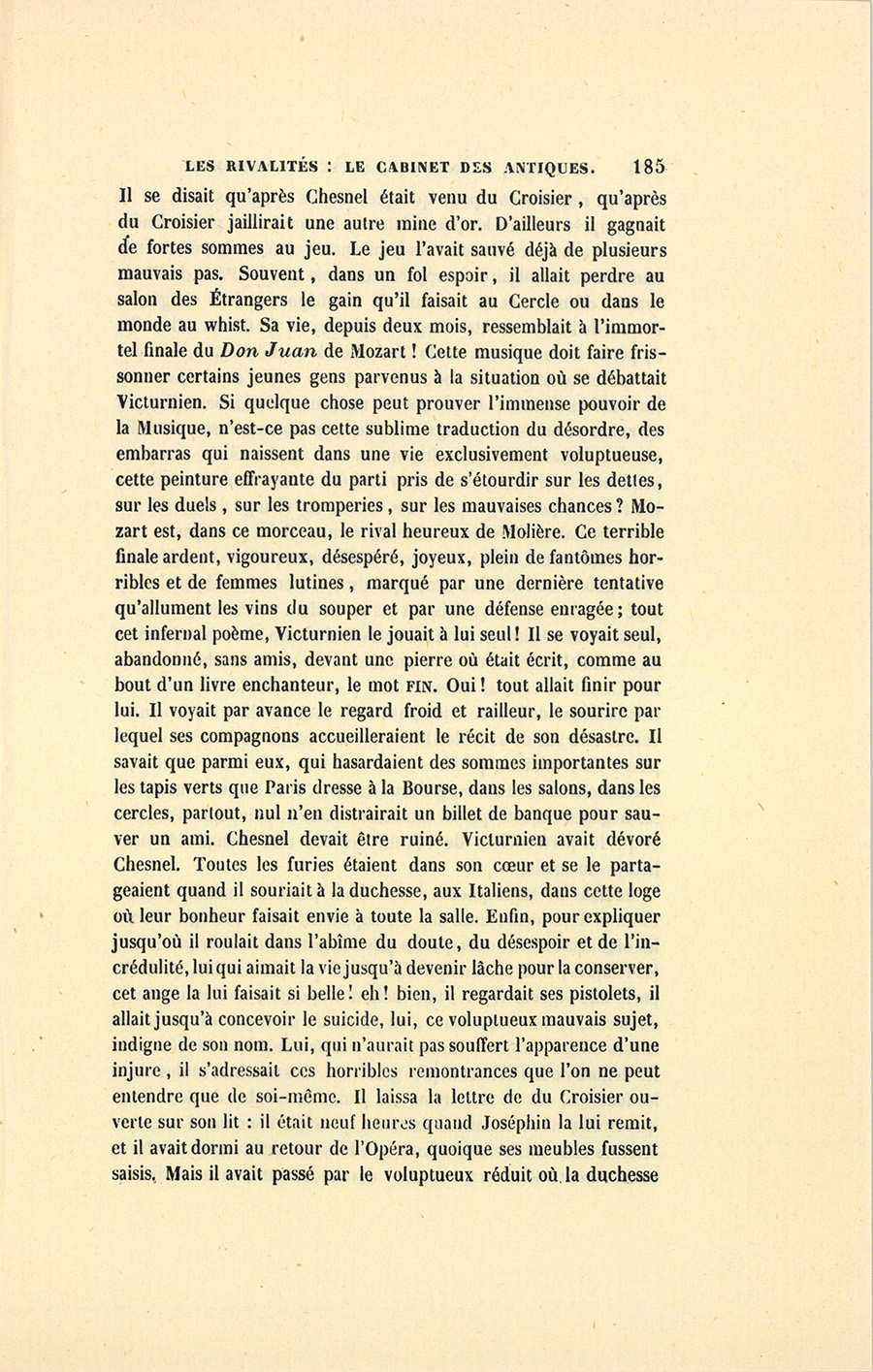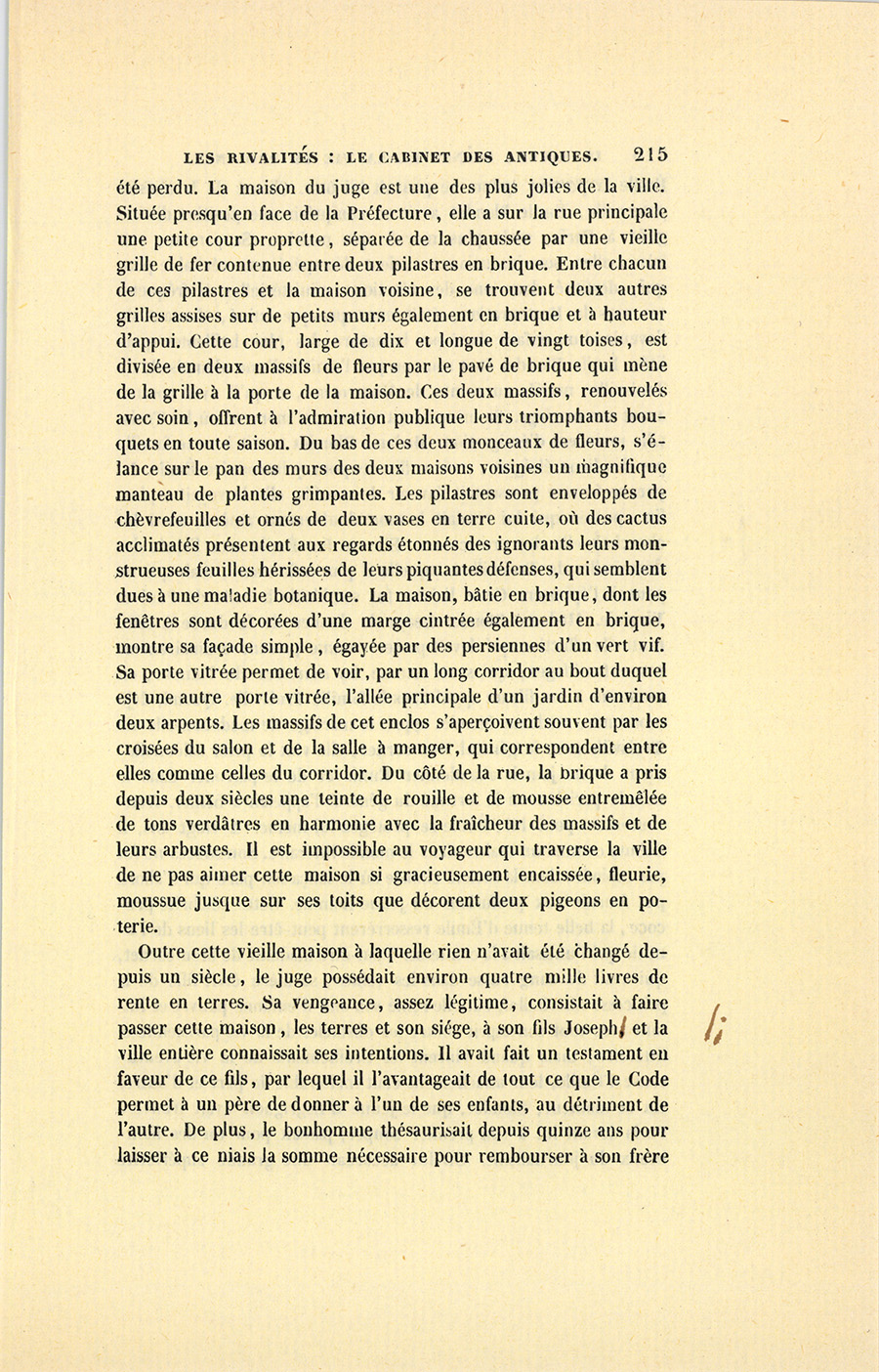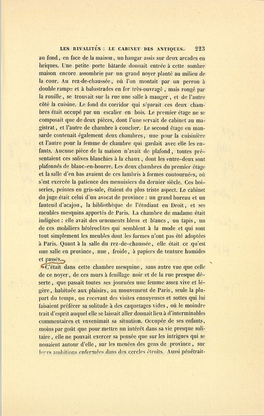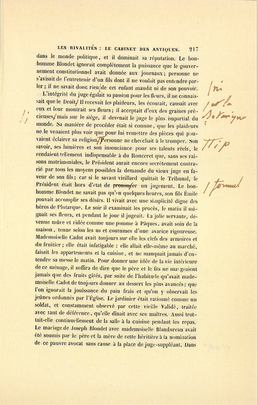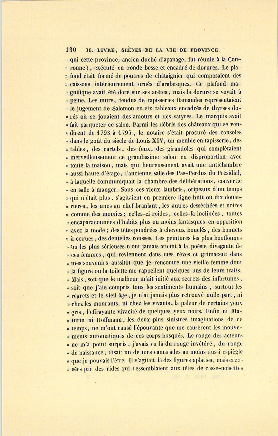 « Quant à moi, disait Émile Blondet, si je veux rassembler mes souvenirs d’enfance, j’avouerai que le mot Cabinet des Antiques me faisait toujours rire, malgré mon respect, dois-je dire mon amour pour mademoiselle Armande. L’hôtel d’Esgrignon donnait sur deux rues à l’angle desquelles elle était située, en sorte que le salon avait deux fenêtres sur l’une et deux fenêtres sur l’autre de ces rues, les plus passantes de la ville. La Place du Marché se trouvait à cinq cents pas de l’hôtel. Ce salon était alors comme une cage de verre, et personne n’allait ou venait dans la ville sans y jeter un coup d’œil. Cette pièce me sembla toujours, à moi, bambin de douze ans, être une de ces curiosités rares qui se trouvent plus tard, quand on y songe, sur les limites du réel et du fantastique, sans qu’on puisse savoir si elles sont plus d’un côté que de l’autre. Ce salon, autrefois la salle d’audience, était élevé sur un étage de caves à soupiraux grillés, où gisaient jadis les criminels de la province, mais où se faisait alors la cuisine du marquis. Je ne sais pas si la magnifique et haute cheminée du Louvre, si merveilleusement sculptée, m’a causé plus d’étonnement que je n’en ressentis en voyant pour la première fois l’immense cheminée de ce salon brodée comme un melon, et au-dessus de laquelle était un grand portrait équestre de Henri III (sous {p. 130} qui cette province, ancien duché d’apanage, fut réunie à la Couronne), exécuté en ronde bosse et encadré de dorures. Le plafond était formé de poutres de châtaignier qui composaient des caissons intérieurement ornés d’arabesques. Ce plafond magnifique avait été doré sur ses arêtes, mais la dorure se voyait à peine. Les murs, tendus de tapisseries flamandes représentaient le jugement de Salomon en six tableaux encadrés de thyrses dorés où se jouaient des amours et des satyres. Le marquis avait fait parqueter ce salon. Parmi les débris des châteaux qui se vendirent de 1793 à 1795, le notaire s’était procuré des consoles dans le goût du siècle de Louis XIV, un meuble en tapisserie, des tables, des cartels, des feux, des girandoles qui complétaient merveilleusement ce grandissime salon en disproportion avec toute la maison, mais qui heureusement avait une antichambre aussi haute d’étage, l’ancienne salle des Pas-Perdus du Présidial, à laquelle communiquait la chambre des délibérations, convertie en salle à manger. Sous ces vieux lambris, oripeaux d’un temps qui n’était plus, s’agitaient en première ligne huit ou dix douairières, les unes au chef branlant, les autres desséchées et noires comme des momies ; celles-ci roides, celles-là inclinées, toutes encaparaçonnées d’habits plus ou moins fantasques en opposition avec la mode ; des têtes poudrées à cheveux bouclés, des bonnets à coques, des dentelles rousses. Les peintures les plus bouffonnes ou les plus sérieuses n’ont jamais atteint à la poésie divagante de ces femmes, qui reviennent dans mes rêves et grimacent dans mes souvenirs aussitôt que je rencontre une vieille femme dont la figure ou la toilette me rappellent quelques-uns de leurs traits. Mais, soit que le malheur m’ait initié aux secrets des infortunes, soit que j’aie compris tous les sentiments humains, surtout les regrets et le vieil âge, je n’ai jamais plus retrouvé nulle part, ni chez les mourants, ni chez les vivants, la pâleur de certains yeux gris, l’effrayante vivacité de quelques yeux noirs. Enfin ni Maturin ni Hoffmann, les deux plus sinistres imaginations de ce temps, ne m’ont causé l’épouvante que me causèrent les mouvements automatiques de ces corps busqués. Le rouge des acteurs ne m’a point surpris, j’avais vu là du rouge invétéré, du rouge de naissance, disait un de mes camarades au moins aussi espiègle que je pouvais l’être. Il s’agitait là des figures aplaties, mais creusées par des rides qui ressemblaient aux têtes de casse-noisettes {p. 131} sculptées en Allemagne. Je voyais à travers les carreaux des corps bossués, des membres mal attachés dont je n’ai jamais tenté d’expliquer l’économie ni la contexture ; des mâchoires carrées et très-apparentes, des os exorbitants, des hanches luxuriantes. Quand ces femmes allaient et venaient, elles ne me semblaient pas moins extraordinaires que quand elles gardaient leur immobilité mortuaire, alors qu’elles jouaient aux cartes. Les hommes de ce salon offraient les couleurs grises et fanées des vieilles tapisseries, leur vie était frappée d’indécision ; mais leur costume se rapprochait beaucoup des costumes alors en usage, seulement leurs cheveux blancs, leurs visages flétris, leur teint de cire, leurs fronts2 ruinés, la pâleur des yeux leur donnaient à tous une ressemblance avec les femmes qui détruisait la réalité de leur costume. La certitude de trouver ces personnages invariablement attablés ou assis aux mêmes heures achevait de leur prêter à mes yeux je ne sais quoi de théâtral, de pompeux, de surnaturel. Jamais je ne suis entré depuis dans ces garde-meubles célèbres, à Paris, à Londres, à Vienne, à Munich, où de vieux gardiens vous montrent les splendeurs des temps passés, sans que je les peuplasse des figures du Cabinet des Antiques. Nous nous proposions souvent entre nous, écoliers de huit à dix ans, comme une partie de plaisir d’aller voir ces raretés sous leur cage de verre. Mais aussitôt que je voyais la suave mademoiselle Armande, je tressaillais, puis j’admirais avec un sentiment de jalousie ce délicieux enfant, Victurnien, chez lequel nous pressentions tous une nature supérieure à la nôtre. Cette jeune et fraîche créature, au milieu de ce cimetière réveillé avant le temps, nous frappait par je ne sais quoi d’étrange. Sans nous rendre un compte exact de nos idées, nous nous sentions bourgeois et petits devant cette c